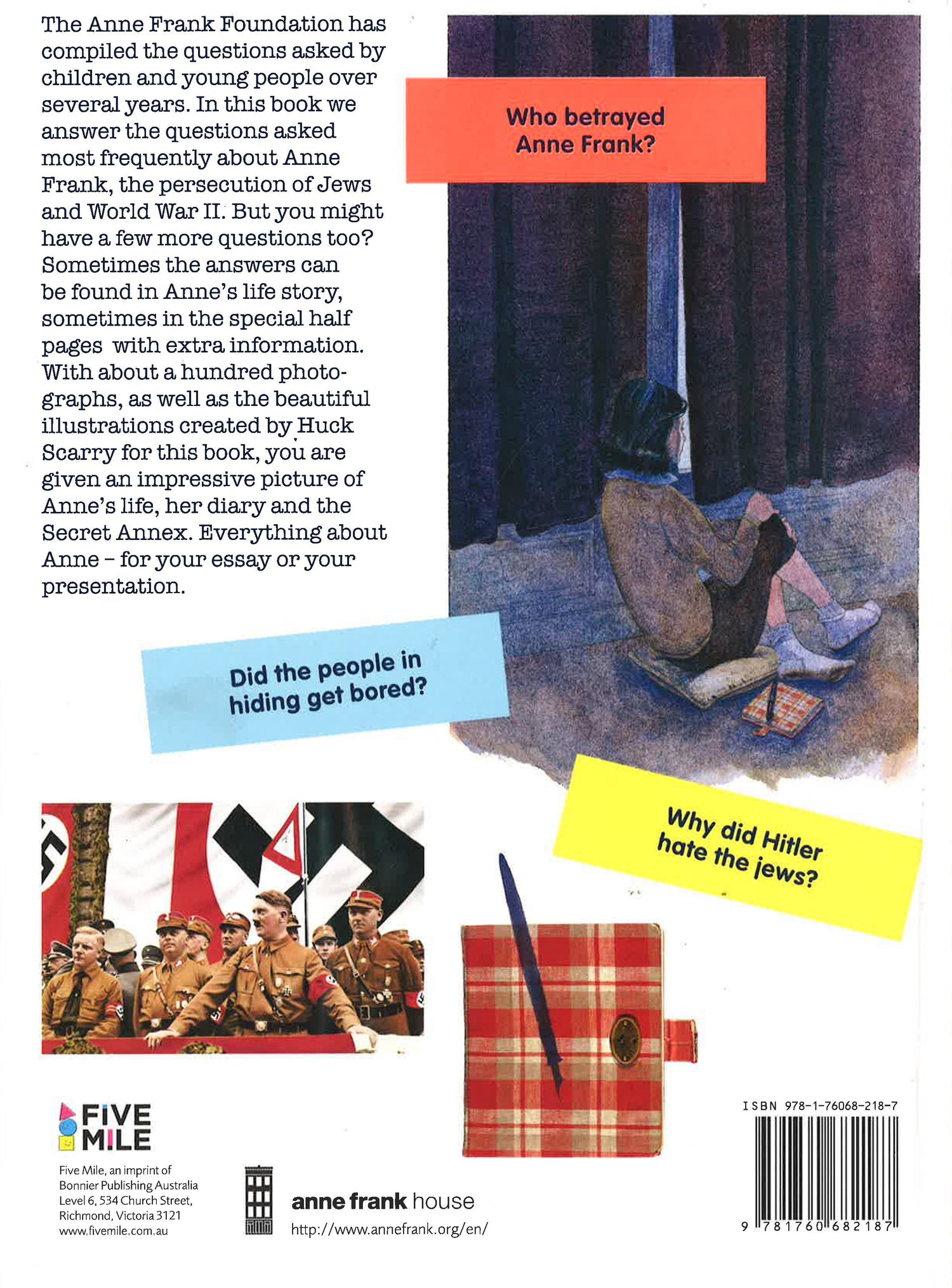In this book, the Anne Frank Foundation has answered the questions asked most frequently about Anne Frank, the persecution of Jews and World War II.The Anne Frank Foundation has compiled the questions asked by children and young people over several years. In this book we answer the questions asked most frequently about Anne Frank, the persecution of Jews and World War II.But you might have a few more questions too? Sometimes the answers can be found in Anne's life story, sometimes in the special half pages with extra information. With about a hundred photographs, as well as the beautiful illustrations created by Huck Scarry for this book, you are given an impressive picture of Anne's life, her diary and the Secret Annex. Everything about Anne for your essay or your presentation.