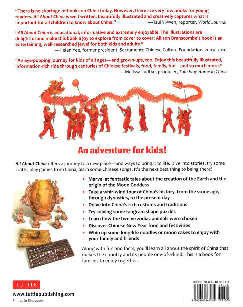 **Winner of Creative Child Magazine 2015 Preferred Choice Award****Winner of the Independent Publisher Book Award Silver Medal****Winner of Moonbeam Children's Book Awards 2015 Silver Medal** Take the whole family on a whirlwind tour of Chinese history and culture with this delightfully illustrated book that is packed with stories, activities and games. Travel from the stone age through the dynasties to the present day with songs and crafts for kids that will teach them about Chinese language and the Chinese way of life. All About China is the next best thing to being there! China is the world's largest and most populated country boasting thousands of years of history, tradition and culture. In All About China, you'll: Discover the fantastic Chinese tales about the creation of the earth and the origin of the Moon GoddessDelve into China's multifaceted cultural heritage, visit breathtaking places and learn Chinese folk songsTake a crack at solving a tangram shape puzzleLearn about the twelve Chinese zodiac animalsTry your hand at making a traditional brush painting of a panda, bamboo and other subjectsAll About China is an exciting and captivating introduction to the country, featuring page after page of colorful illustrations, compelling stories, surprising facts, cultural insights, engaging activities and much more. Young readers will embark on a fascinating journey through the many faces of this country, meeting its people and examining its landscape, culture and historical tapestry.
