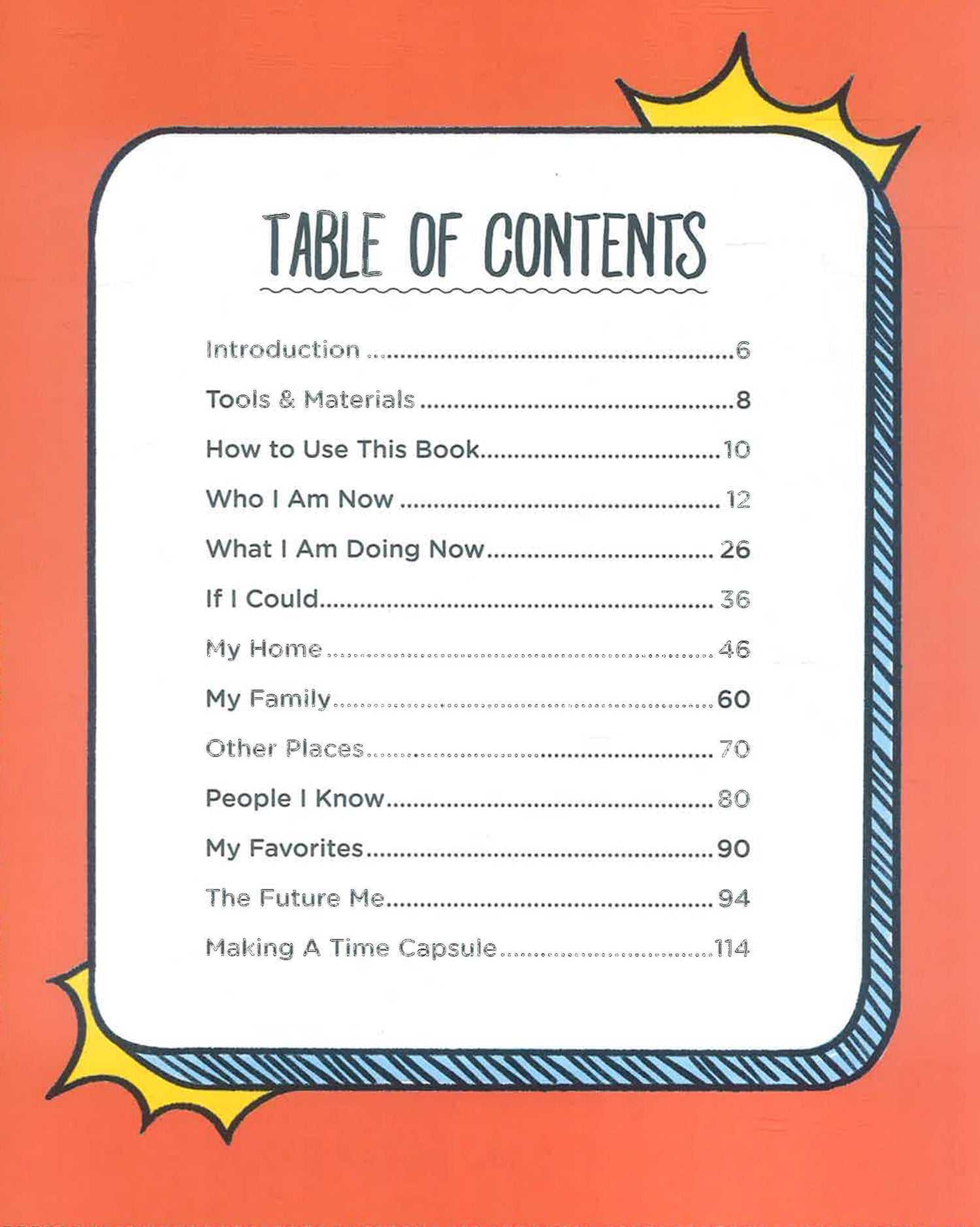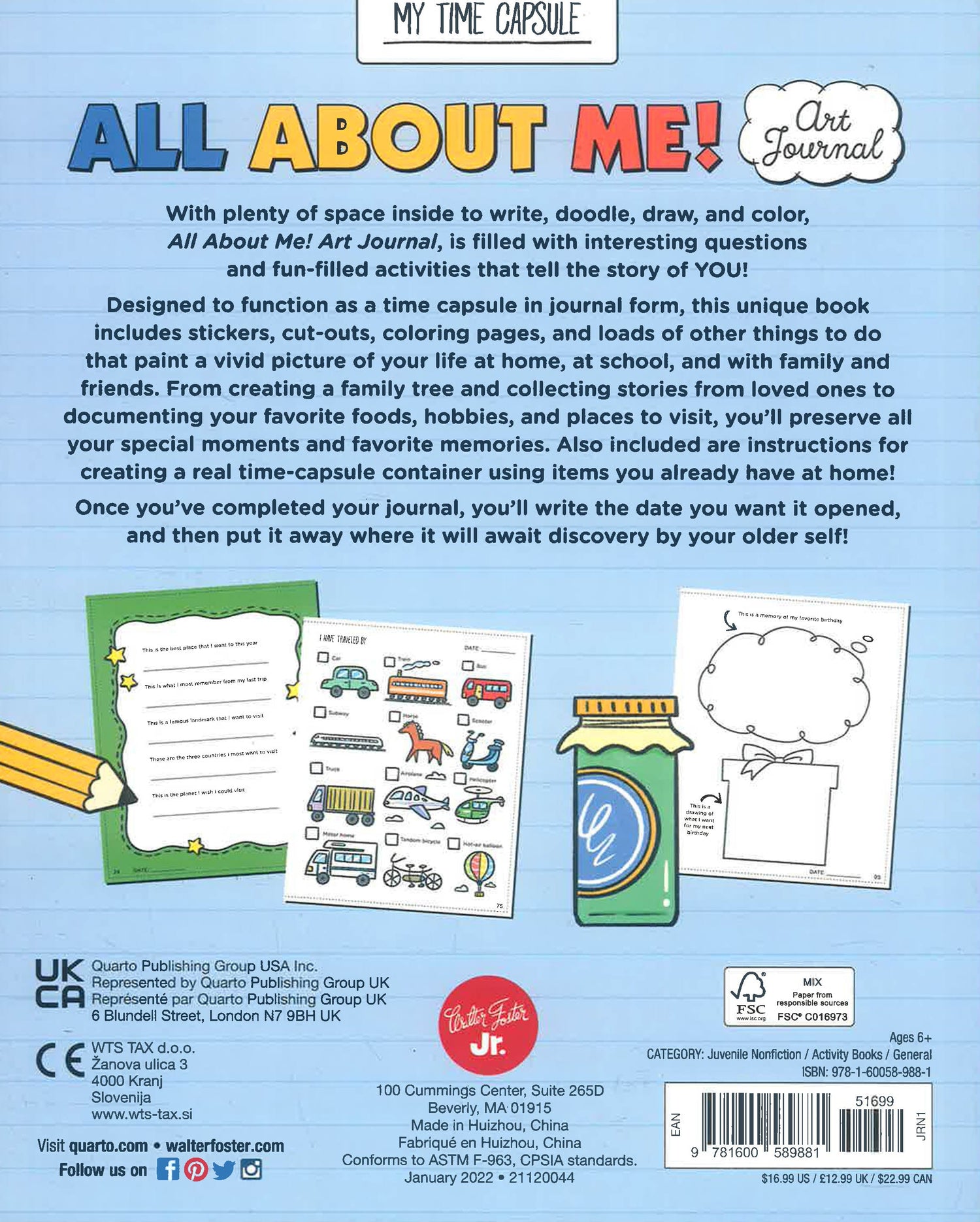 Thought-provoking prompts, space to draw and write on every page, cut-outs, and a bonus sticker sheet drive creativity and engagement in the moment, as well as record things about everyday life that a child may otherwise forget. Each prompt is dated, so the book can be completed all at once or over a longer period of time, and in no particular order. Additionally, interactive activities demonstrate how to create a time capsule related to the art and activities completed in the journal and then hide it away for re-discovery years later.