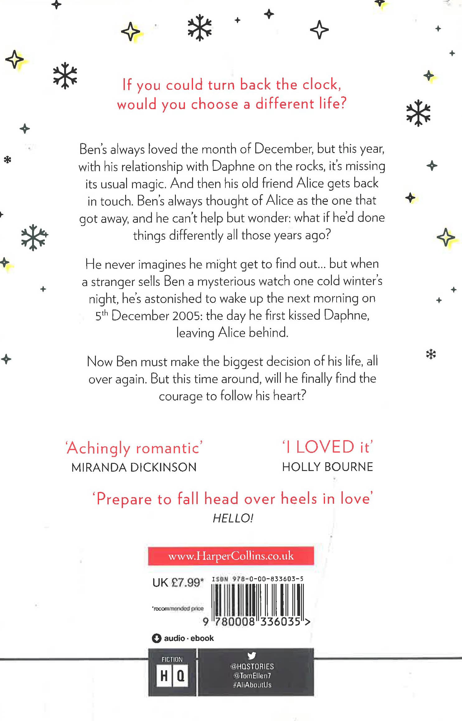 Two choices. One destiny. A love story you'll never forget... December 2005. On a cold winter's night, nineteen-year-old Ben is having the time of his life at university. He's about to fall in love for the very first time...but will it be with new girl Daphne, or his best mate Alice? December 2020. Life hasn't quite turned out how Ben had planned and he's stuck in a rut. He can't help but think back to that fateful night fifteen years earlier, and wonder what might have been... He never imagines he will get to find out - but when Ben is gifted with a second chance to make the biggest decision of his life, will he finally find the courage to follow his heart? A magical, heartwarming romance and reimagining of A Christmas Carol brimming with feeling and hope. The perfect read for fans of Sophie Cousens, Josie Silver and David Nicholls to curl up with this autumn. ----------------------------- Your favourite authors have fallen in love with All About Us 'Absolutely GORGEOUS. Achingly romantic, I loved every page' MIRANDA DICKINSON 'Uplifting, funny and magical' ADELE PARKS, Platinum 'Full of hope...it tugged at ALL of my heartstrings and I loved it to bits' CRESSIDA MCLAUGHLIN 'A heartwarming story of "what if"' LAURA JANE WILLIAMS 'Magical and beautiful' JOSIE SILVER 'All of the feels. Gorgeous!' CLARE POOLEY 'A Christmas Carol meets Love Actually. I LOVED it' HOLLY BOURNE 'Romantic and gloriously life-affirming' RACHEL MARKS