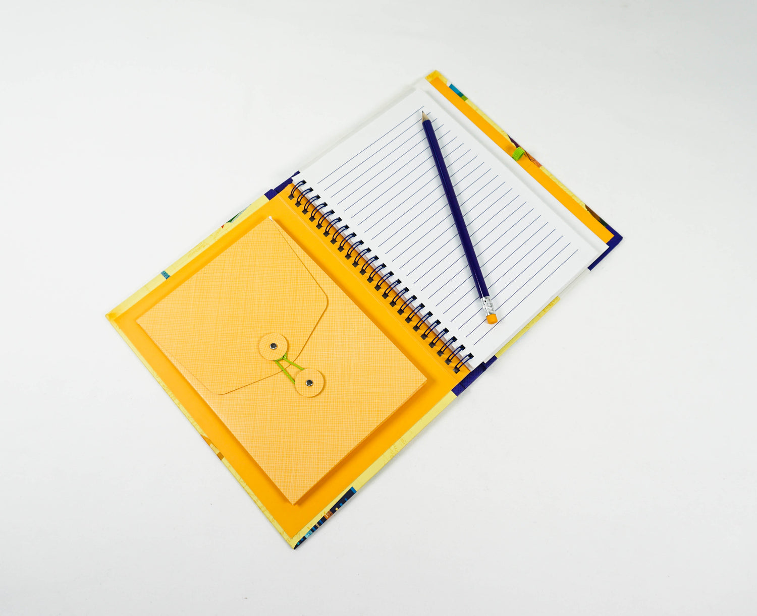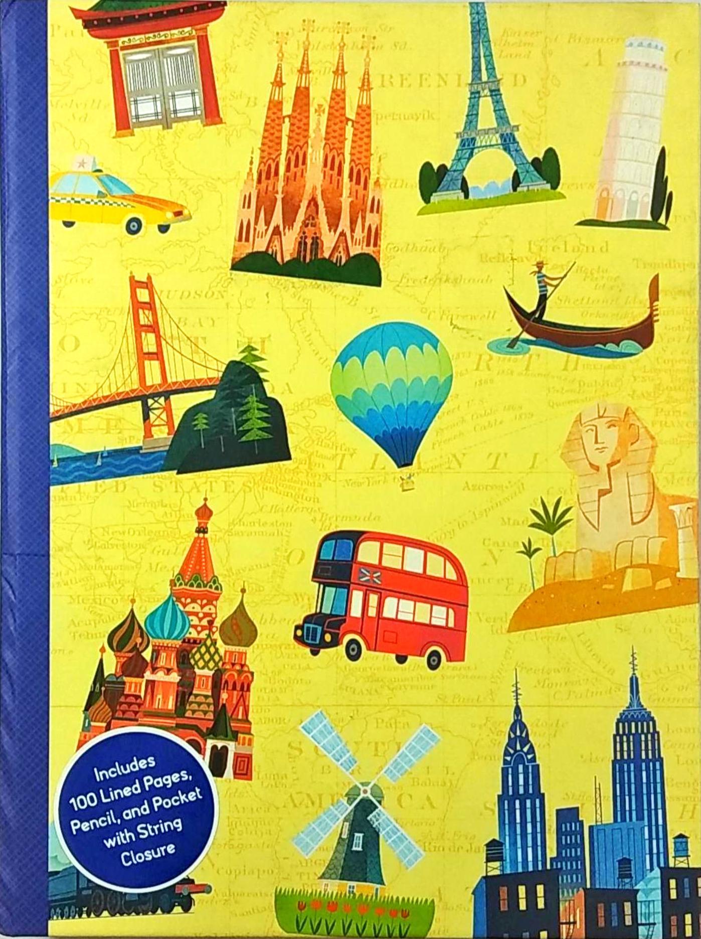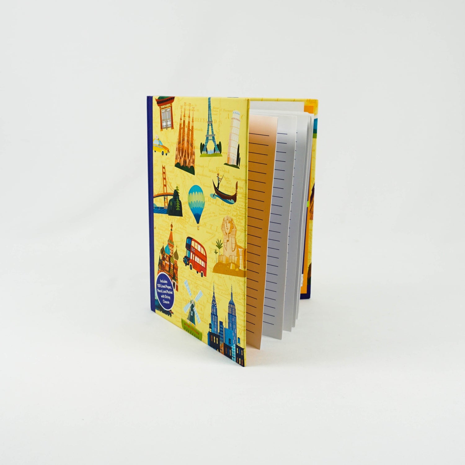 Where will you go today? Record your adventures in this deluxe journal, decorated with scenes from around the world. With 100 lined pages, a color-coordinated pre-sharpened pencil, and a pocket with a secure string closure for keepsakes, the All Around the World Deluxe Journal is packed with essentials for a traveler on the go! Journal lies flat when open thanks to the colorful wire binding. Perfect to chronicle your adventures at home or abroad!