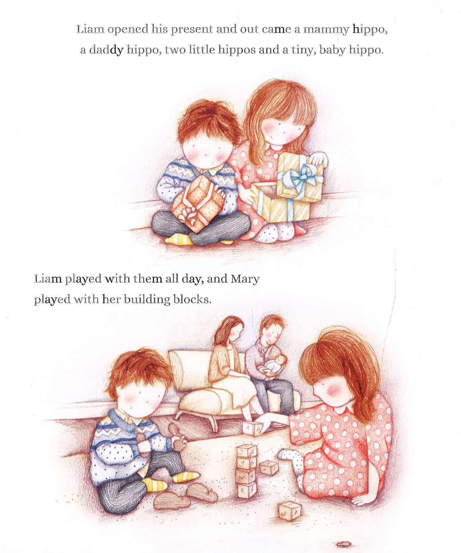 The perfect picture book for any anxious young child waiting for their new brother or sister to arrive. When Liam and Mary's mum and dad bring their new baby brother home from the hospital they also bring some presents: for Mary, some building blocks and for Liam, a family of hippos. But the baby hippo of the family keeps going missing. First he gets eaten by a crocodile, then trampled by an elephant until finally the littlest hippo gets stuck after taking a swim in the toilet. This is a warm, sensitive and reassuring book about the arrival of a new baby in the family, written by an expert in the field of child development.