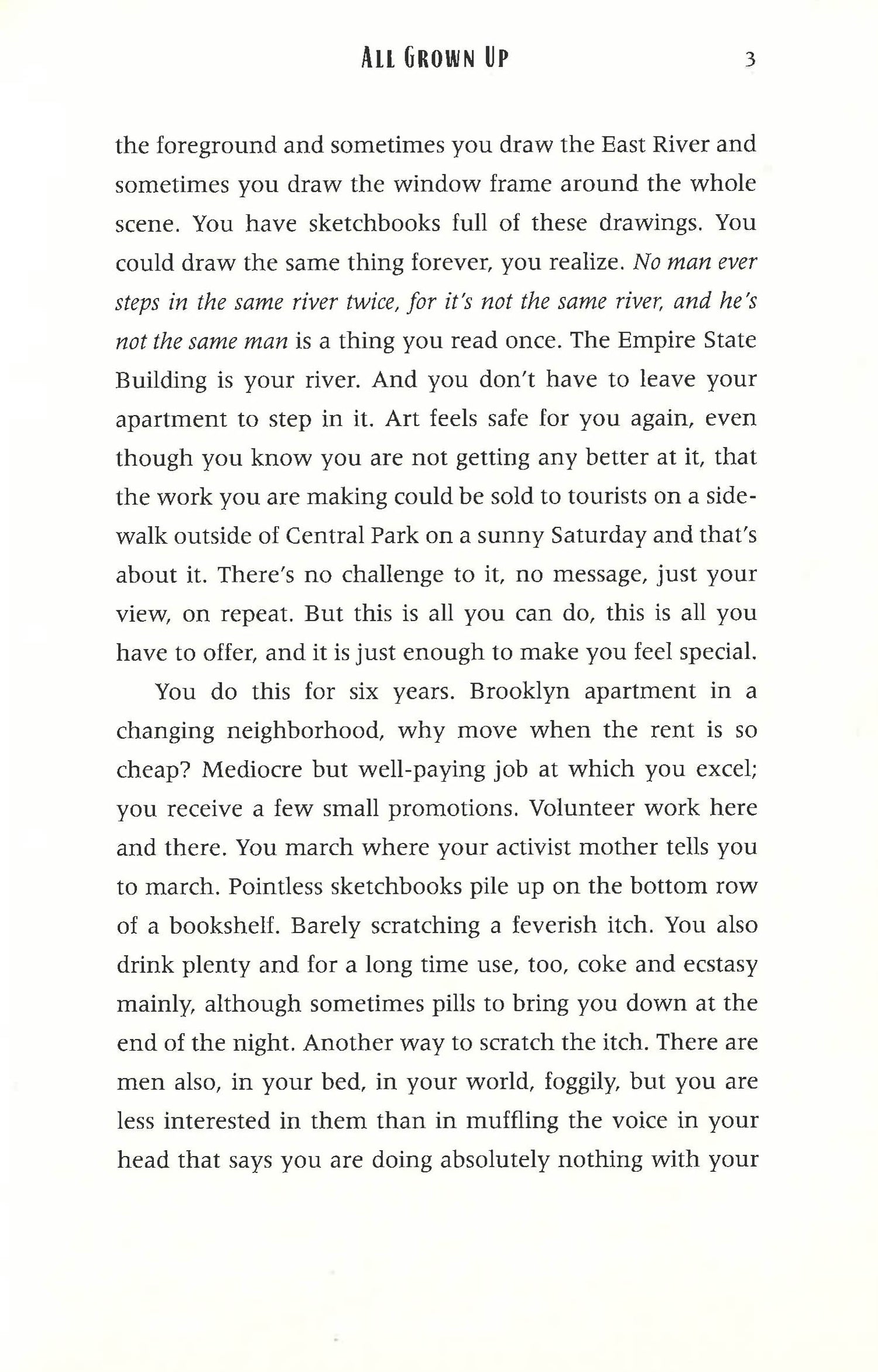 From the New York Times best-selling author of The Middlesteins comes a wickedly funny novel about a thirty-nine-year-old single, childfree woman who defies convention as she seeks connection. Who is Andrea Bern? When her therapist asks the question, Andrea knows the right things to say: she's a designer, a friend, a daughter, a sister. But it's what she leaves unsaid--she's alone, a drinker, a former artist, a shrieker in bed, captain of the sinking ship that is her flesh--that feels the most true. Everyone around her seems to have an entirely different idea of what it means to be an adult: her best friend, Indigo, is getting married; her brother--who miraculously seems unscathed by their shared tumultuous childhood--and sister-in-law are having a hoped-for baby; and her friend Matthew continues to wholly devote himself to making dark paintings at the cost of being flat broke. But when Andrea's niece finally arrives, born with a heartbreaking ailment, the Bern family is forced to reexamine what really matters. Will this drive them together or tear them apart? Told in gut-wrenchingly honest, mordantly comic vignettes, All Grown Up is a breathtaking display of Jami Attenberg's power as a storyteller, a whip-smart examination of one woman's life, lived entirely on her own terms.