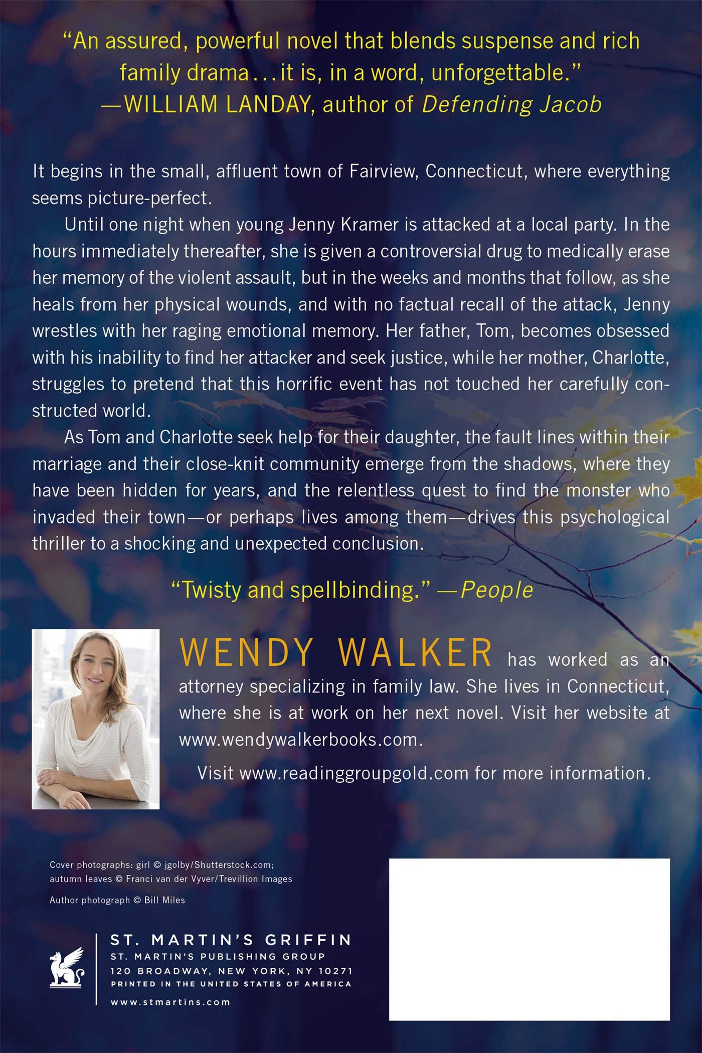 Jenny's father, Tom, becomes obsessed in his quest for justice though her mother, Charlotte, struggles to pretend this horrific event did not touch her carefully-constructed world. Soon the fault lines within their marriage and their close-knit community emerge from the shadows, where they have been hidden for years. Meanwhile, Jenny remains haunted by what she can and cannot remember. . .and her attacker is still on the loose.