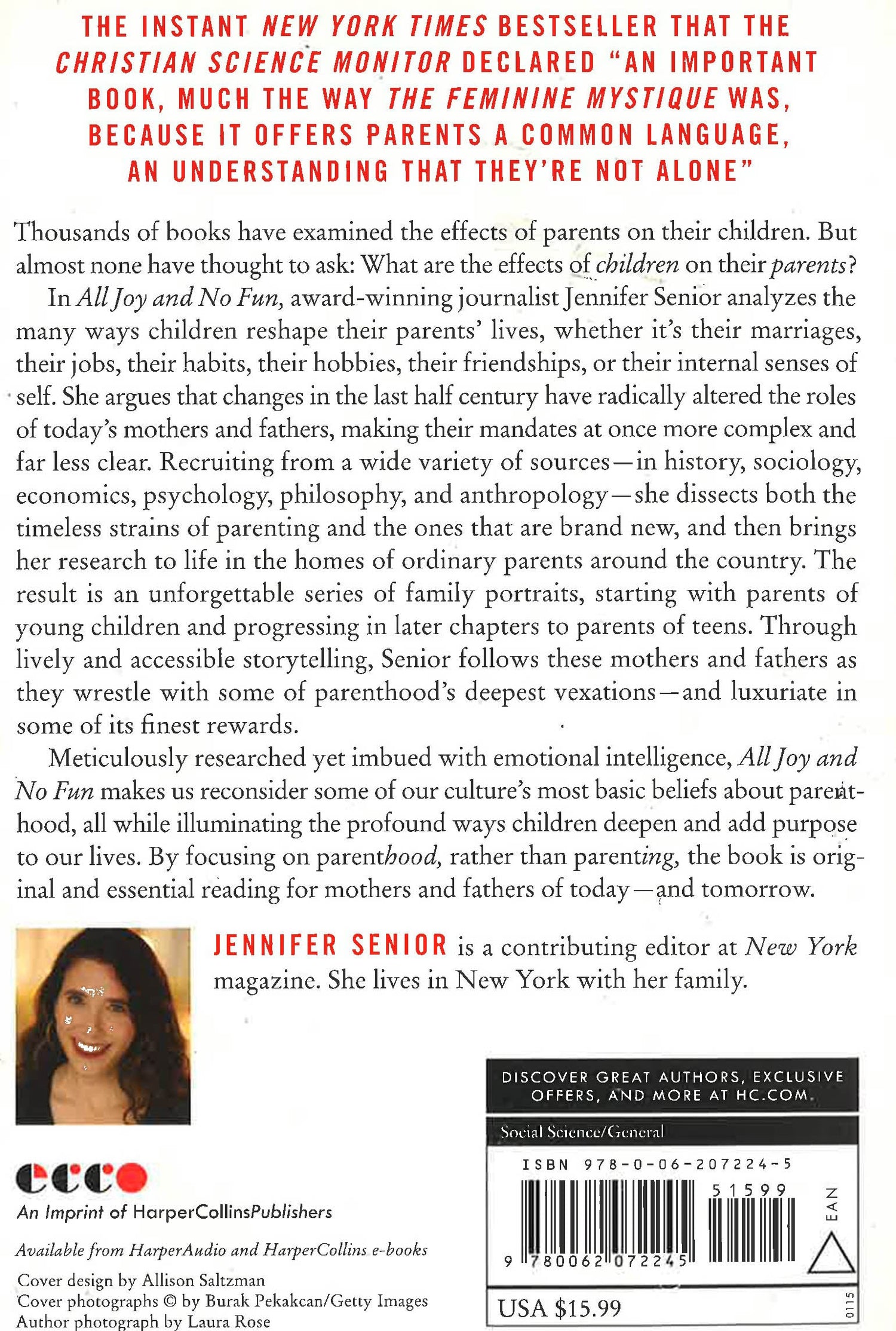 The instant New York Times bestseller that the Christian Science Monitor declared an important book, much the way The Feminine Mystique was, because it offers parents a common language, an understanding that they're not alone Thousands of books have examined the effects of parents on their children. But almost none have thought to ask: What are the effects of children on their parents? In All Joy and No Fun, award-winning journalist Jennifer Senior analyzes the many ways children reshape their parents' lives, whether it's their marriages, their jobs, their habits, their hobbies, their friendships, or their internal senses of self. She argues that changes in the last half century have radically altered the roles of today's mothers and fathers, making their mandates at once more complex and far less clear. Recruiting from a wide variety of sources--in history, sociology, economics, psychology, philosophy, and anthropology--she dissects both the timeless strains of parenting and the ones that are brand new, and then brings her research to life in the homes of ordinary parents around the country. The result is an unforgettable series of family portraits, starting with parents of young children and progressing in later chapters to parents of teens. Through lively and accessible storytelling, Senior follows these mothers and fathers as they wrestle with some of parenthood's deepest vexations--and luxuriate in some of its finest rewards. Meticulously researched yet imbued with emotional intelligence, All Joy and No Fun makes us reconsider some of our culture's most basic beliefs about parenthood, all while illuminating the profound ways children deepen and add purpose to our lives. By focusing on parenthood, rather than parenting, the book is original and essential reading for mothers and fathers of today--and tomorrow.