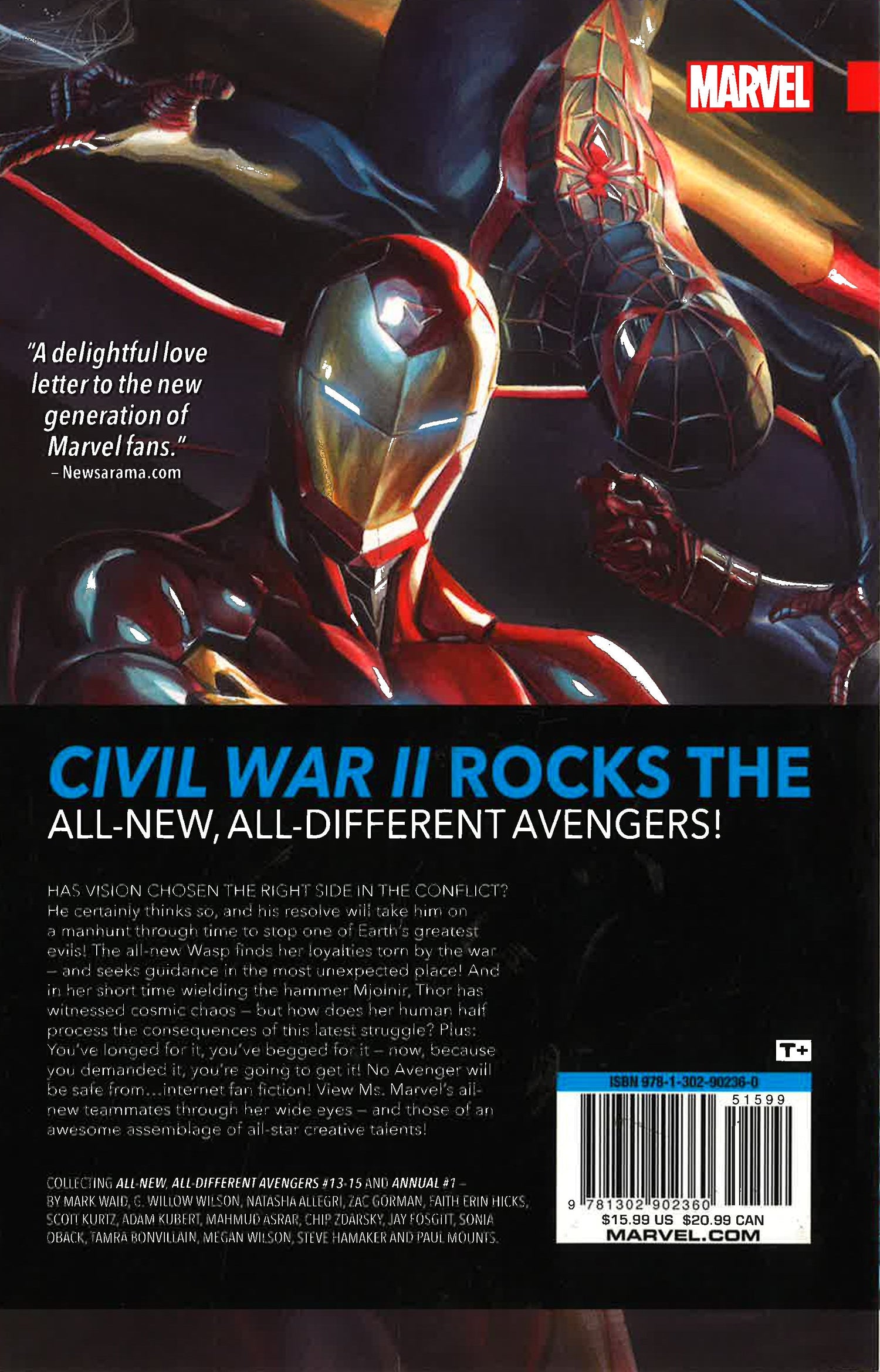 CIVIL WAR II rocks the All-New, All-Different Avengers! Has Vision chosen the right side in this confl ict? He certainly thinks so, and his resolve will take him on a manhunt through time in order to stop one of Earth's greatest evils! Plus, you've dreamed of it, you've longed for it, you've begged for it - now, because you demanded it, you're going to get it! No Avenger will be safe from...the fan fiction of Kamala Khan! View Ms. Marvel's all-new teammates through her wide eyes - and those of an awesome assemblage of all-star creative talents! COLLECTING: ALL-NEW, ALL-DIFFERENT AVENGERS 13-15, ANNUAL