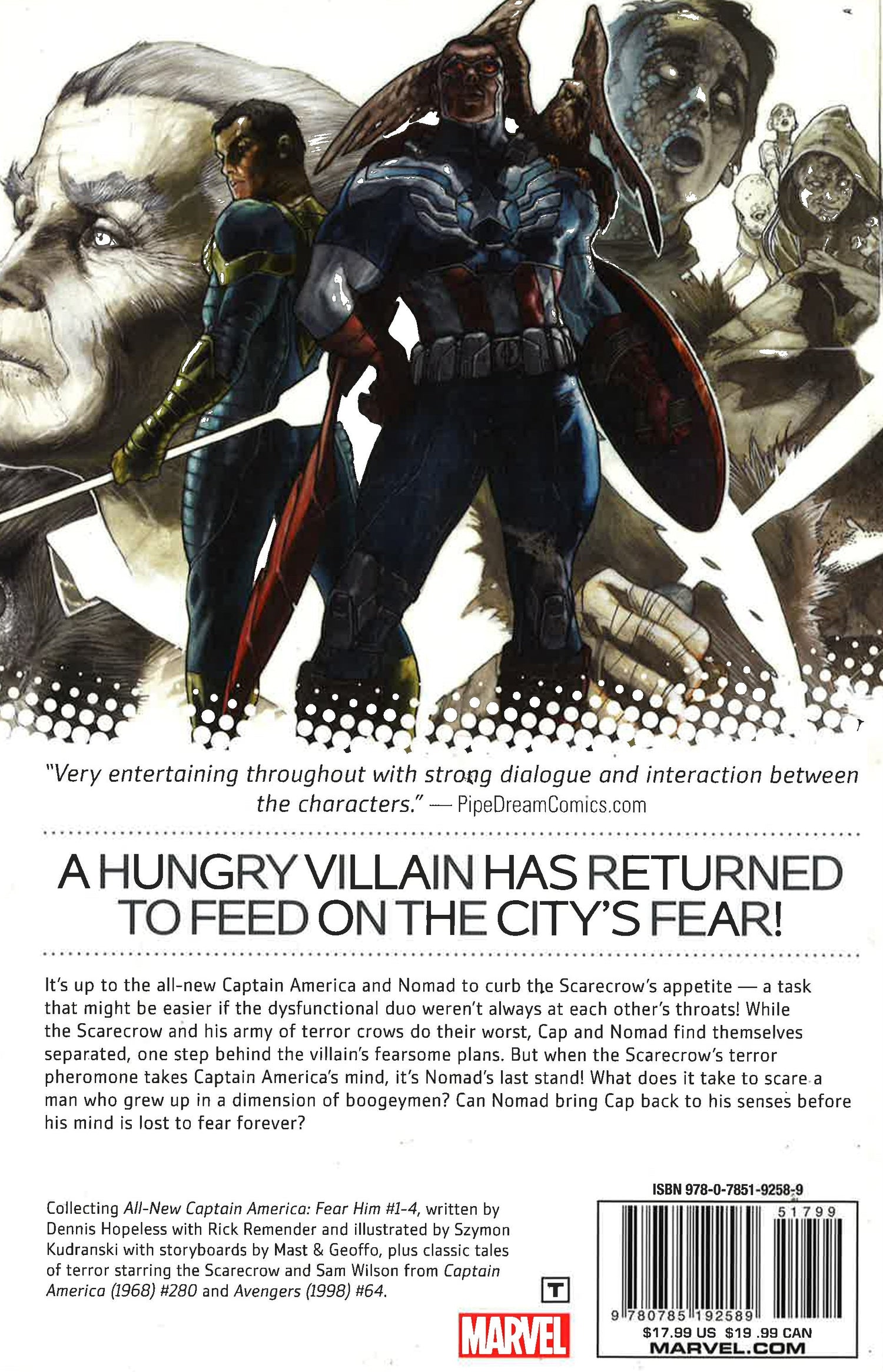 A hungry villain has returned to feed on the city's fear! It's up to the All-New Captain America and Nomad to curb the Scarecrow's appetite...a task that might be easier if the dysfunctional duo weren't always at each other's throats! While the Scarecrow and his army of terror crows do their worst, Cap and Nomad find themselves separated, one step behind the villain's fearsome plans. But when the Scarecrow's terror pheromone takes Captain America's mind, it's Nomad's last stand! What does it take to scare a man who grew up in a dimension of boogeymen? And can he bring Cap back to his senses before his mind is lost to fear forever? Plus: classic tales of terror starring the Scarecrow and Sam Wilson!