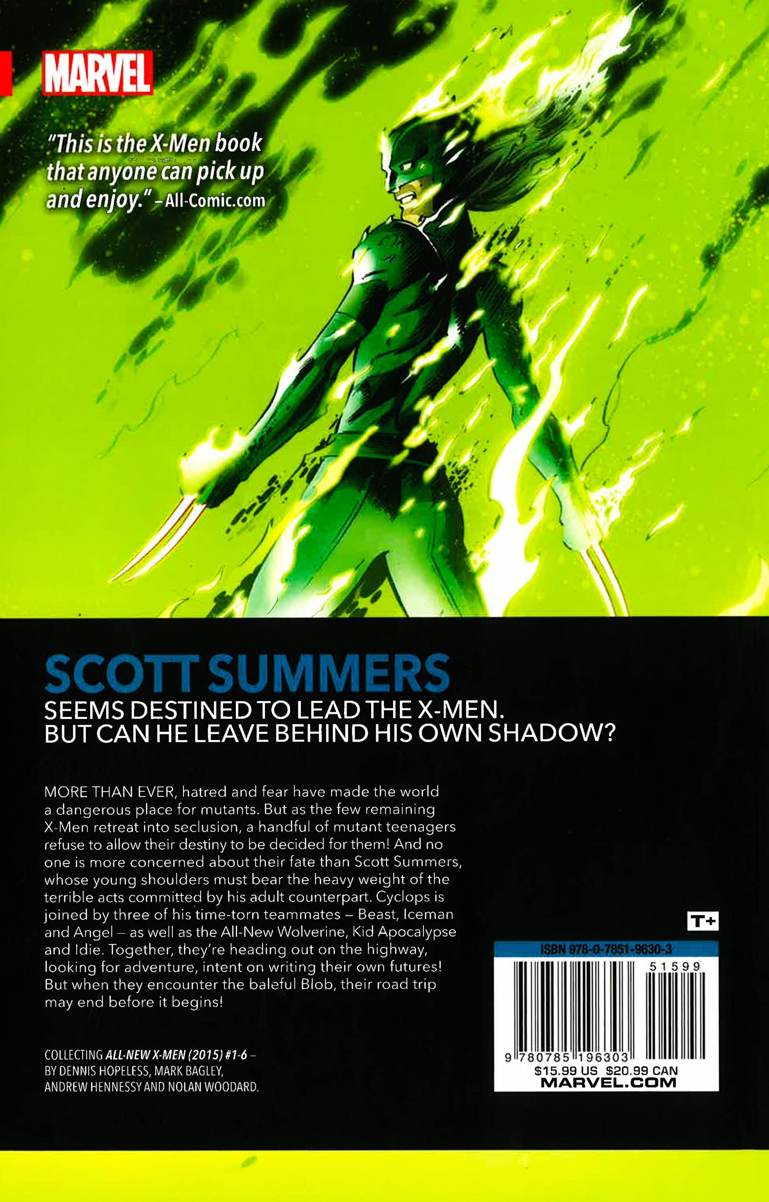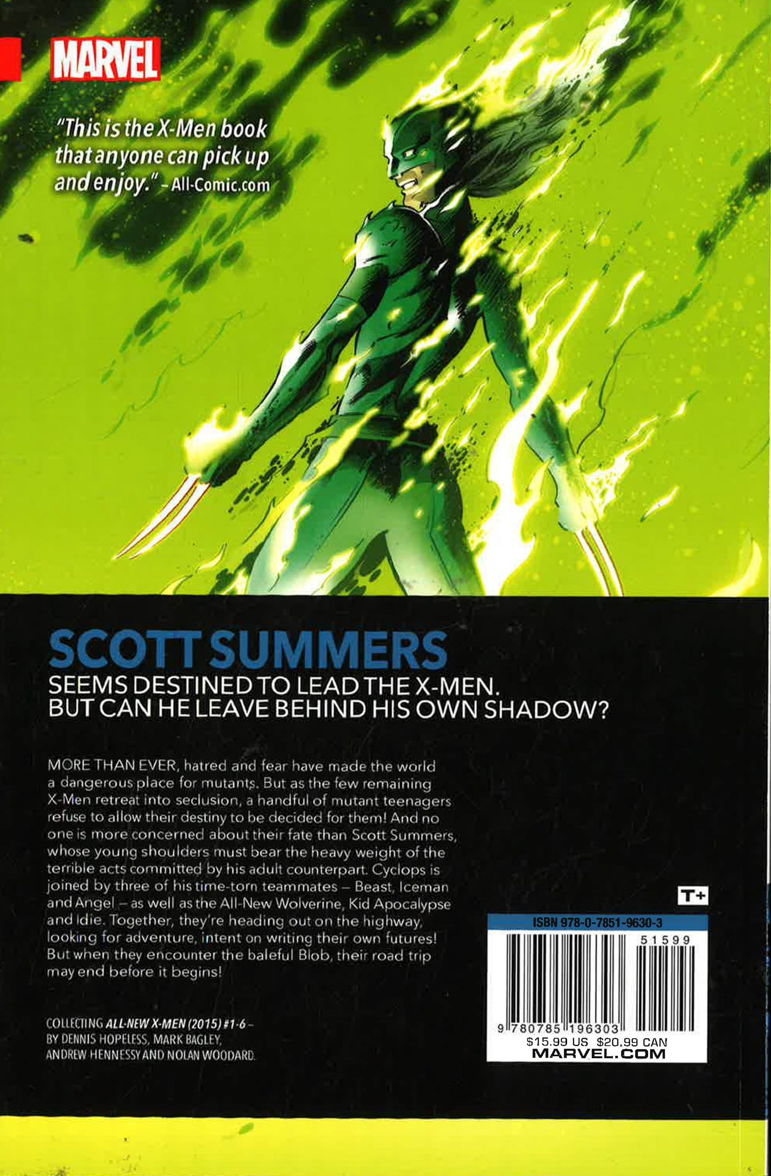More than ever, hatred and fear has made the world a dangerous place for mutants. But as the few remaining X-Men retreat into seclusion, a handful of mutant teenagers refuse to allow their destiny to be decided for them! And no one is more concerned about their fate than Scott Summers, whose young shoulders must bear the heavy weight of the terrible acts committed by his adult counterpart. Cyclops is joined by three of his timetorn teammates - Beast, Iceman and Angel - as well as the All-New Wolverine, Kid Apocalypse and Oya. Together, they're heading out on the highway, looking for adventure, intent on writing their own futures! But when they encounter the baleful Blob, their road trip may end before it begins... COLLECTING: ALL-NEW X-MEN 1-6