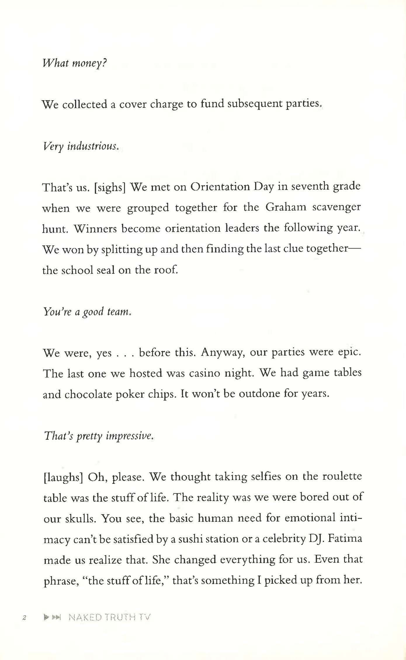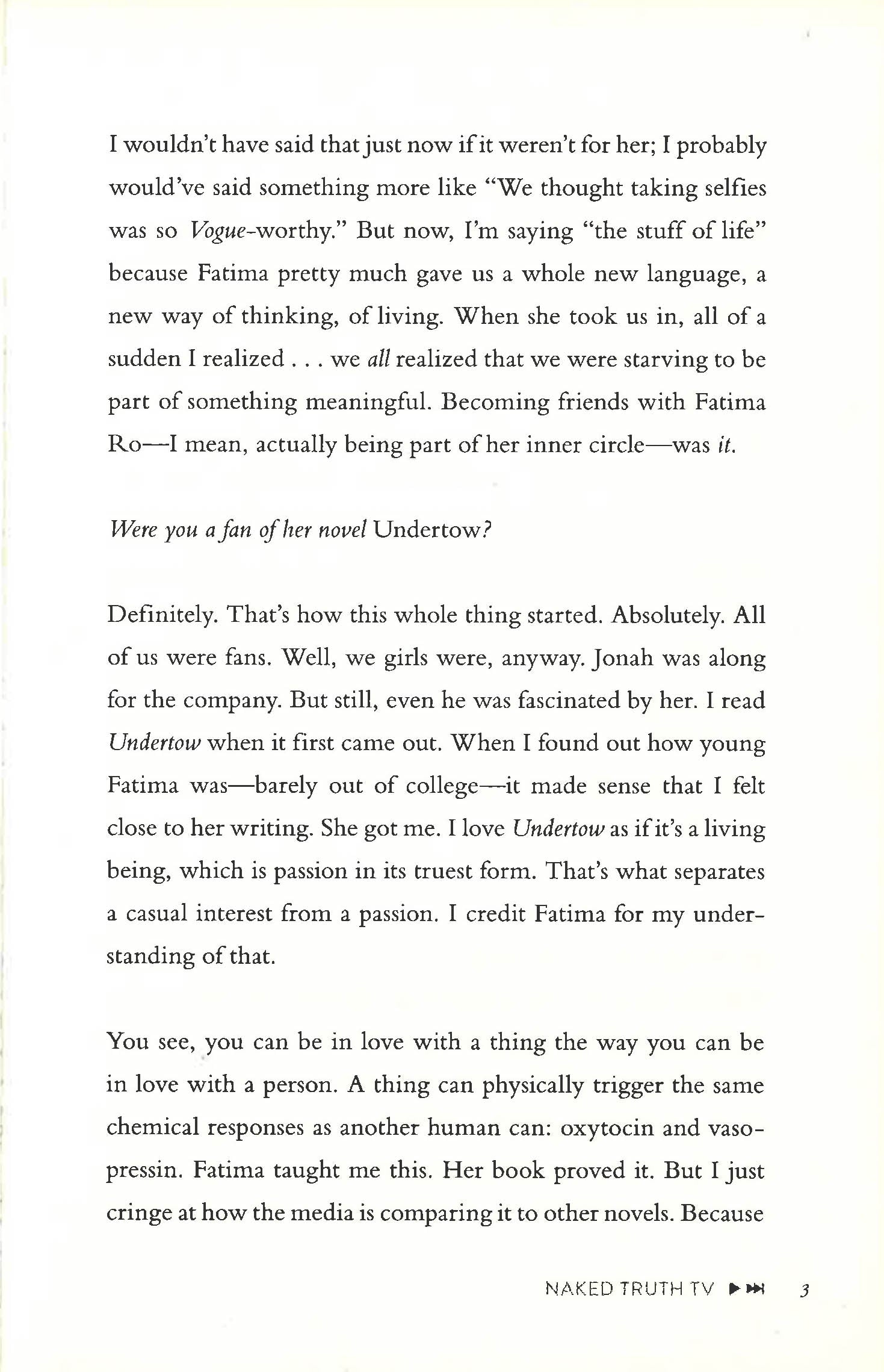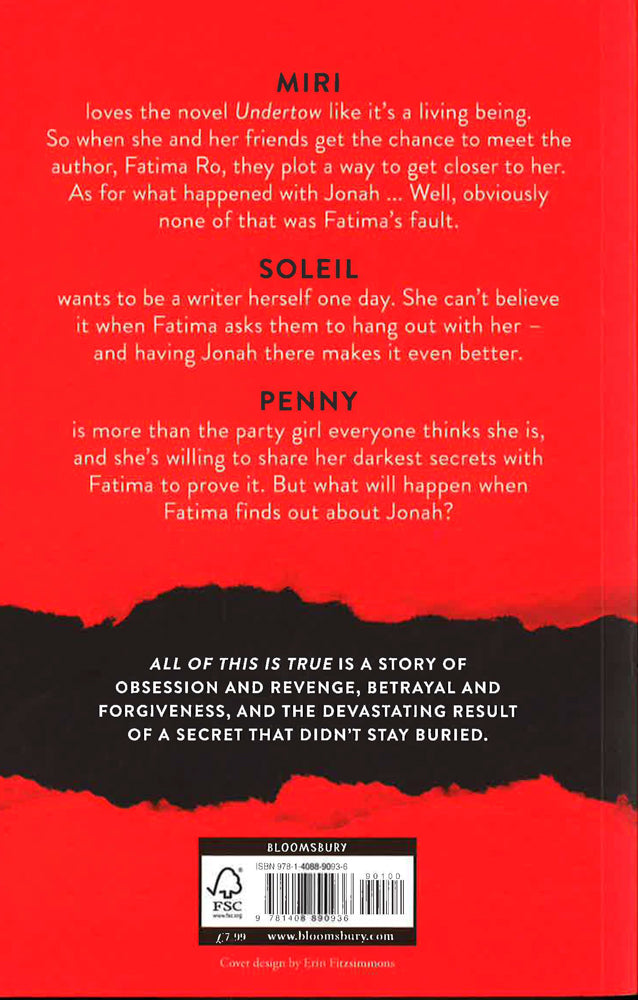 MIRI loves the novel Undertow like it's a living being. So when she and her friends get the chance to meet the author, Fatima Ro, they plot a way to get closer to her. As for what happened with Jonah ... Well, obviously none of that was Fatima's fault. SOLEIL wants to be a writer herself one day. She can't believe it when Fatima asks them to hang out with her - and having Jonah there makes it even better. PENNY is more than the party girl everyone thinks she is, and she's willing to share her darkest secrets with Fatima to prove it. But what will happen when Fatima finds out about Jonah? All of This Is True is a story of obsession and revenge, betrayal and forgiveness, and the devastating result of a secret that didn't stay buried. MIRI loves the novel Undertow like it's a living being. So when she and her friends get the chance to meet the author, Fatima Ro, they plot a way to get closer to her. As for what happened with Jonah ... Well, obviously none of that was Fatima's fault. SOLEIL wants to be a writer herself one day. She can't believe it when Fatima asks them to hang out with her - and having Jonah there makes it even better. PENNY is more than the party girl everyone thinks she is, and she's willing to share her darkest secrets with Fatima to prove it. But what will happen when Fatima finds out about Jonah? All of This Is True is a story of obsession and revenge, betrayal and forgiveness, and the devastating result of a secret that didn't stay buried.