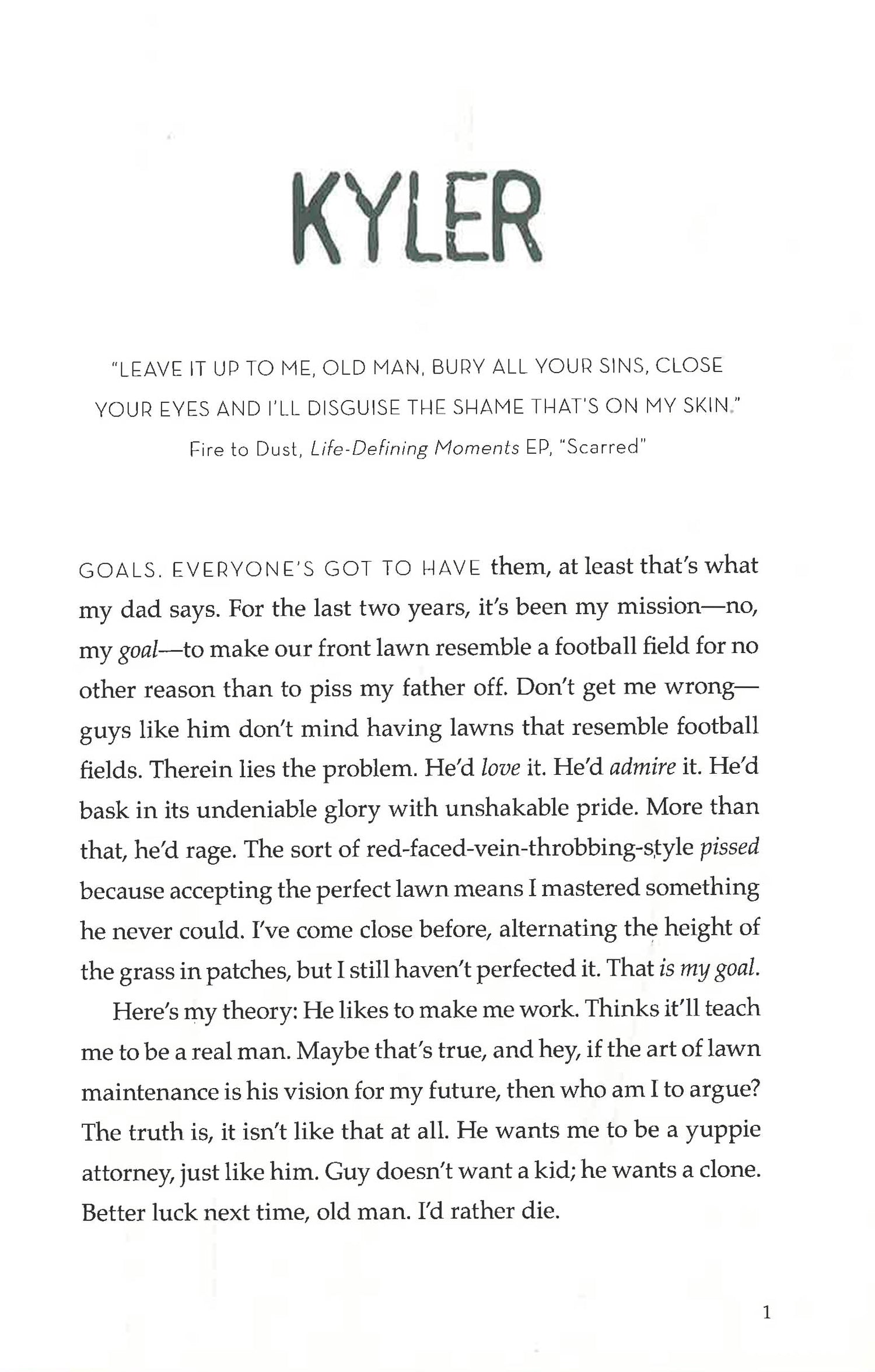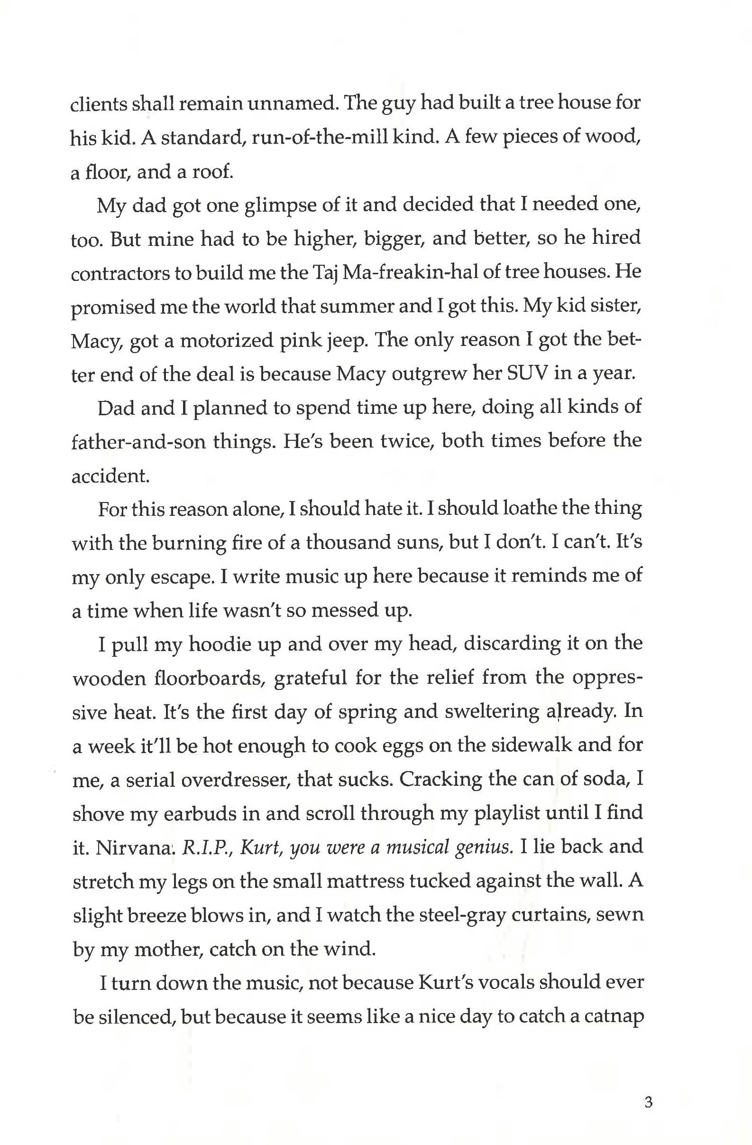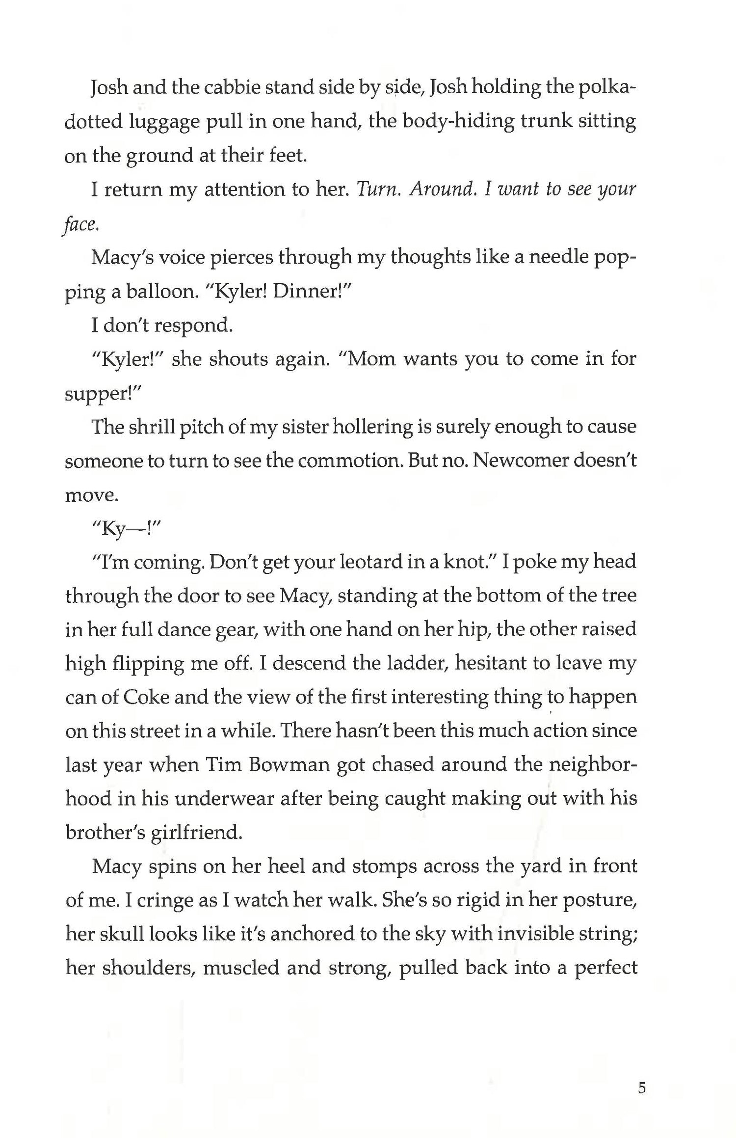 Lennon Davis doesn't believe in much, but she does believe in the security of the number five. If she flicks the bedroom light switch five times, maybe her new LA school won't suck. But that doesn't feel right, so she flicks the switch again. And again. Ten more flicks of the switch and maybe her new stepfamily will accept her. Twenty-five more flicks and maybe she won't cause any more of her loved ones to die. Fifty more and then she can finally go to sleep. Kyler Benton witnesses this pattern of lights from the safety of his tree house in the yard next door. It is only there, hidden from the unwanted stares of his peers, that Kyler can fill his notebooks with lyrics that reveal the true scars of the boy behind the oversize hoodies and caustic humor. But Kyler finds that descriptions of blond hair, sad eyes, and tapping fingers are beginning to fill the pages of his notebooks. Lennon, the lonely girl next door his father has warned him about, infiltrates his mind. Even though he has enough to deal with without Lennon's rumored tragic past in his life, Kyler can't help but want to know the truth about his new muse.