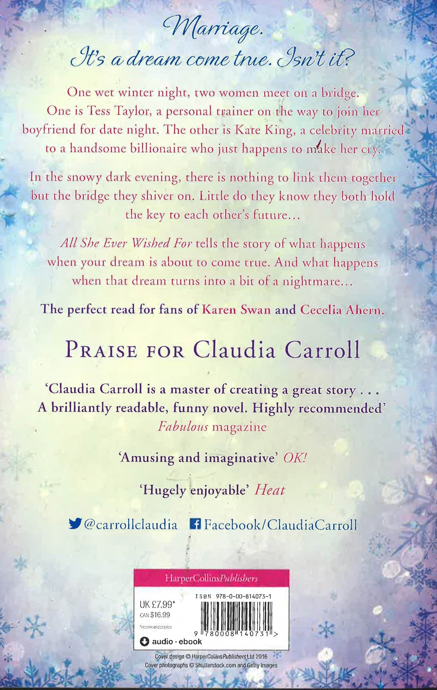 A gorgeous story of chance meetings and unexpected friendships. Because sometimes what you've always wished for isn't necessarily what life has in store . . .Marriage. It's a dream come true. Isn't it?One wet winter night, two women meet on a bridge. One is Tess Taylor, a personal trainer on the way to meet her boyfriend for date night. The other is Kate King, a celebrity married to a handsome billionaire who just happens to make her cry. In the cold dark evening, there is nothing to link them together but the bridge they shiver on. Little do they know they'll both hold the key to each other's future marriage...All She Ever Wished For tells the story of what happens when your dream is about to come true. And what happens when that dream turns into a bit of a nightmare...Claudia Carroll brings you a Christmas gift filled with second chances, fateful encounters and a lesson in what true love means.