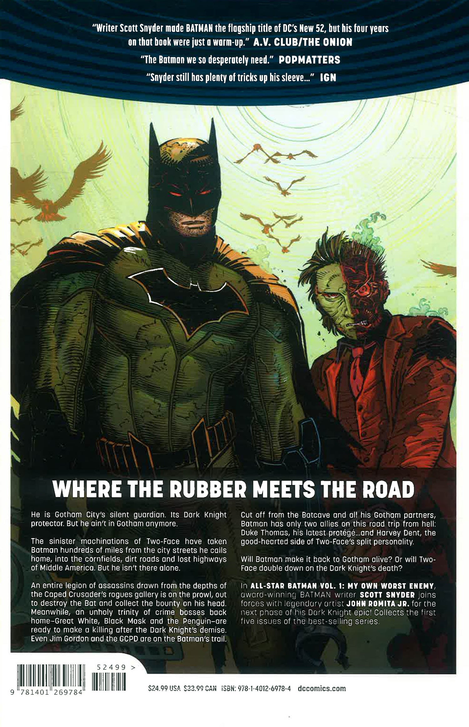 A part of DC Rebirth! The #1 New York Times best-selling author of BATMAN returns to the Dark Knight in ALL-STAR BATMAN VOL. 1! But he's not alone. Critically acclaimed, legendary illustrator John Romita Jr. joins him on this epic new series! In this new graphic novel, Batman finds himself trying to help old friend Harvey Dent...now known as the villainous Two-Face! The Dark Knight accompanies his foe on a cross-country trip to fix his scarred face and hopefully end the Two-Face identity forever. But when the former Gotham City D.A. sets his plan into motion to free himself, what deadly secrets from the past will bubble to the surface? One of the biggest creative pairings in DC Comics history share their take on one of the greatest heroes ever in ALL-STAR BATMAN VOL. 1! Collects issues #1-5. Rebirth honors the richest history in comics, while continuing to look towards the future. These are the most innovative and modern stories featuring the world's greatest superheroes, told by some of the finest storytellers in the business. Honoring the past, protecting our present, and looking towards the future. This is the next chapter in the ongoing saga of the DC Universe. The legacy continues.