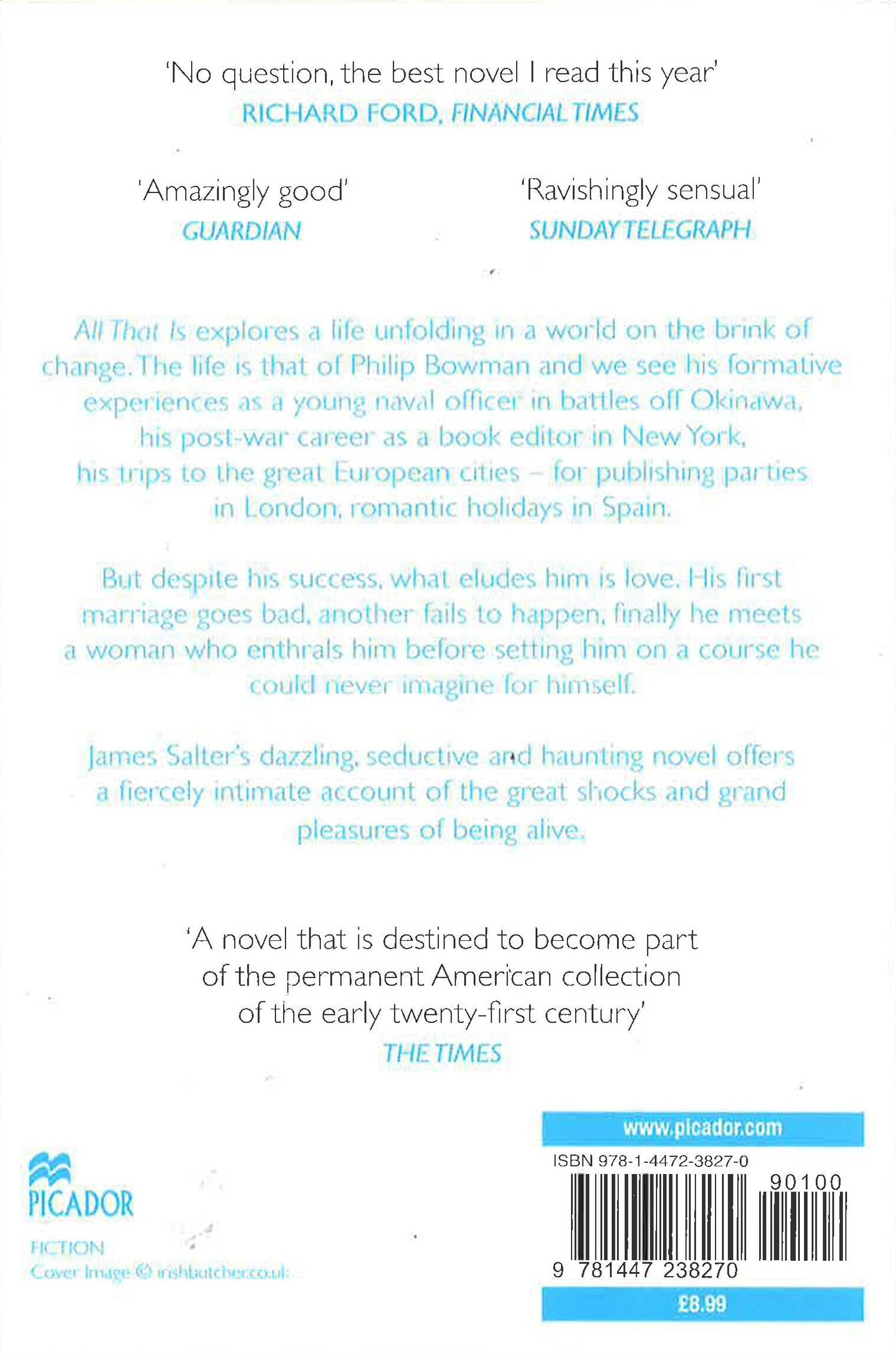 All That Is explores a life unfolding in a world on the brink of change. The life is that of Philip Bowman and we see his formative experiences as a young naval officer in battles off Okinawa, his post-war career as a book editor in New York, his trips to the great European cities - for publishing parties in London, romantic holidays in Paris. But despite his success, what eludes him is love. His first marriage goes bad, another fails to happen, finally he meets a woman who enthrals him before setting him on a course he could never imagine for himself. James Salter's dazzling, seductive and haunting novel offers a fiercely intimate account of the great shocks and grand pleasures of being alive.