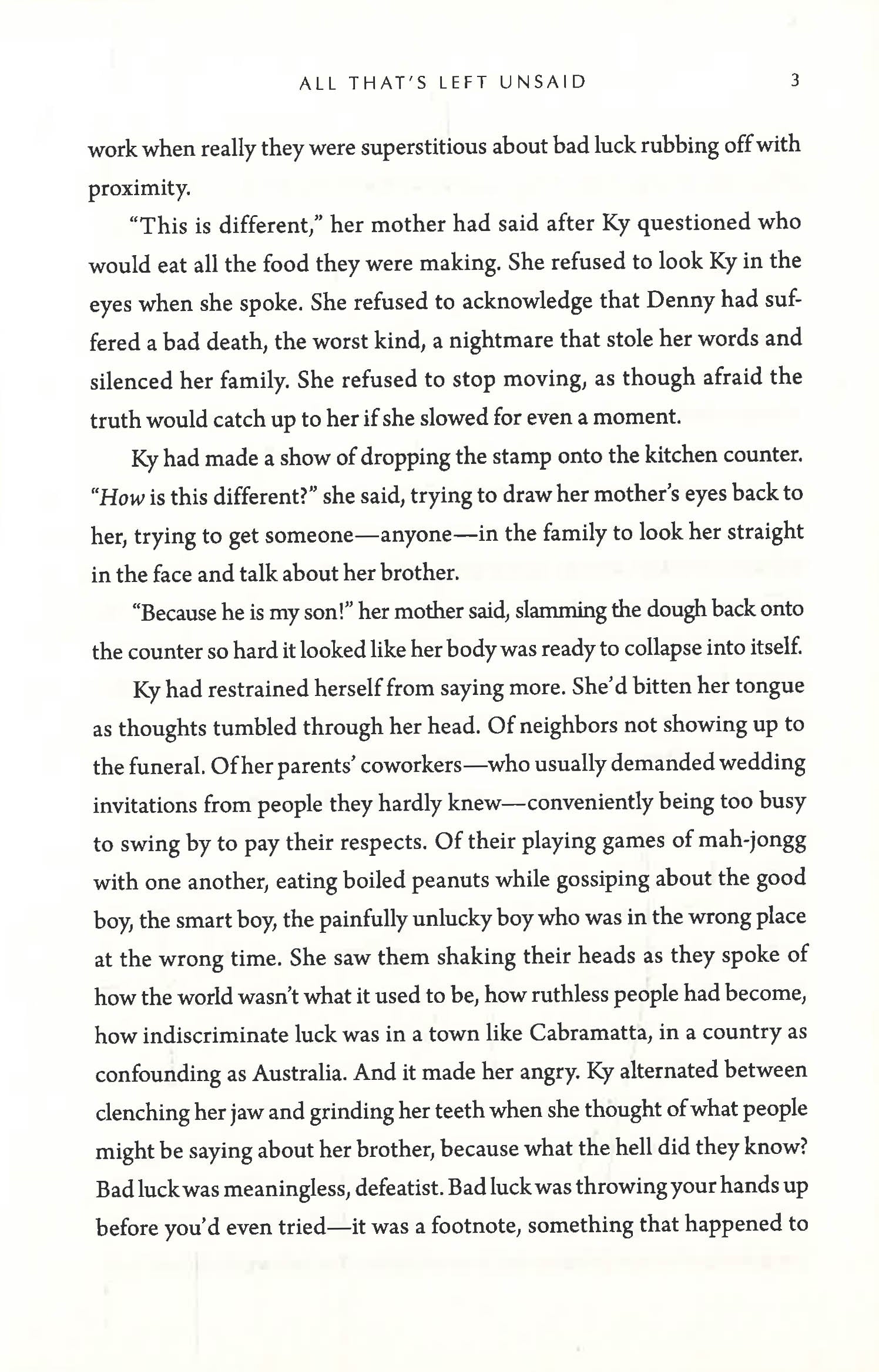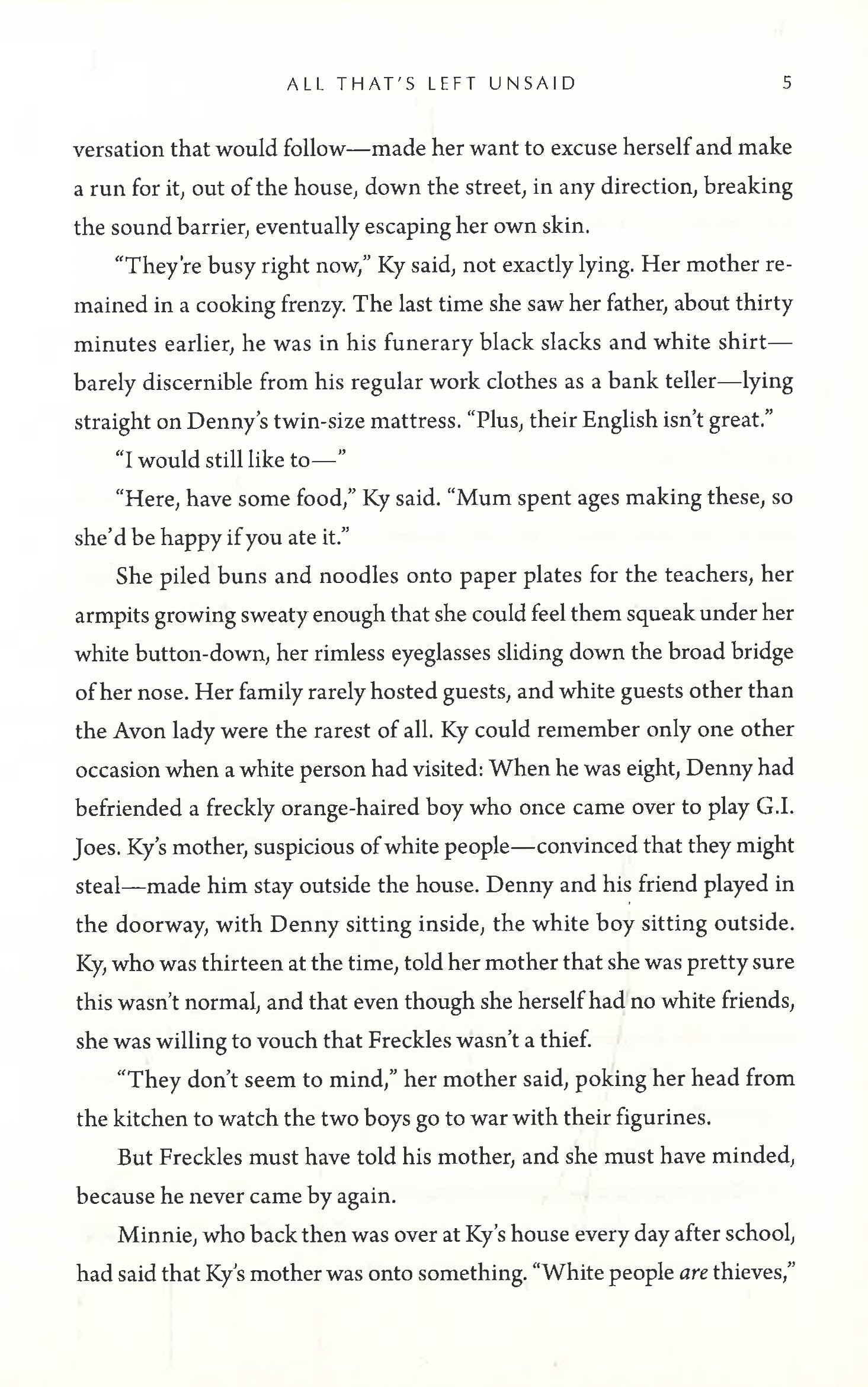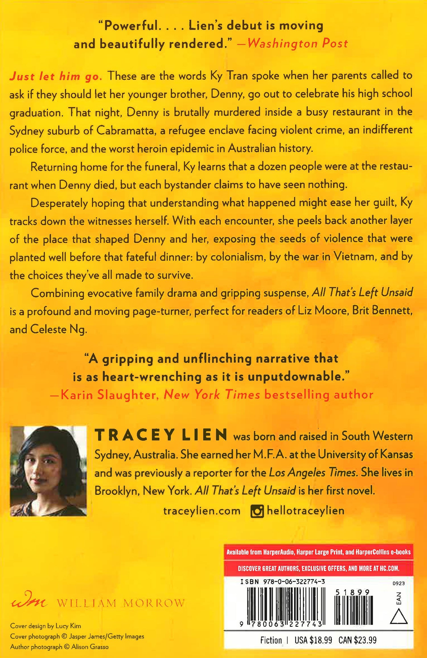 Alternating between Ky's voice and the perspectives of the witnesses, Tracey Lien's extraordinary debut is at once heart-pounding and heart-rending as it probes the intricate bonds of friendship, family, and community through an unforgettable cast of characters, all connected by a devastating crime. Combining evocative family drama and gripping suspense, All That's Left Unsaid is a profound and moving page turner, perfect for readers of Liz Moore, Brit Bennett, and Celeste Ng.