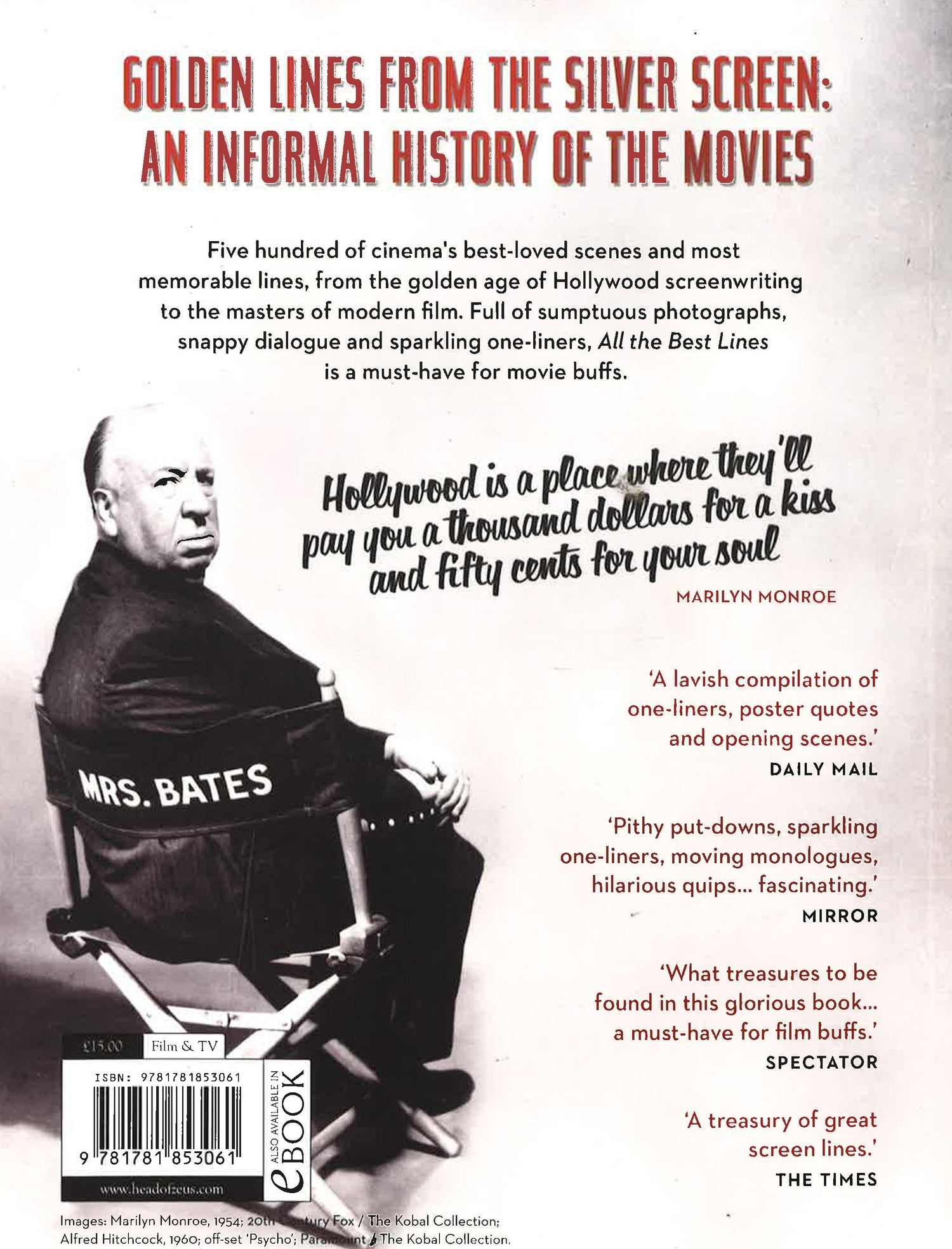 Pithy put-downs, hard-boiled snarlings, words of love and regret... All the Best Lines presents 500 memorable movie quotes, embracing both one-liners ('My name is Pussy Galore') and slices of snappy dialogue from pictures as diverse as When Harry Met Sally and Pulp Fiction. Arranged under such timeless themes as Dreams, Friends, Libido and Memories, the quotes juxtapose films and stars from every era and every genre. Dotted throughout the text are feature capsules focusing on themes and stories in the movies from Goldwynisms to Mae West, plus a generous scattering of cinema anecdotes, making the book both a joy to browse and an authoritative reference. Lavishly illustrated with full-colour photographs, All the Best Lines will delight and entertain you in equal measure, reacquainting you with your favourite movies and introducing you to some forgotten classics.