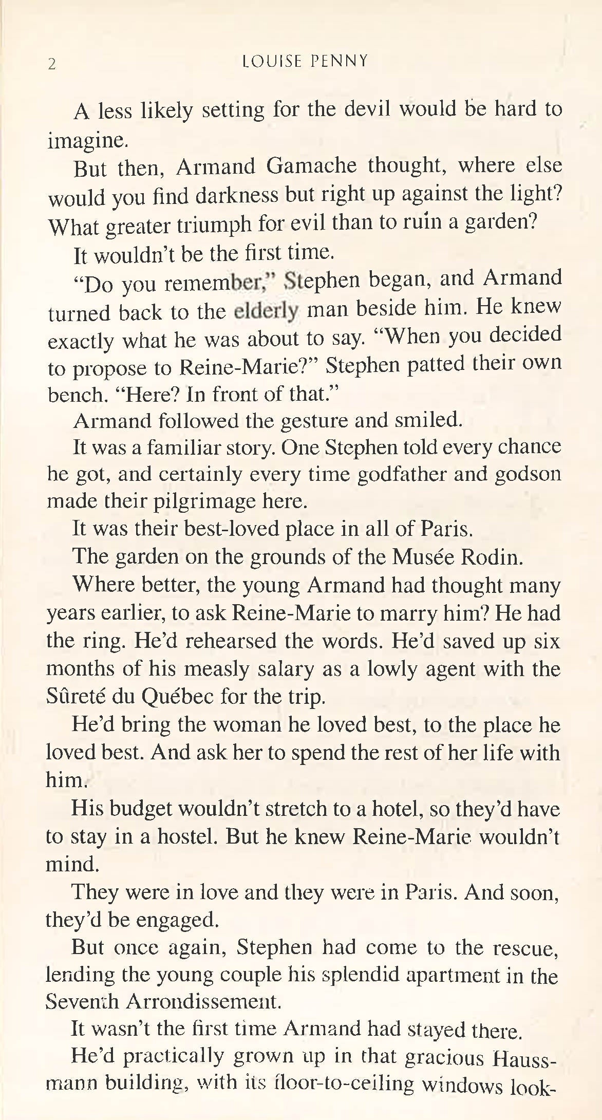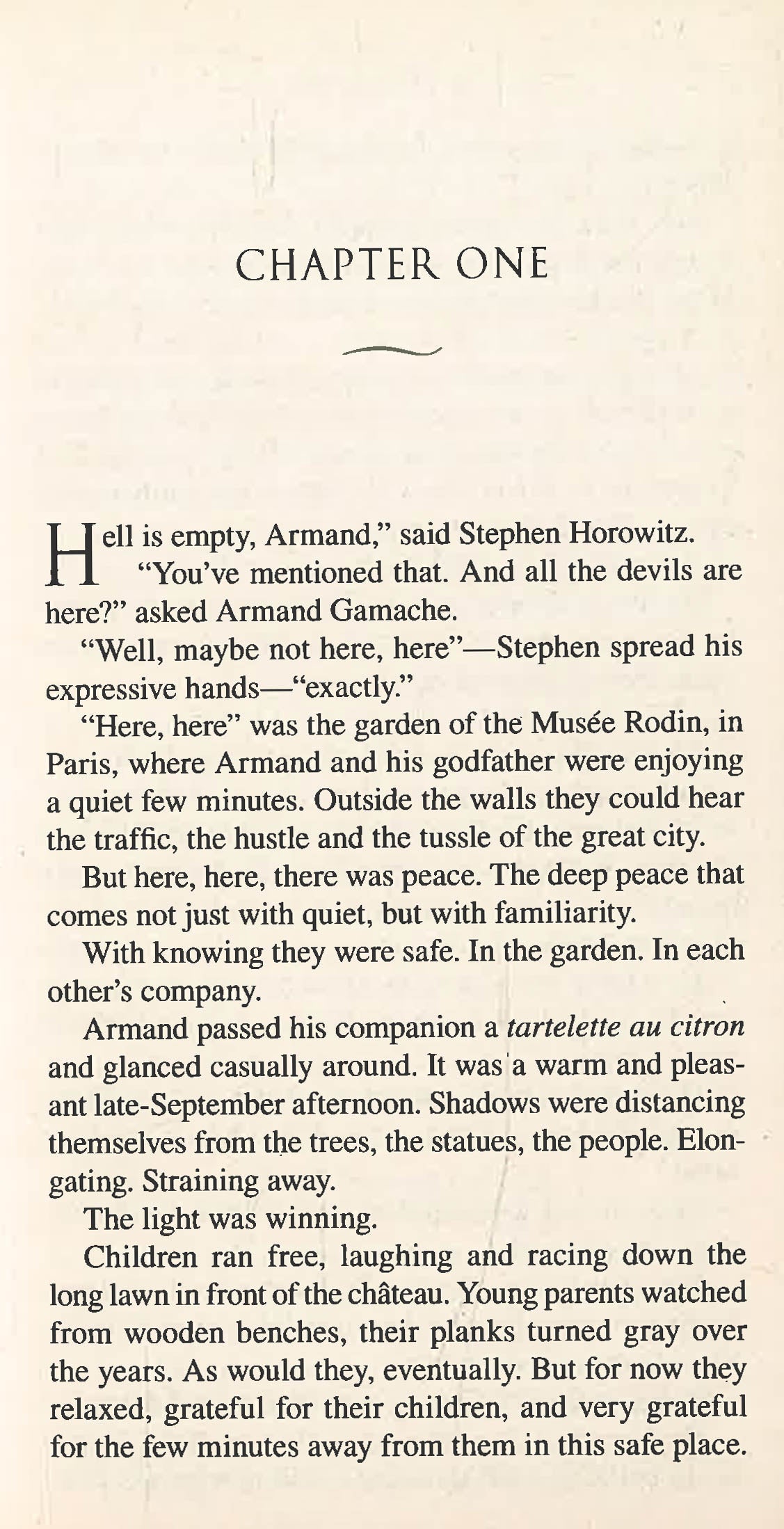 On their first night in Paris, the Gamaches gather as a family for a bistro dinner with Armand's godfather, the billionaire Stephen Horowitz. Walking home together after the meal, they watch in horror as Stephen is knocked down and critically injured in what Gamache knows is no accident, but a deliberate attempt on the elderly man's life.