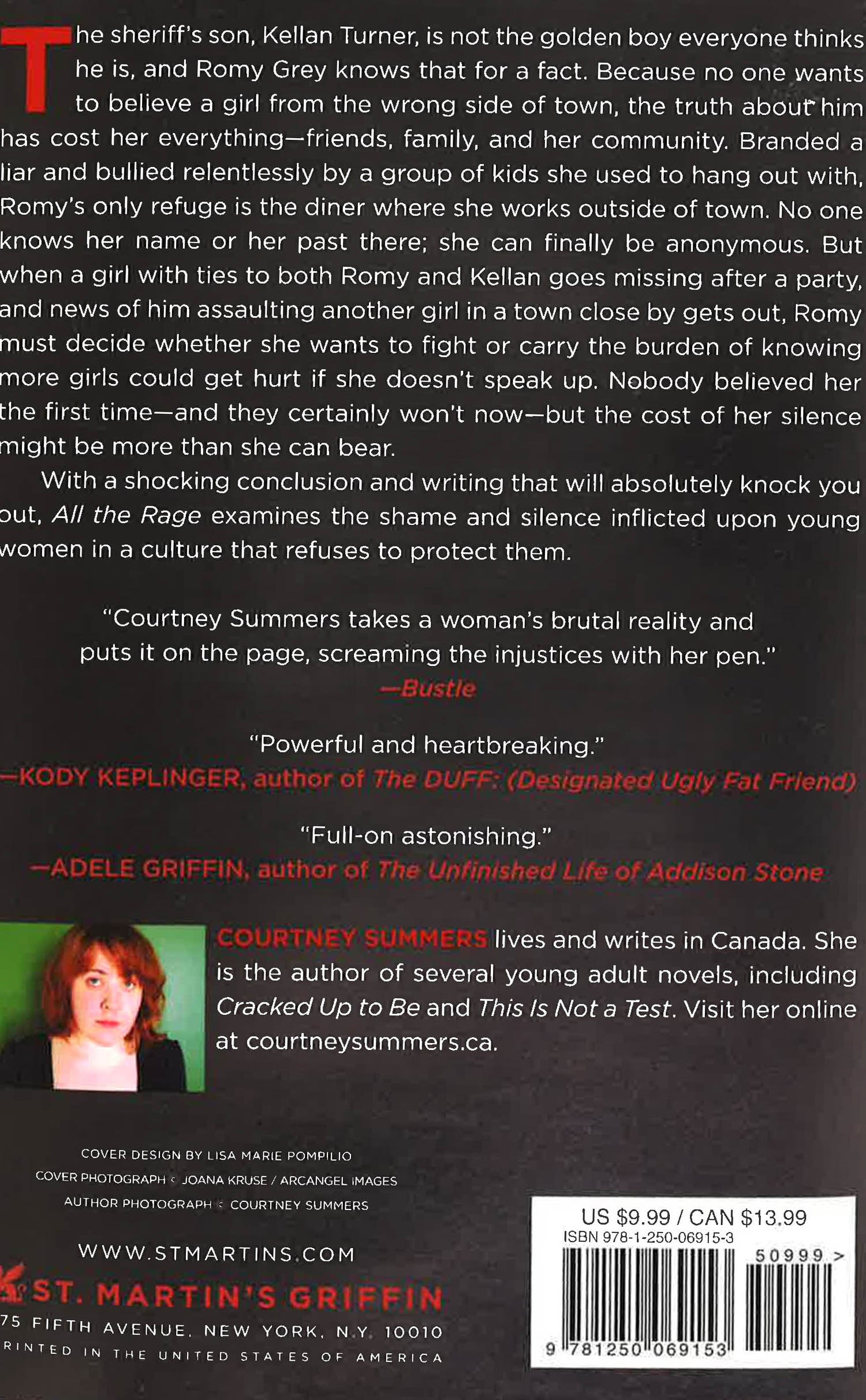 The sheriff's son, Kellan Turner, is not the golden boy everyone thinks he is, and Romy Grey knows that for a fact. Because no one wants to believe a girl from the wrong side of town, the truth about him has cost her everything - friends, family, and her community. Branded a liar and bullied relentlessly by a group of kids she used to hang out with, Romy's only refuge is the diner where she works outside of town. No one knows her name or her past there; she can finally be anonymous. But when a girl with ties to both Romy and Kellan goes missing after a party, and news of him assaulting another girl in a town close by gets out, Romy must decide whether she wants to fight or carry the burden of knowing more girls could get hurt if she doesn't speak up. Nobody believed her the first time - and they certainly won't now - but the cost of her silence might be more than she can bear.With a shocking conclusion and writing that will absolutely knock you out, Courtney Summers' new novel All the Rage examines the shame and silence inflicted upon young women in a culture that refuses to protect them.