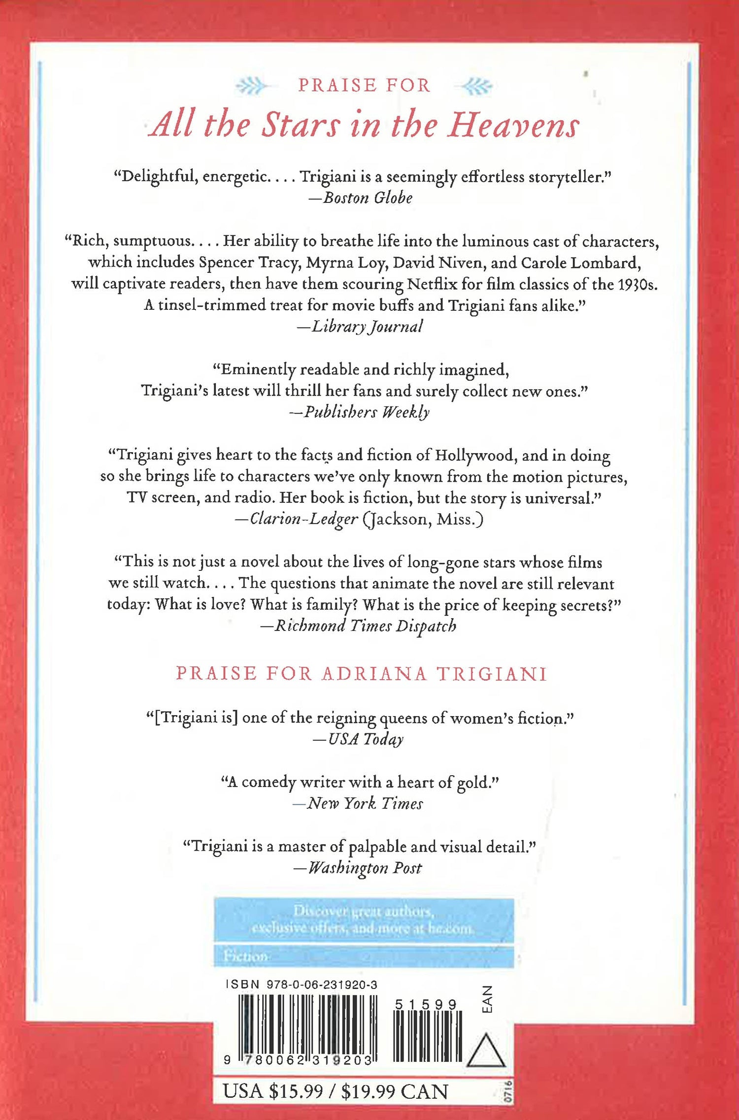 Adriana Trigiani, the New York Times bestselling author of the blockbuster epic The Shoemaker's Wife, returns with her biggest and boldest novel yet, a hypnotic tale based on a true story and filled with her signature elements: family ties, artistry, romance, and adventure. Born in the golden age of Hollywood, All the Stars in the Heavens captures the luster, drama, power, and secrets that could only thrive in the studio system—viewed through the lives of an unforgettable cast of players creating magic on the screen and behind the scenes.
