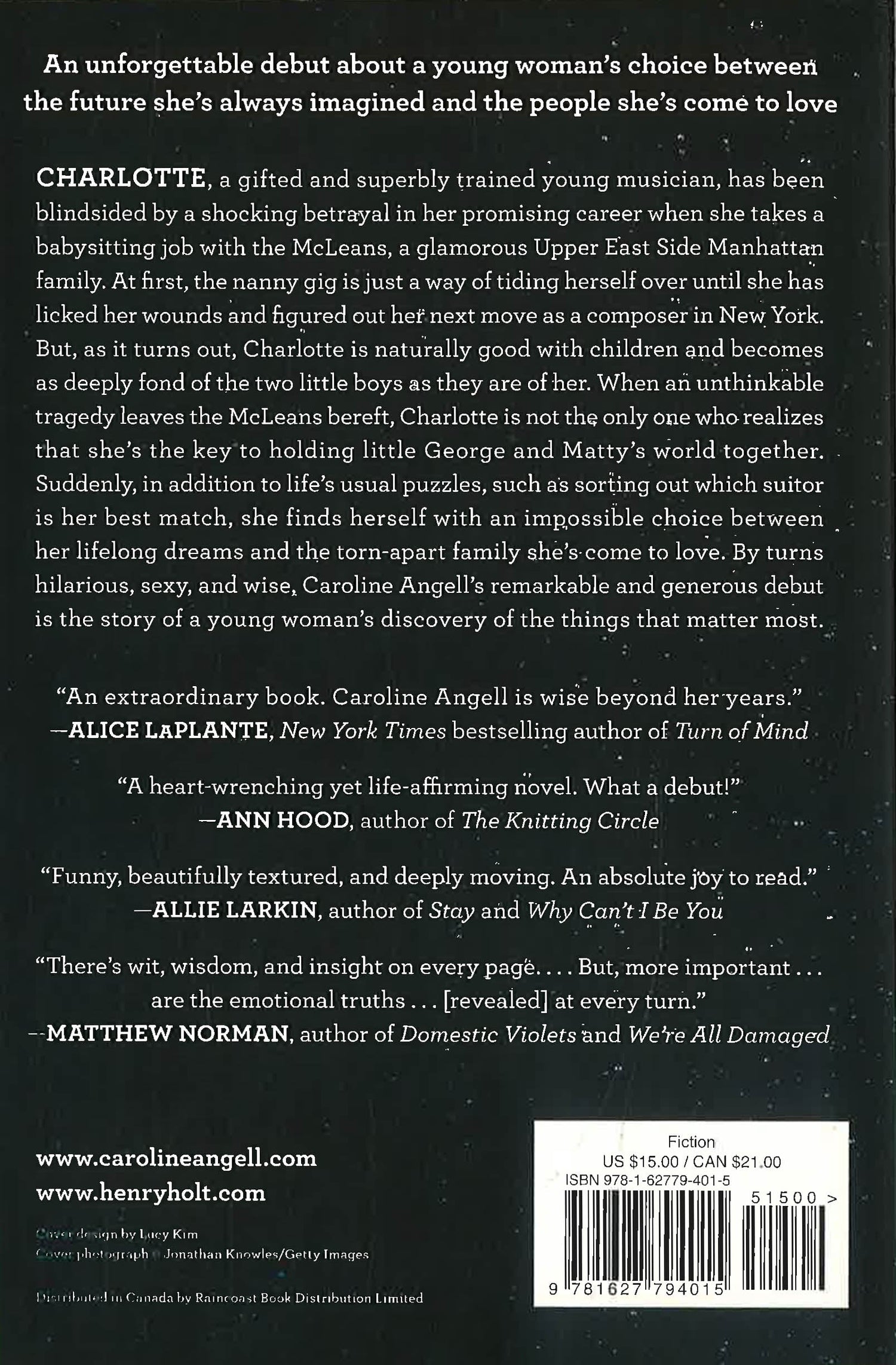 Charlotte, a gifted and superbly trained young musician, has been blindsided by a shocking betrayal in her promising career when she takes a babysitting job with the McLeans, a glamorous Upper East Side Manhattan family. At first, the nanny gig is just a way of tiding herself over until she has licked her wounds and figured out her next move as a composer in New York. But, as it turns out, Charlotte is naturally good with children and becomes as deeply fond of the two little boys as they are of her. When an unthinkable tragedy leaves the McLeans bereft, Charlotte is not the only one who realizes that she's the key to holding little George and Matty's world together. Suddenly, in addition to life's usual puzzles, such as sorting out which suitor is her best match, she finds herself with an impossible choice between her life-long dreams and the torn-apart family she's come to love. By turns hilarious, sexy, and wise, Caroline Angell's remarkable and generous debut is the story of a young woman's discovery of the things that matter most.