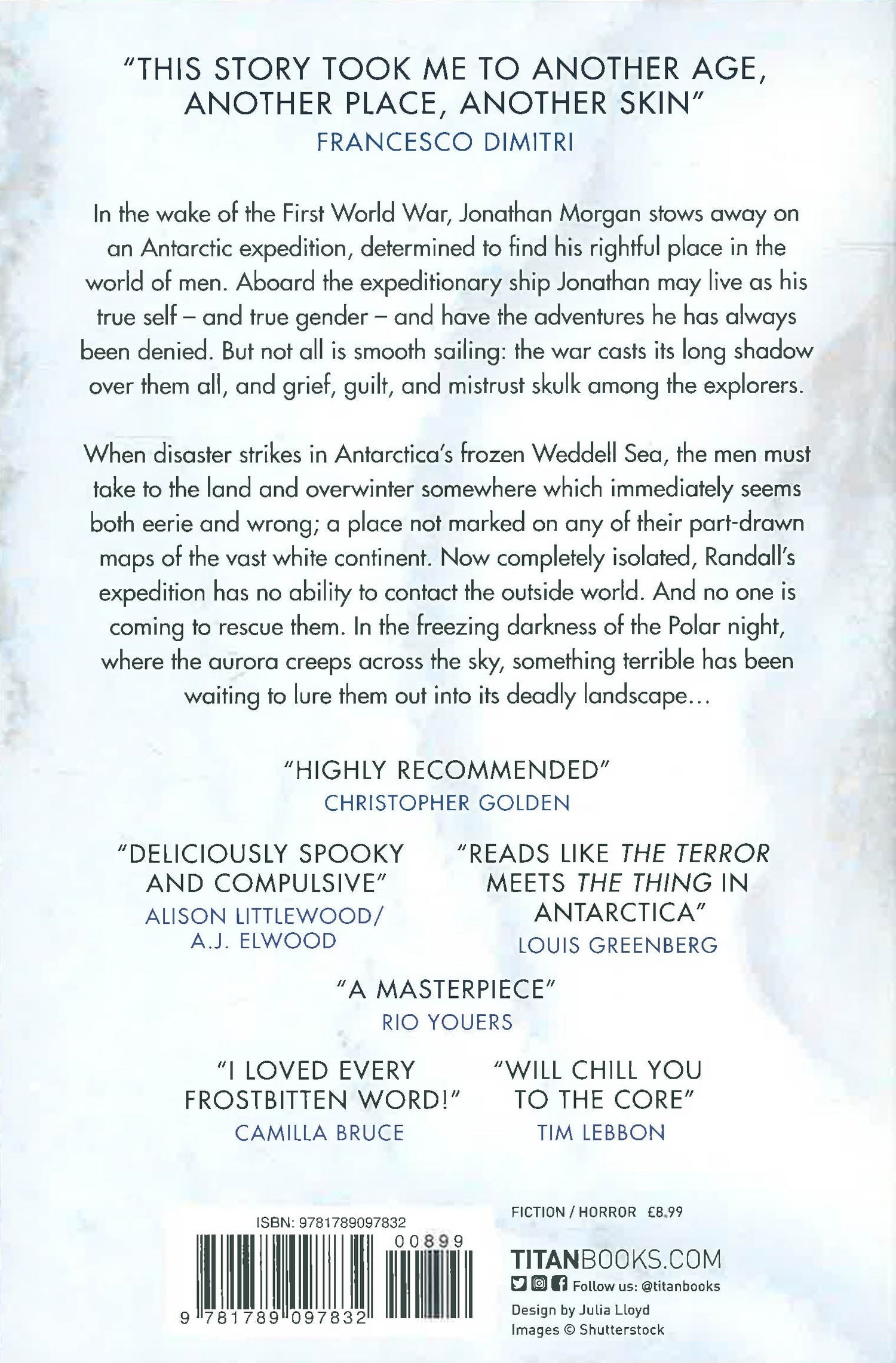 A vivid ghost story exploring identity, gender and selfhood, set against the backdrop of the golden age of polar exploration. Perfect for fans of Philip Pullman's Northern Lights and Michelle Paver's Thin Air. In the wake of the First World War, Jonathan Morgan stows away on an Antarctic expedition, determined to find his rightful place in the world of men. Aboard the expeditionary ship of his hero, the world-famous explorer James "Australis" Randall, Jonathan may live as his true self-and true gender-and have the adventures he has always been denied. But not all is smooth sailing: the war casts its long shadow over them all, and grief, guilt, and mistrust skulk among the explorers. When disaster strikes in Antarctica's frozen Weddell Sea, the men must take to the land and overwinter somewhere which immediately seems both eerie and wrong; a place not marked on any of their part-drawn maps of the vast white continent. Now completely isolated, Randall's expedition has no ability to contact the outside world. And no one is coming to rescue them. In the freezing darkness of the Polar night, where the aurora creeps across the sky, something terrible has been waiting to lure them out into its deadly landscape... As the harsh Antarctic winter descends, this supernatural force will prey on their deepest desires and deepest fears to pick them off one by one. It is up to Jonathan to overcome his own ghosts before he and the expedition are utterly destroyed.