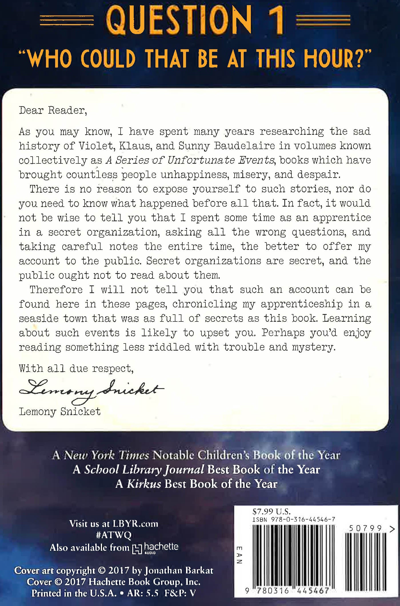 Before the Baudelaires became orphans, before he encountered A Series of Unfortunate Events, even before the invention of Netflix, Lemony Snicket was a boy discovering the mysteries of the world. Read the account of it all, in the debut volume of The New York Times bestselling series, available now with an intriguing new title and look. In the first of four volumes, Lemony Snicket recounts the time he spent as a young man in a fading town under the care of a dubious chaperone. Navigating the mysteries of childhood can be difficult, and for Lemony Snicket, the tangled plots that surround him include a missing father, a flooding basement, suspiciously young taxi drivers, a stolen statue, a peculiar librarian, and more information than is necessary about a secret organization. Penned in signature style, All the Wrong Questions Question 1 (originally published as "Who Could That Be at This Hour?") invites you to untangle the mysteries that surround young Lemony Snicket.