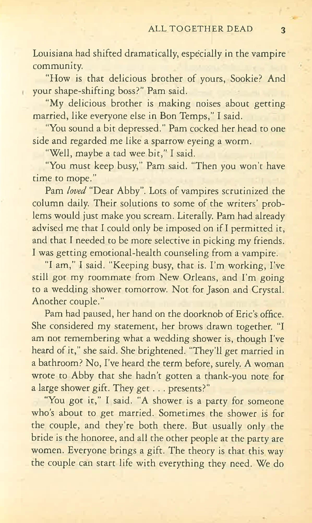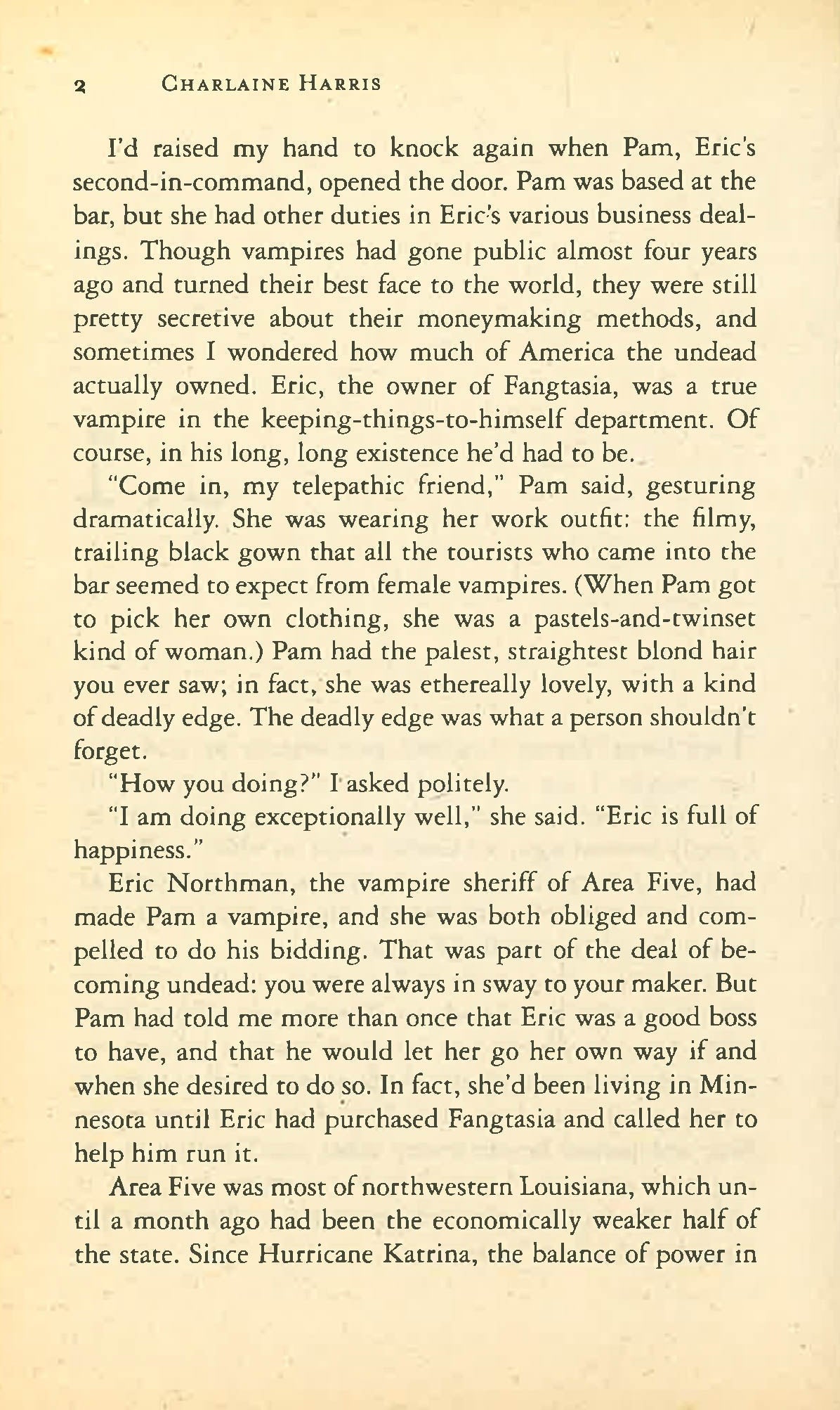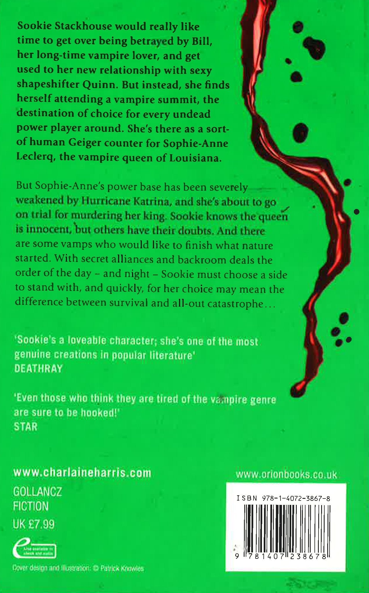 Sookie's beginning to get used to being surrounded by all varieties of undead, changeling, shapeshifting and other supernatural beings - but even she has her limits. She'd really like to take a while to get over being betrayed by Bill, her long-time vampire lover, and get used to her new relationship with the sexy shapeshifter Quinn - but instead, she finds herself attending the long-planned vampire summit, the destination of choice for every undead power player around, as a sort-of human 'Geiger counter' for Sophie-Anne Leclerq, vampire queen of Louisiana. But the job is fraught with difficulties. Sophie-Anne's power base has been severely weakened by Hurricane Katrina, and she's about to be put on trial during the event for murdering her king. Sookie knows the queen is innocent, but she's hardly prepared for other shocking murders: it looks like there are some vamps who would like to finish what nature started. With secret alliances and backroom deals the order of the day - and night - Sookie must decide which side she'll stand with, and quickly, for her choice may mean the difference between survival and all-out catastrophe.