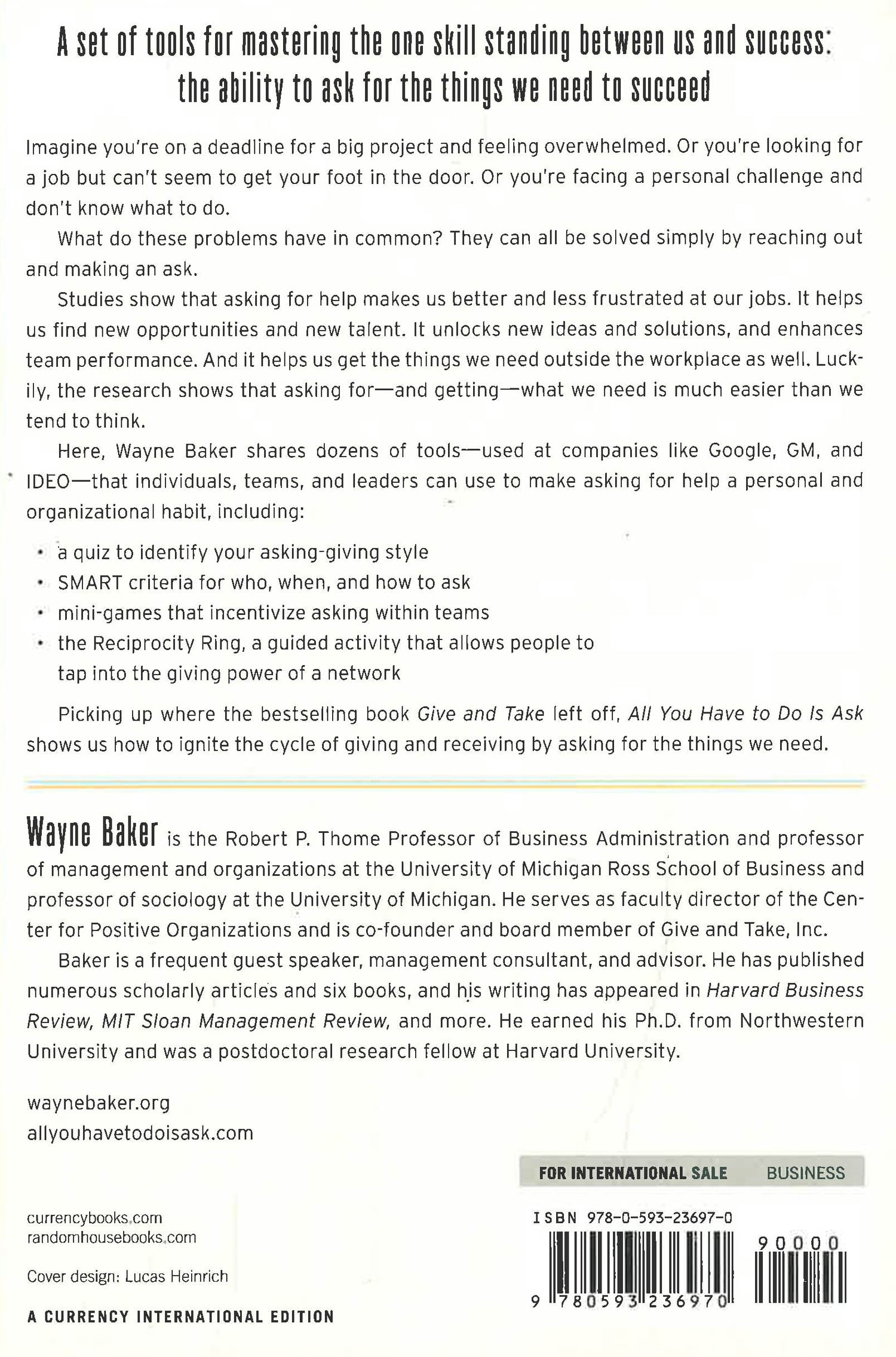 Imagine you're on a deadline for a big project, and feeling overwhelmed. Or you're looking for a job, but can't seem to get your foot in the door. Or you're dying for tickets to a sold out concert, and all your leads have gone cold. What do these problems have in common? They can all be solved simply by reaching out to a colleague, friend, or wider network and making an ask. Studies show that asking for help makes us better and less frustrated at our jobs. It helps us find new opportunities and new talent. It unlocks new ideas and solutions, and enhances team performance. And it helps us get the things we need outside the workplace as well. And yet, we rarely give ourselves permission to ask. Luckily, the research shows that asking - and getting - what we need is much easier than we tend to think. Here, Baker shares a set of strategies - used at companies like Google, GM, and IDEO - that individuals, teams, and leaders can use to make asking for help a personal and organizational habit, such as: SMART criteria for making an ask, plug-and-play routines that make requests a standard component of meetings, mini-games that incentivize asking within teams, the Reciprocity Ring, a guided activity that allows people to tap into the giving power of a network, and more. Picking up where other books have left off, All You Have to Do Is Ask shows us how to ignite the cycle of giving and receiving by asking for the things we need.