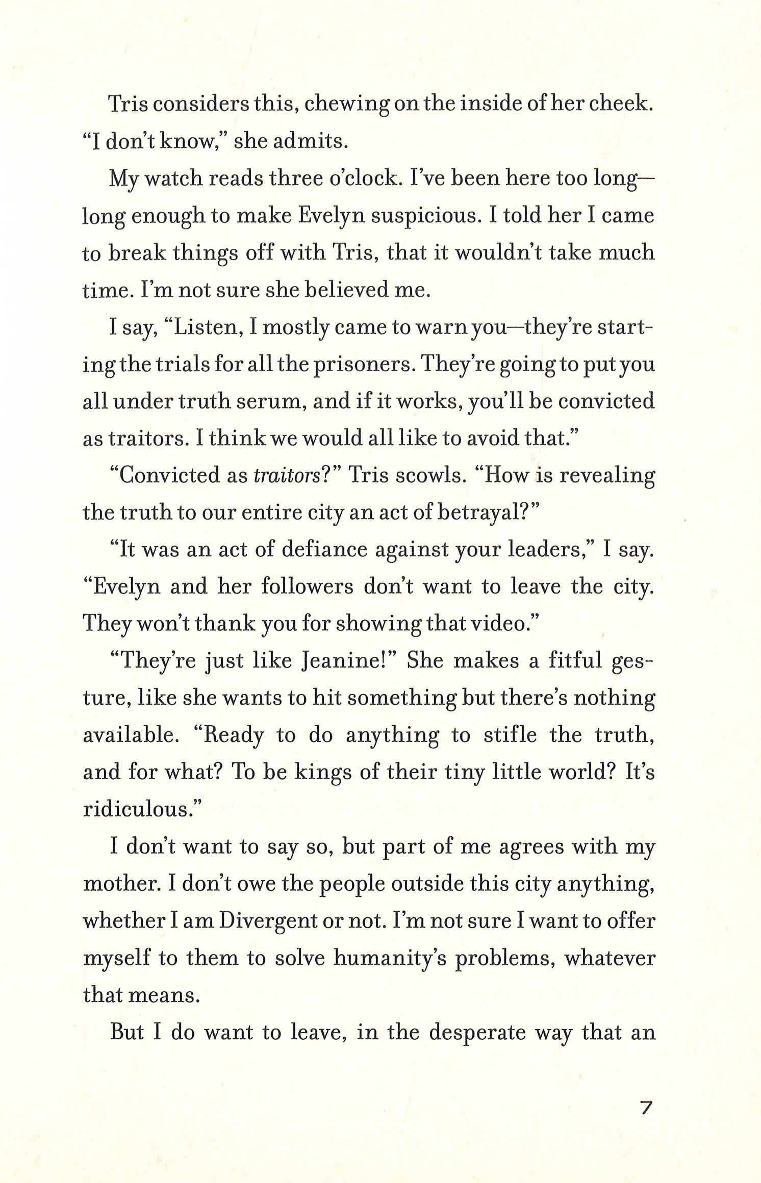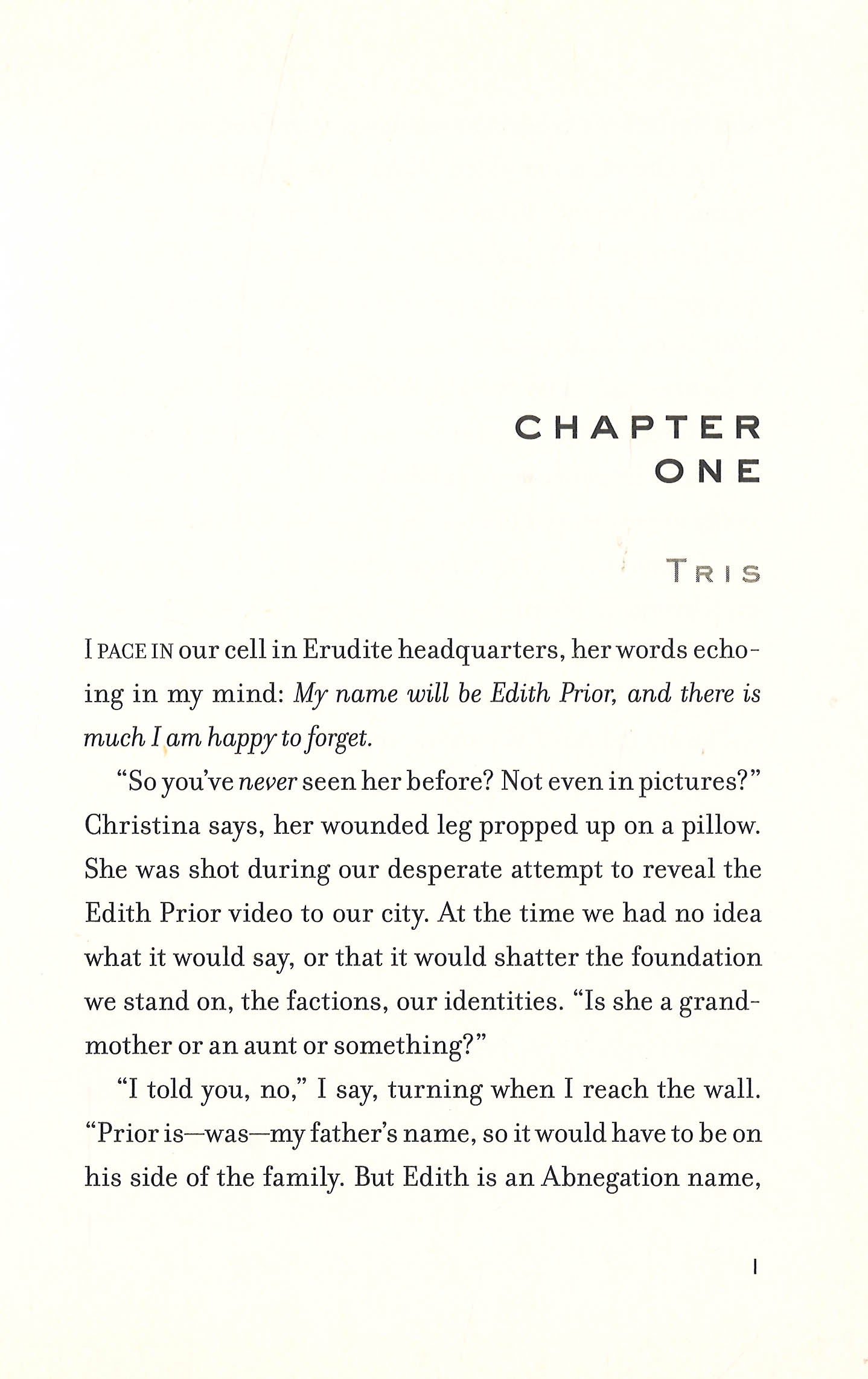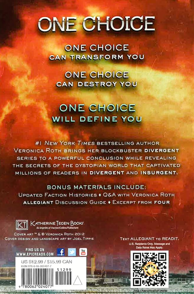 The explosive conclusion to Veronica Roth's #1 New York Times bestselling "Divergent" trilogy reveals the secrets of the dystopian world that captivated millions of readers and film fans in "Divergent" and "Insurgent." This paperback edition includes bonus content by Veronica Roth! One choice will define you. What if your whole world was a lie? What if a single revelation--like a single choice--changed everything? What if love and loyalty made you do things you never expected? Told from a riveting dual perspective, this third installment in the series follows "Tris" and "Tobias" as they battle to comprehend the complexities of human nature--and their selves--while facing impossible choices of courage, allegiance, sacrifice, and love. And don't miss Veronica Roth's thrilling novel "Carve the Mark."