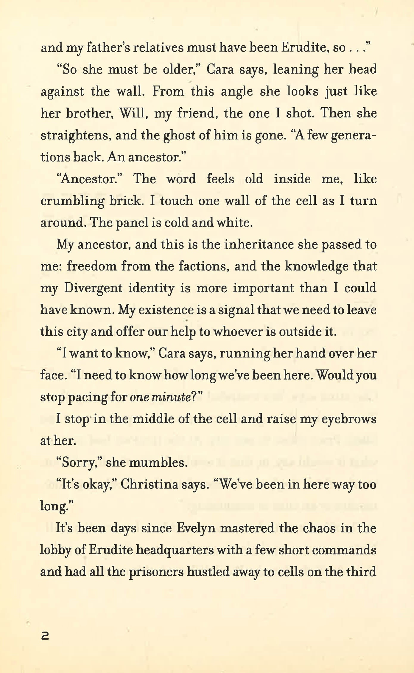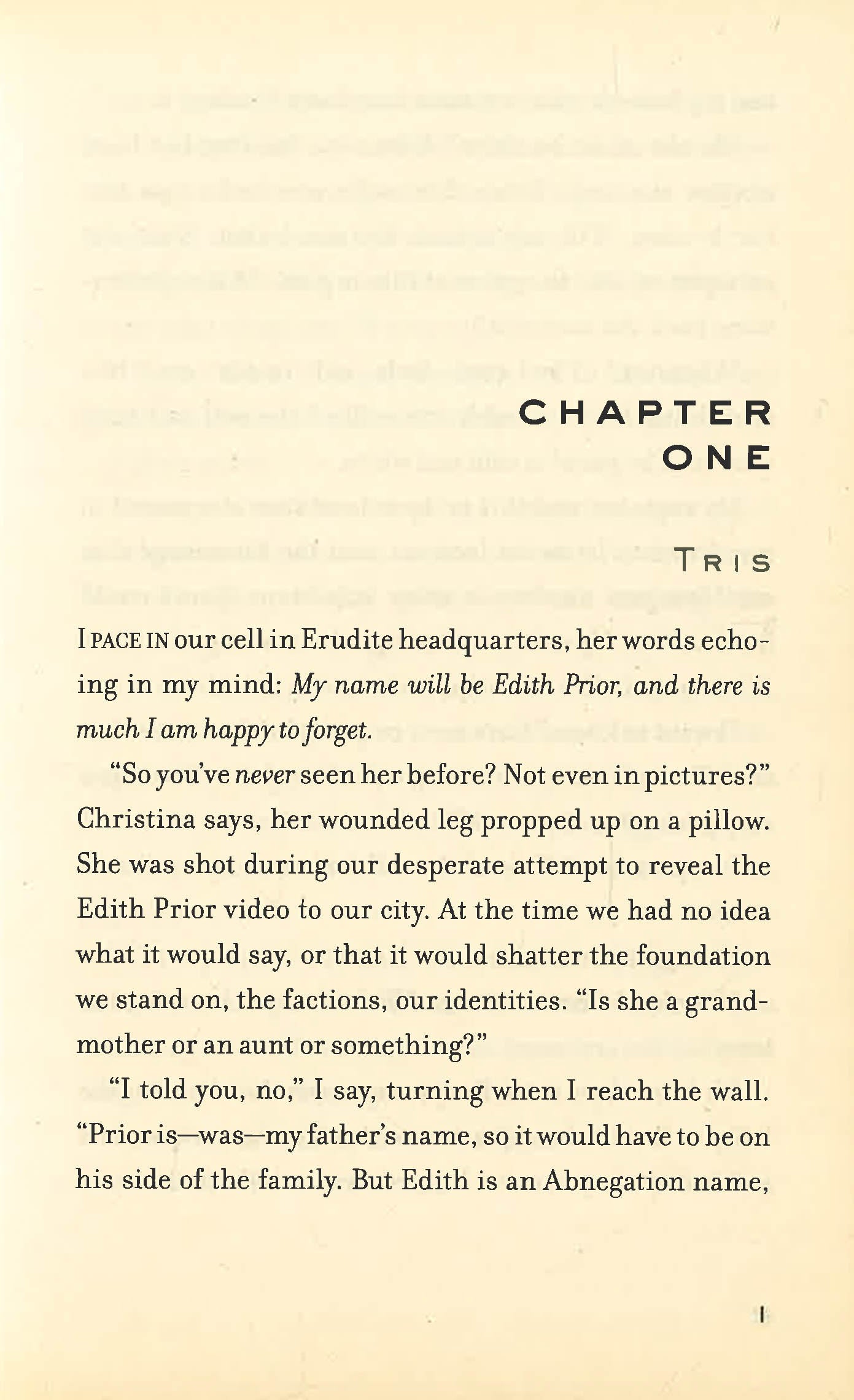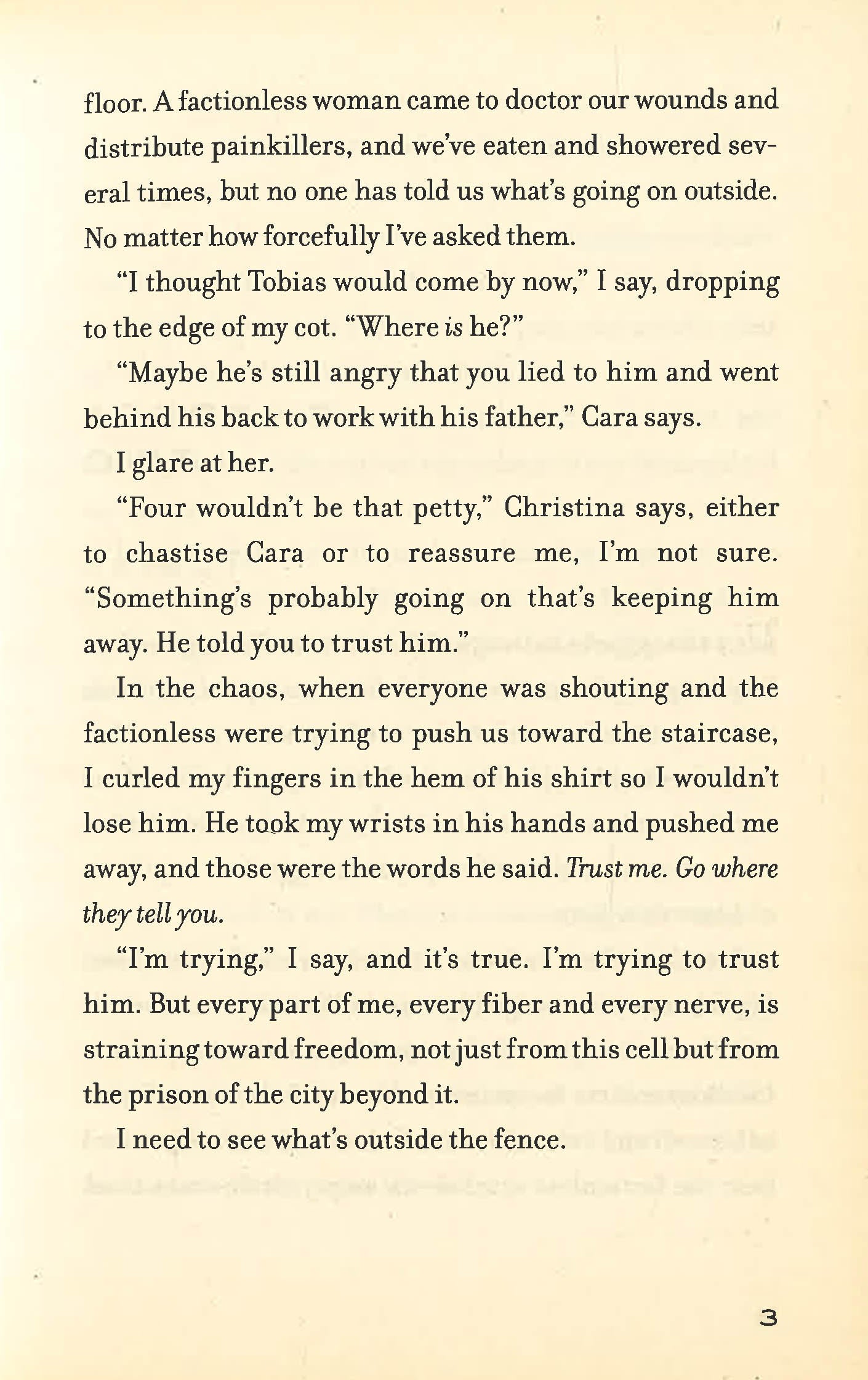 The faction-based society that Tris Prior once believed in is shattered - fractured by violence and power struggles and scarred by loss and betrayal. So when offered a chance to explore the world past the limits she's known, Tris is ready. Perhaps beyond the fence, she and Tobias will find a simple new life together, free from complicated lies, tangled loyalties, and painful memories.
