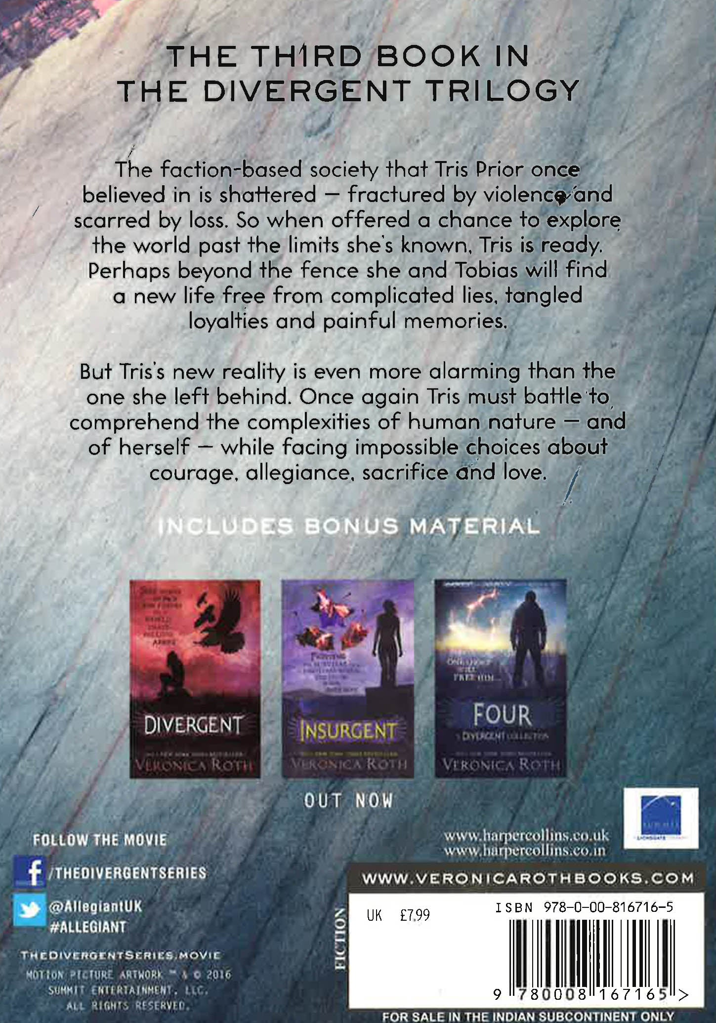 This distinctive edition of the third book in Veronica Roth's Divergent series features cover artwork from the major motion picture The Divergent Series: Allegiant, starring Shailene Woodley, Theo James, and Ansel Elgort. This special edition also contains never-before-seen bonus content! One choice will define you. What if your whole world was a lie? What if a single revelation - like a single choice - changed everything? What if love and loyalty made you do things you never expected? The explosive conclusion to Veronica Roth's No. 1 New York Times bestselling Divergent trilogy reveals the secrets of the dystopian world that has captivated millions of readers and film fans in Divergent and Insurgent.