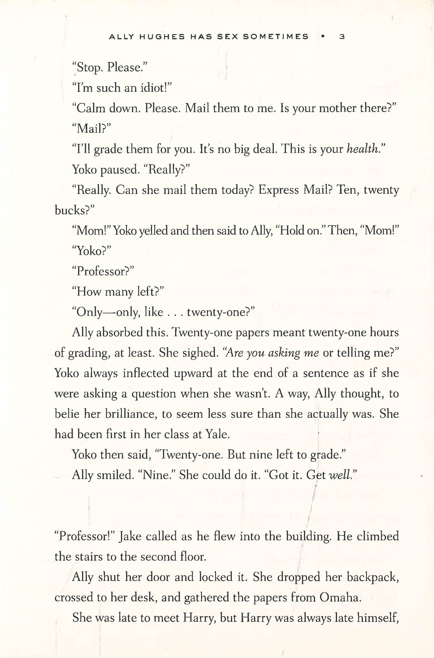 Life isn't easy for single mother Ally Hughes. She teaches at Brown, where her class load is huge and her boss is a menace. At home, she contends with a critical mother, a falling-down house, and a daughter who never misses a beat. Between taking care of the people she loves, teaching full time, and making ends meet, Ally doesn't have time for a man. She doesn't date. She's not into flings. But then she meets Jake, an eager student, young in years but old in soul, who challenges his favorite professor to open up her life, and her heart, to love. What follows is a magical, passionate weekend... a romance that Ally is forced to end before it can even truly begin. Ten years later, Ally's still single when Jake reappears--dating Ally's now-grown daughter. In this smart, funny, and heartrending tale, Ally is finally forced to concede that an independent woman can still make room in her life for love.