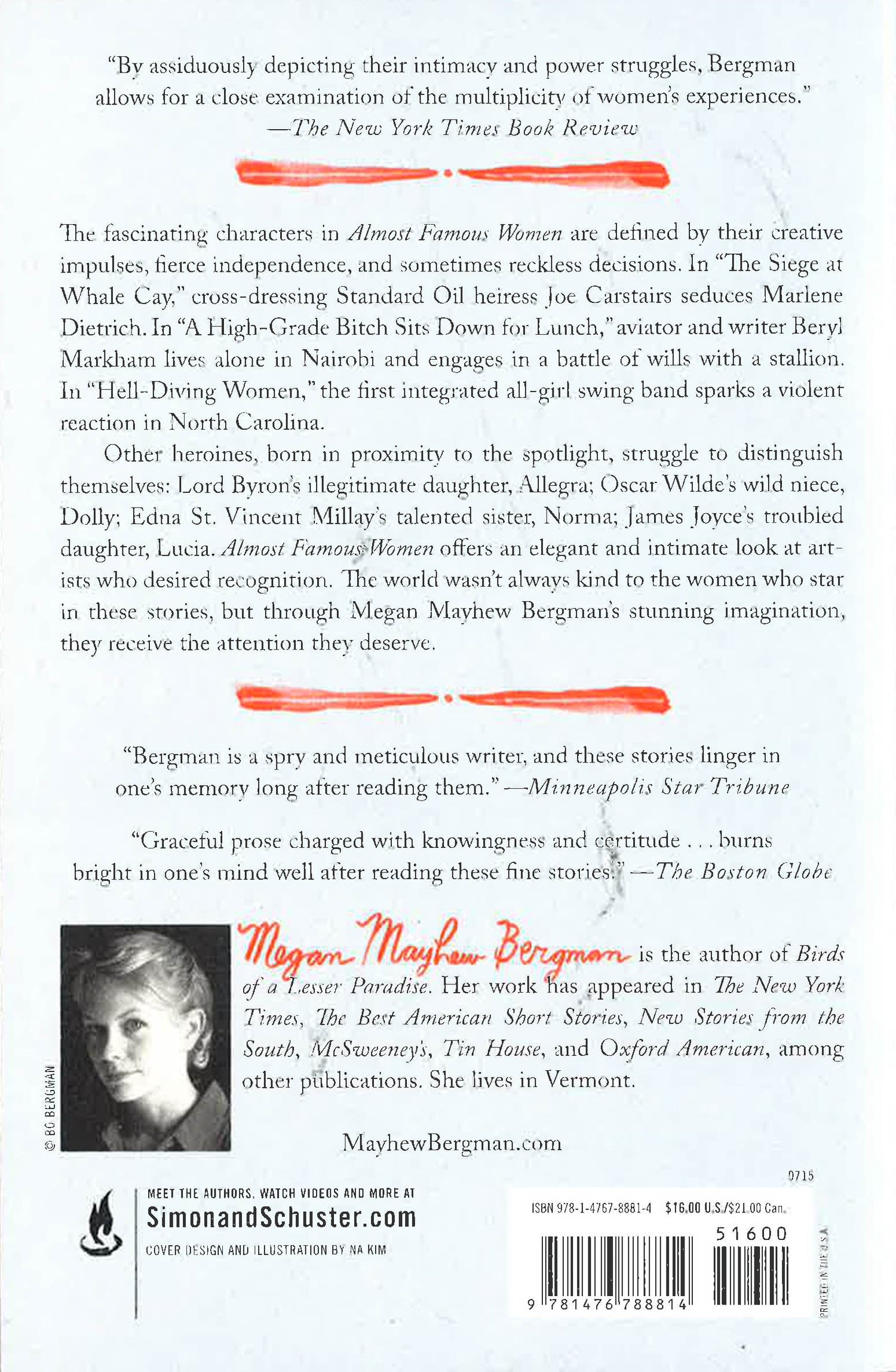From a prizewinning, beloved young author, a provocative collection that explores the lives of colorful, intrepid women in history. "These stories linger in one's memory long after reading them" (Star Tribune, Minneapolis). The fascinating characters in Megan Mayhew Bergman's "collection of stories as beautiful and strange as the women who inspired them" (Kirkus Reviews, starred review) are defined by their creative impulses, fierce independence, and sometimes reckless decisions. In "The Siege at Whale Cay," cross-dressing Standard Oil heiress Joe Carstairs seduces Marlene Dietrich. In "A High-Grade Bitch Sits Down for Lunch," aviator and writer Beryl Markham lives alone in Nairobi and engages in a battle of wills with a stallion. In "Hell-Diving Women," the first integrated, all-girl swing band sparks a violent reaction in North Carolina. Other heroines, born in proximity to the spotlight, struggle to distinguish themselves: Lord Byron's illegitimate daughter, Allegra; Oscar Wilde's wild niece, Dolly; Edna St. Vincent Millay's talented sister, Norma; James Joyce's daughter, Lucia. Almost Famous Women offers an elegant and intimate look at artists who desired recognition. "By assiduously depicting their intimacy and power struggles, Bergman allows for a close examination of the multiplicity of women's experiences" (The New York Times Book Review). The world wasn't always kind to the women who star in these stories, but through Mayhew Bergman's stunning imagination, they receive the attention they deserve. Almost Famous Women is "addictive and tantalizing, each story whetting our appetite for more" (Atlanta Journal-Constitution).
