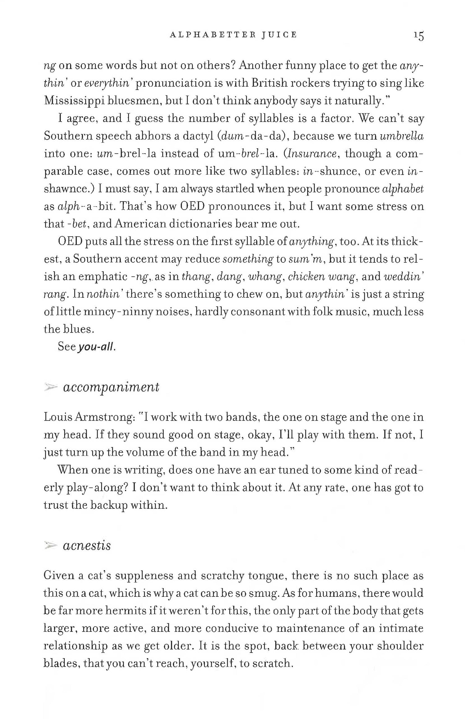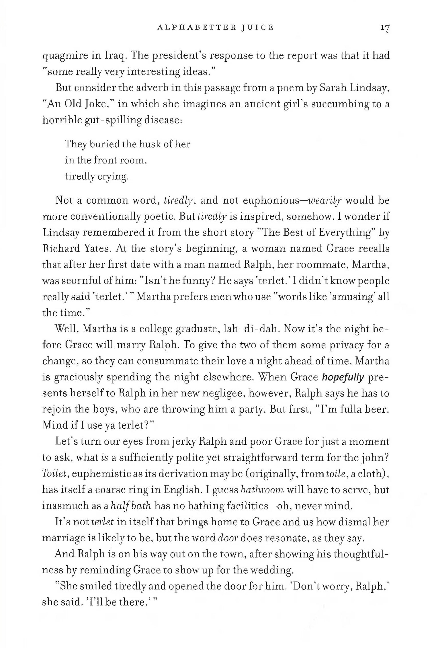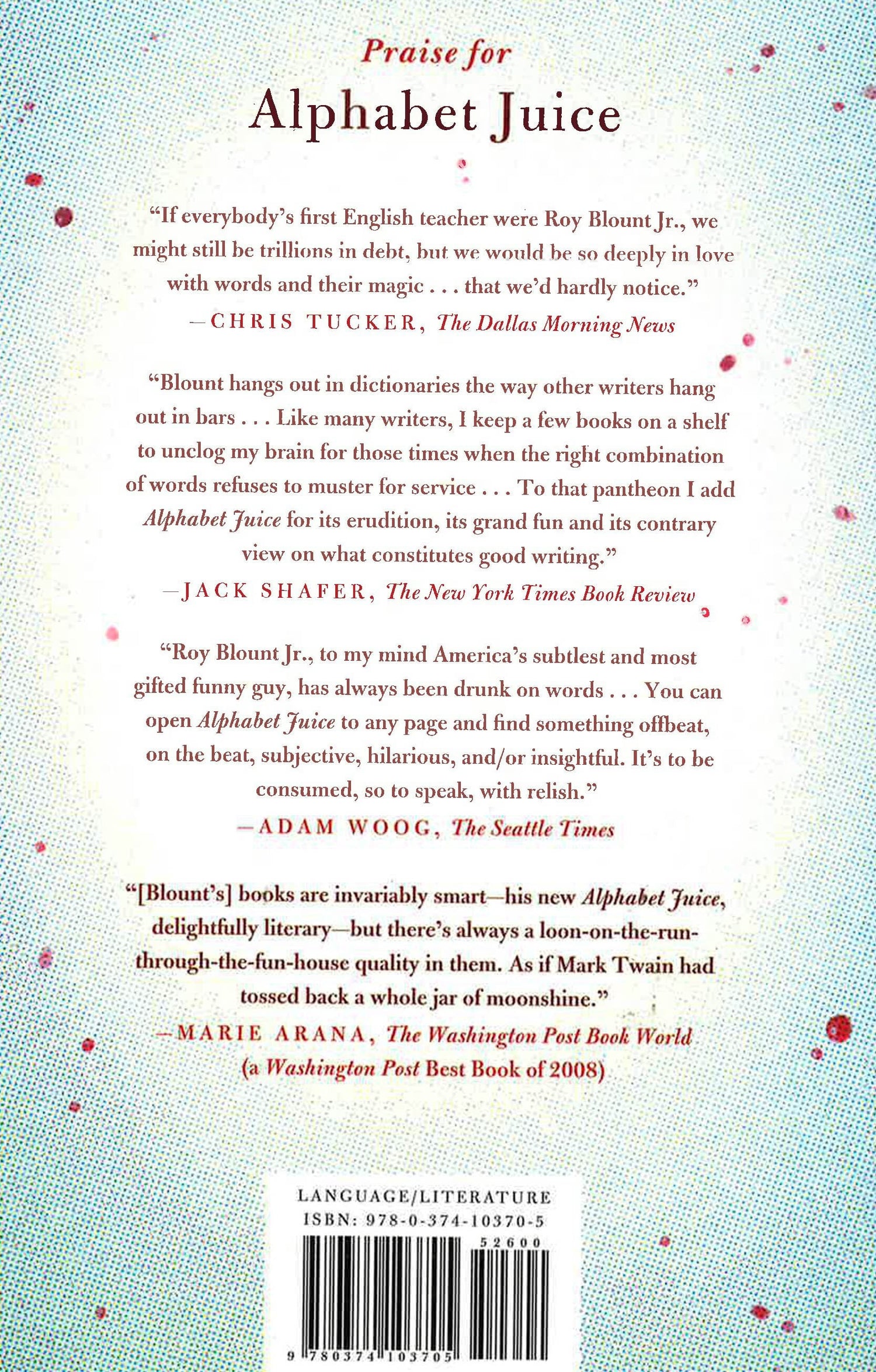 Fresh-squeezed Lexicology, with Twists No man of letters savors the ABC's, or serves them up, like language-loving humorist Roy Blount Jr. His glossary, from "ad""hominy" to "zizz," ""is hearty, full bodied, and out to please discriminating palates coarse and fine. In 2008, he celebrated the gists, tangs, and energies of letters and their combinations in "Alphabet Juice," to wide acclaim. Now, "Alphabetter Juice." Which is "better." This book""is for anyone--novice wordsmith, sensuous reader, or career grammarian--who loves to get physical with words. What is the universal sign of disgust, "ew," doing in "beautiful" and "cutie"? Why is "toadless," but not "frogless," in the Oxford English Dictionary? How can the U. S. Supreme Court find relevance in "gollywoddles"? Might there be scientific evidence for the sonicky value of "hunch"? And why would someone not bother to spell correctly the very word he is trying to define on Urbandictionary.com? Digging into how locutions evolve, and work, or fail, Blount""draws upon everything from "The Tempest" to "The Wire." He takes us to Iceland, for salmon-watching with a "girl gillie," and to Georgian England, where a distinguished etymologist bites off more of a "giantess" than he can chew. Jimmy Stewart appears, in connection with "kludge "and the bombing of Switzerland. Litigation over "supercalifragilisticexpialidocious "leads to a vintage werewolf movie; news of possum-tossing, to "metanarrative. "As Michael Dirda wrote in "The Washington Post Book World," "The immensely likeable Blount clearly possesses what was called in the Italian Renaissance 'sprezzatura, ' that rare and enviable ability to do even the most difficult things without breaking a sweat." "Alphabetter Juice" is brimming with sprezzatura. Have a taste.