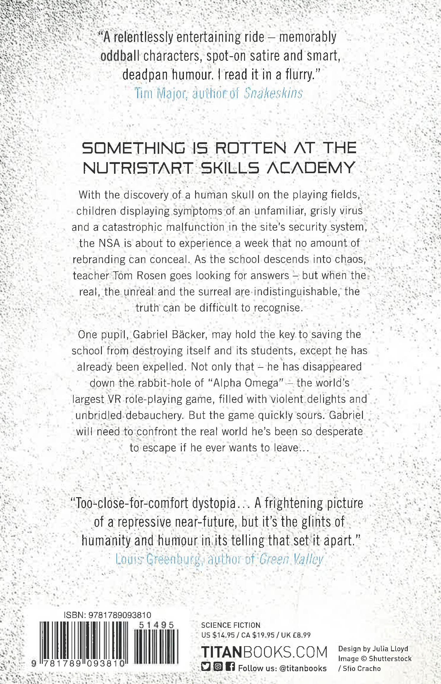 Stranger Things meets Black Mirror and Ready Player One in this unsettling, near-future SF standalone. Something is rotten in the state of the NutriStart Skills Academy With the discovery of a human skull on the playing fields, children displaying symptoms of an unfamiliar, grisly virus and a catastrophic malfunction in the site's security system, the NSA is about to experience a week that no amount of rebranding can conceal. As the school descends into chaos, teacher Tom Rosen goes looking for answers - but when the real, the unreal and the surreal are indistinguishable, the truth can be difficult to recognise. One pupil, Gabriel Backer, may hold the key to saving the school from destroying itself and its students, except he has already been expelled. Not only that - he has disappeared down the rabbit-hole of "Alpha Omega" - the world's largest VR role-playing game, filled with violent delights and unbridled debauchery. But the game quickly sours. Gabriel will need to confront the real world he's been so desperate to escape if he ever wants to leave...
