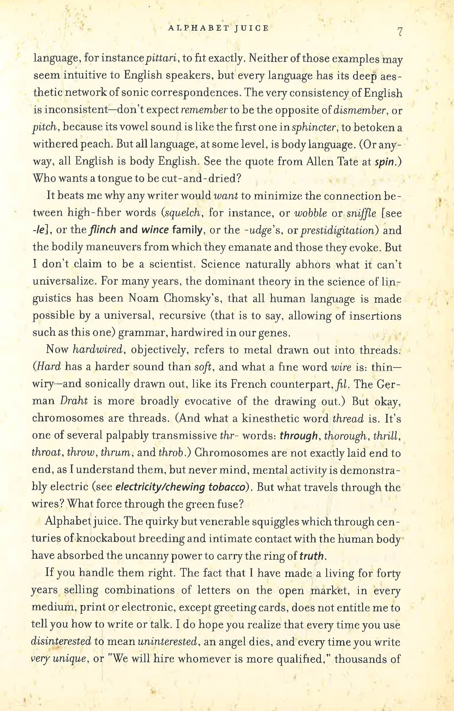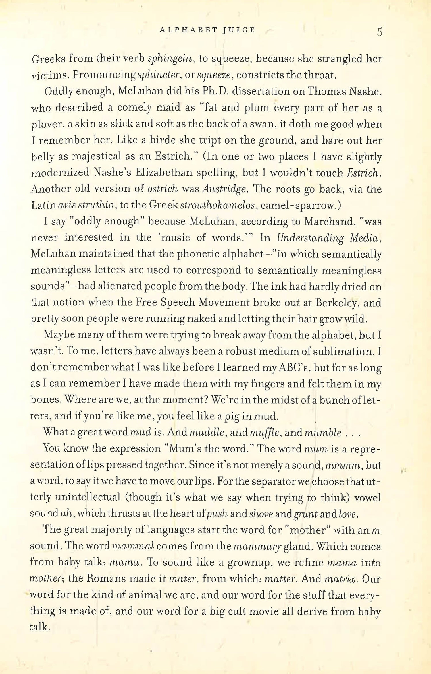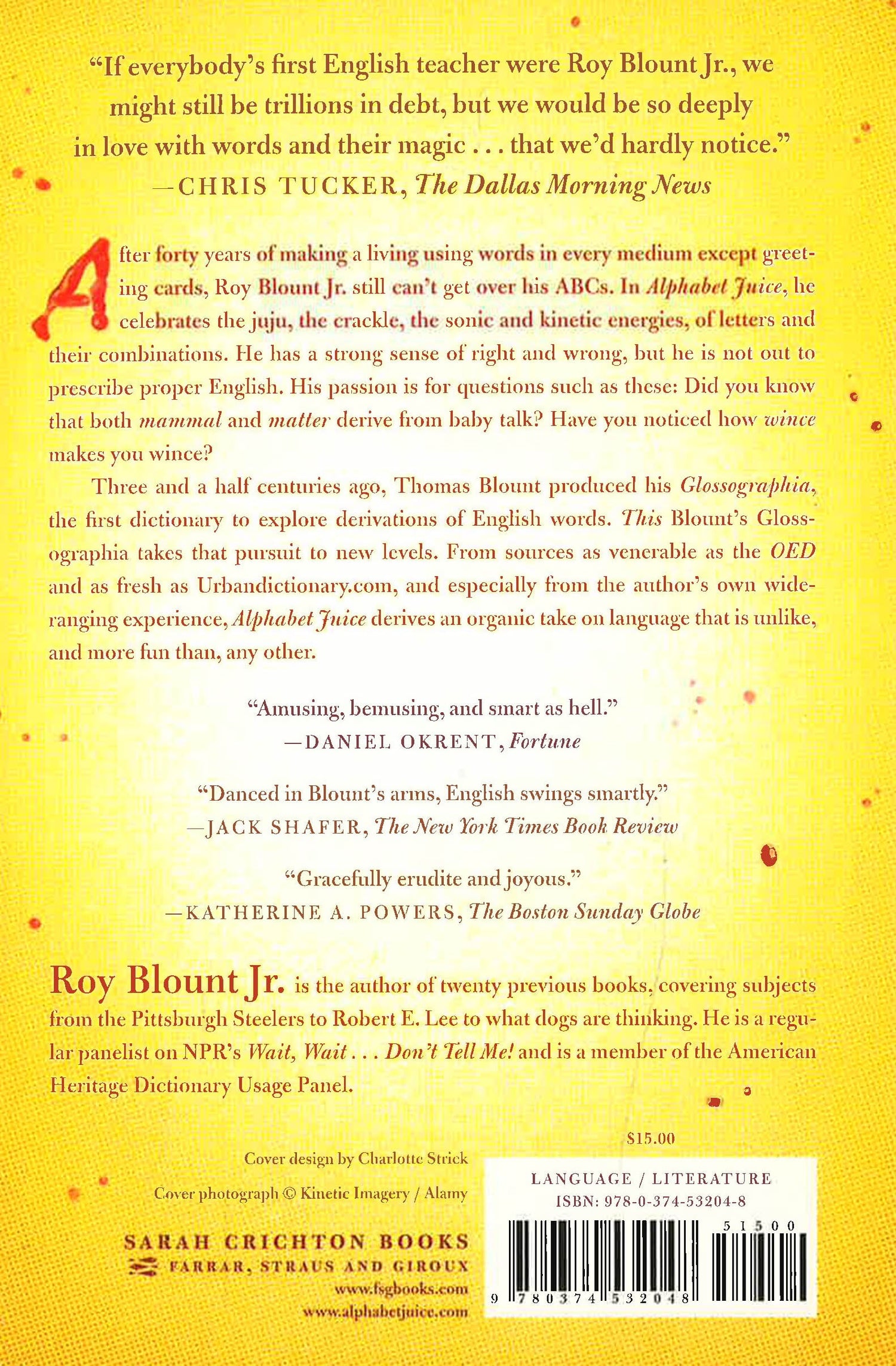 If everybody's first English teacher were Roy Blount Jr., we might still be trillions in debt, but we would be so deeply in love with words and their magic . . . that we'd hardly notice. --Chris Tucker, The Dallas Morning News After forty years of making a living using words in every medium except greeting cards, Roy Blount Jr. still can't get over his ABCs. In Alphabet Juice, he celebrates the juju, the crackle, the sonic and kinetic energies, of letters and their combinations. He has a strong sense of right and wrong, but he is not out to prescribe proper English. His passion is for questions such as these: Did you know that both mammal and matter derive from baby talk? Have you noticed how wince makes you wince? Three and a half centuries ago, Thomas Blount produced his Glossographia, the first dictionary to explore derivations of English words. This Blount's Glossographia takes that pursuit to new levels. From sources as venerable as the OED and as fresh as Urbandictionary.com, and especially from the author's own wide ranging experience, Alphabet Juice derives an organic take on language that is unlike, and more fun than, any other. Amusing, bemusing, and smart as hell. --Daniel Okrent, Fortune Danced in Blount's arms, English swings smartly. --Jack Shafer, The New York Times Book Review Gracefully erudite and joyous. --Katherine A. Powers, The Boston Sunday Globe