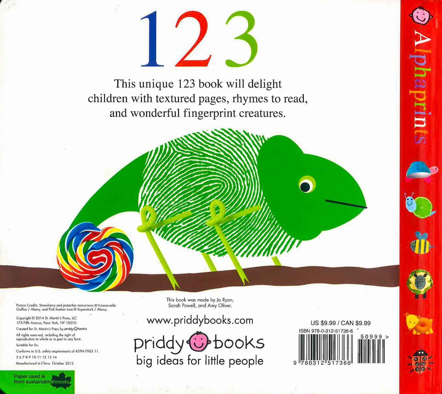 Finger and thumb prints are turned into an array of animals through the addition of simple illustration and photographs in this innovative 123 book, which has been designed to develop children's counting and number recognition skills. The imaginative, rhythmic text is fun to read and listen to, and the individual ridges on all of the finger and thumb prints are embossed, adding a tactile, interactive element.