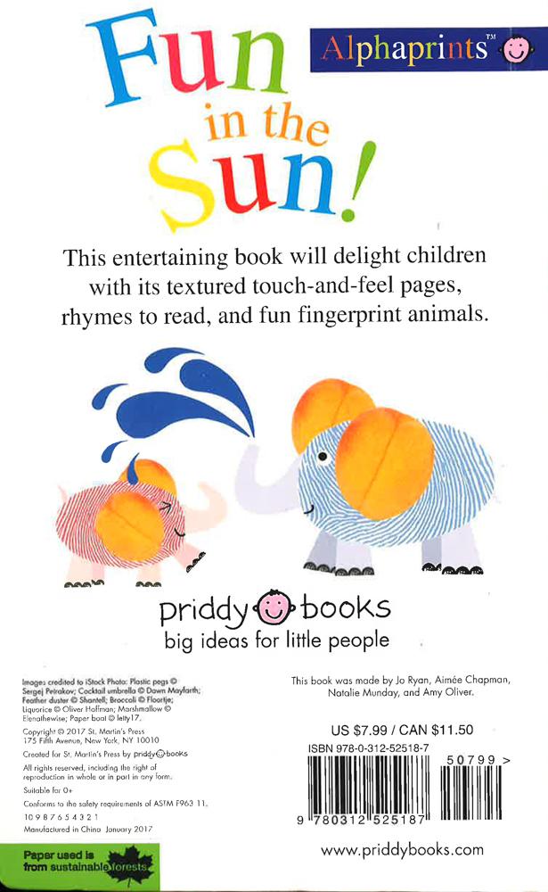 Join the crabs, elephants, and other Alphaprints animals on vacation as they have fun in the sun in this touch-and-feel board book. WIth fun rhymes to read and textures for little hands to feel and explore, plus the unique Alphaprints characters made by adding everyday images to embossed fingerprints. This is the perfect gift to take away with your little one this summer! *This Book May Have Remainder Mark*