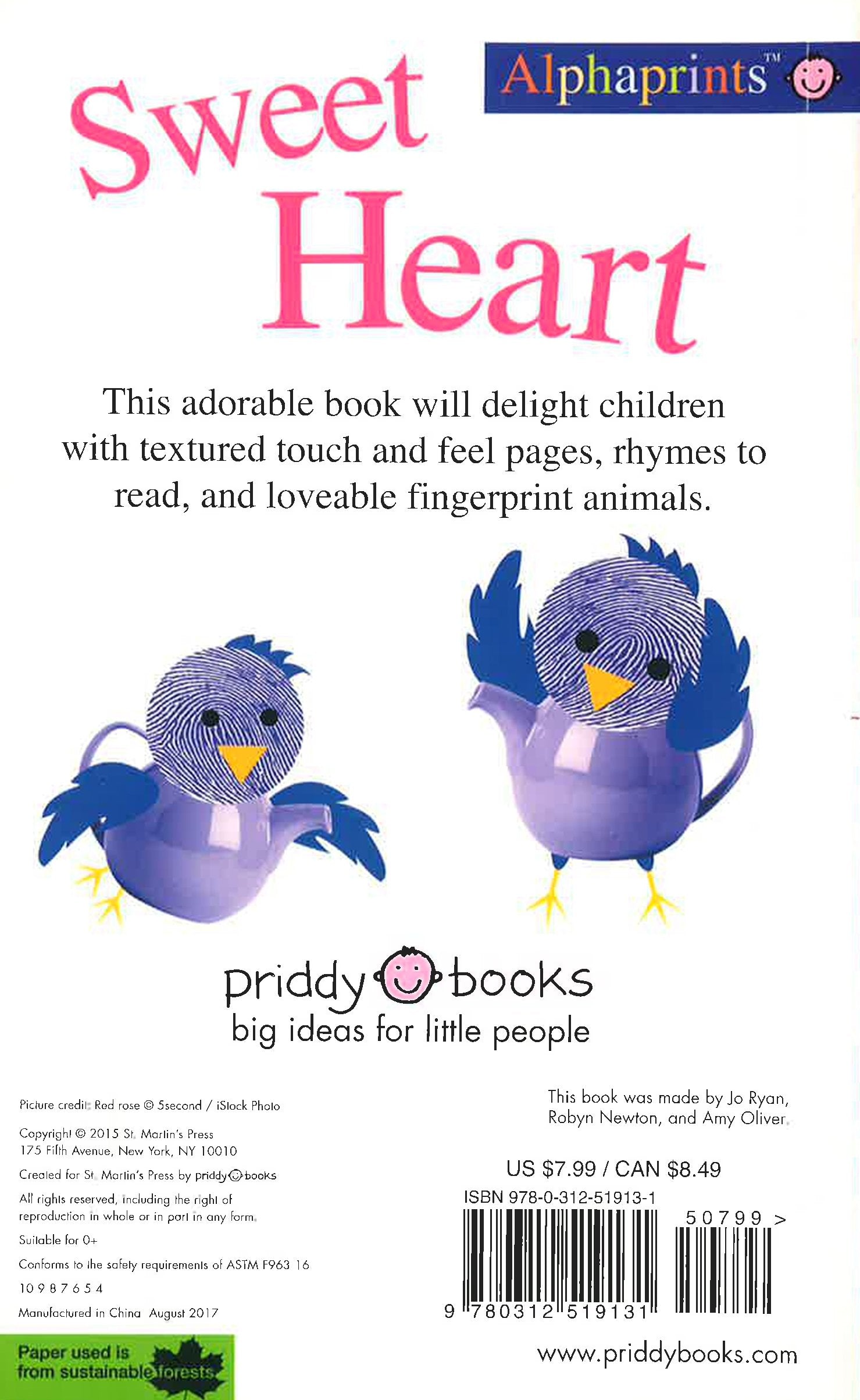 This is an enchanting touch-and-feel Alphaprints book to share with the little one you love. The pages are illustrated with the cutest pictures of a cuddly teddy bear, pretty bluebirds and more, all created by adding photographs of everyday things to embossed fingerprints. The adorable rhymes are perfect to read together, and there are different touch-and-feel patches for little hands to reach out to and explore. *This book may have remainder mark and minor shelfwear*