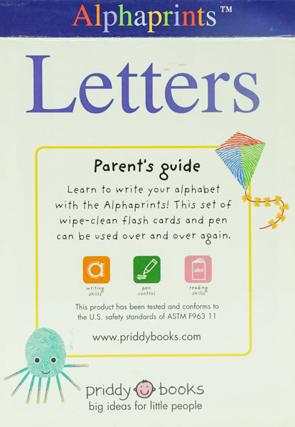 Make learning fun with flash cards and the Alphaprints! These wipe-clean flash cards are a great way to encourage your child to practice writing. Children will enjoy learning to write their letters with this pack of 26 double-sided Alphaprint flash cards, packaged neatly in a box with a dry-wipe pen. Each letter can be traced and copied to allow children to master letter formation, as well as improving their pen control and writing skills. The sturdy cards wipe clean so that each one can be completed, wiped away, and repeated, for hours of early-learning Alphaprints fun!