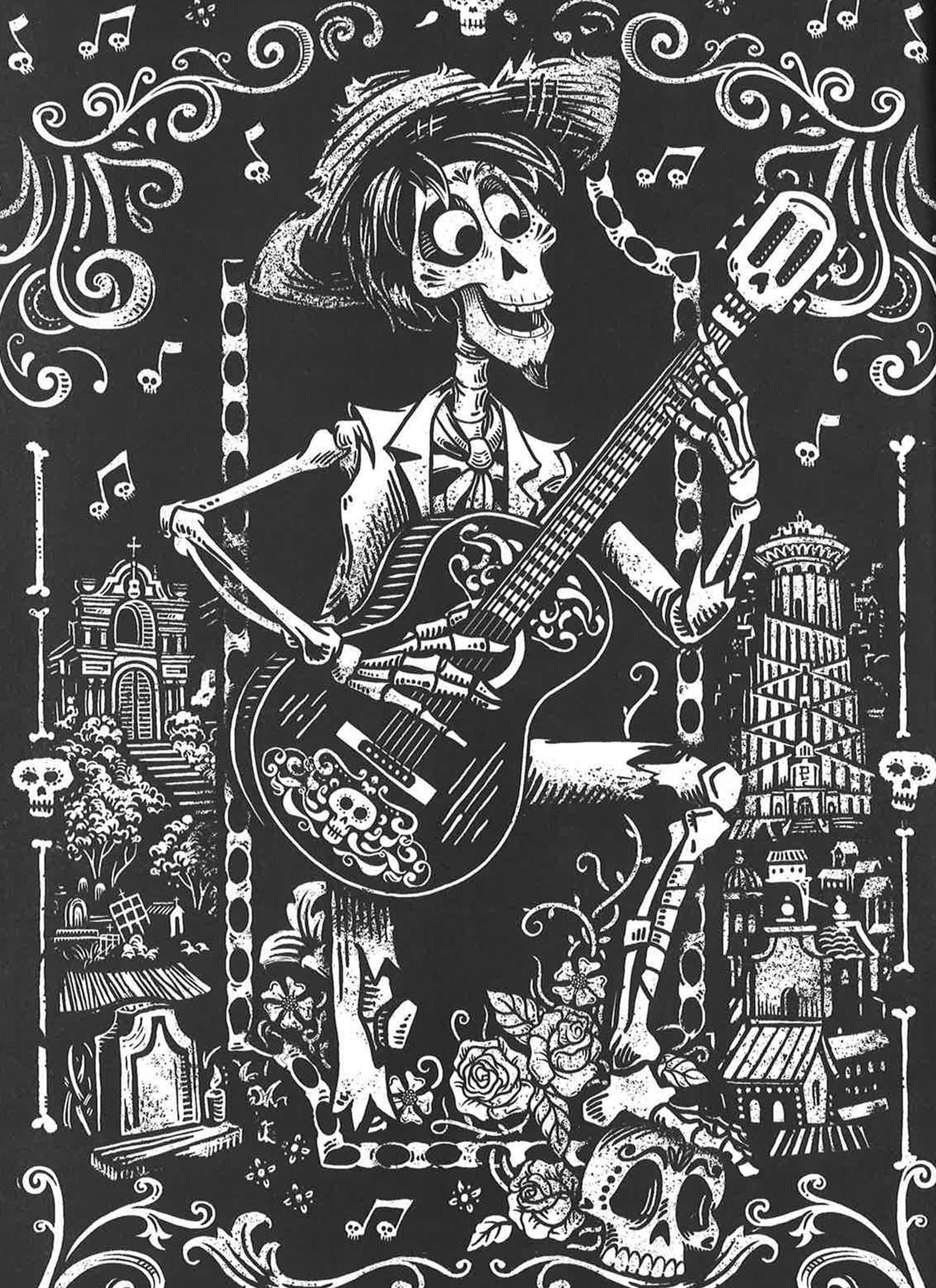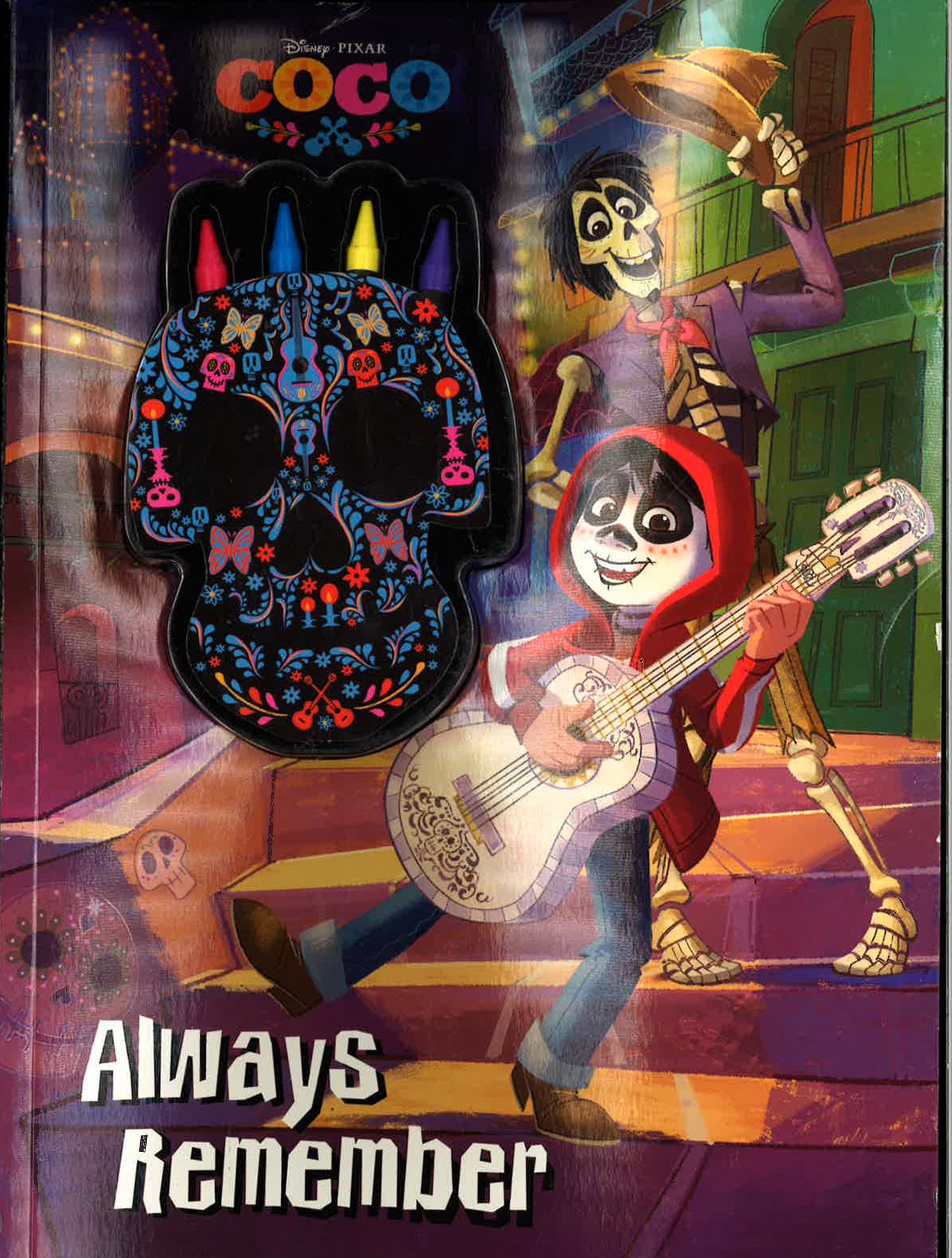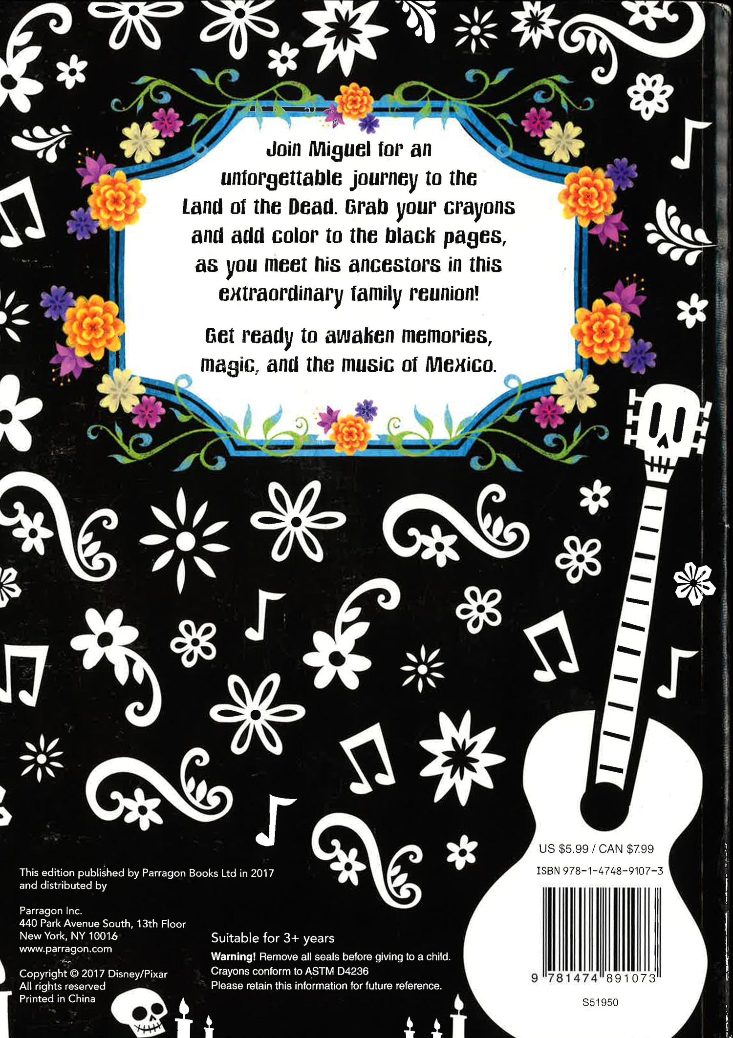 Join Miguel for an unforgettable journey to the Land of the Dead. Grab your crayons and add color to the black pages, as you meet his ancestors in this extraordinary family reunion! Get ready to awaken memories, magic, and the music of Mexico.