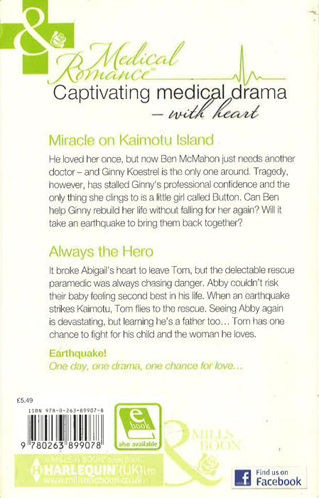 Miracle on Kaimotu Island He loved her once, but now Ben McMahon just needs another doctor - and Ginny Koestrel is the only one around. Tragedy, however, has stalled Ginny's professional confidence and the only thing she clings to is a little girl called Button. Can Ben help Ginny rebuild her life without falling for her again? Will it take an earthquake to bring them back together? Always the Hero It broke Abigail's heart to leave Tom, but the delectable rescue paramedic was always chasing danger. Abby couldn't risk their baby feeling second best in his life. When an earthquake strikes Kaimotu, Tom flies to the rescue. Seeing Abby again is devastating, but learning he's a father too... Tom has one chance to fight for his child and the woman he loves. Earthquake! One day, one drama, one chance for love... Bride's Bay Surgery