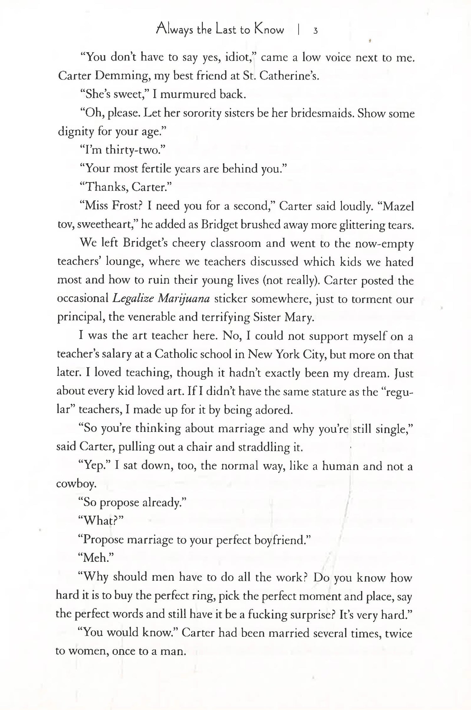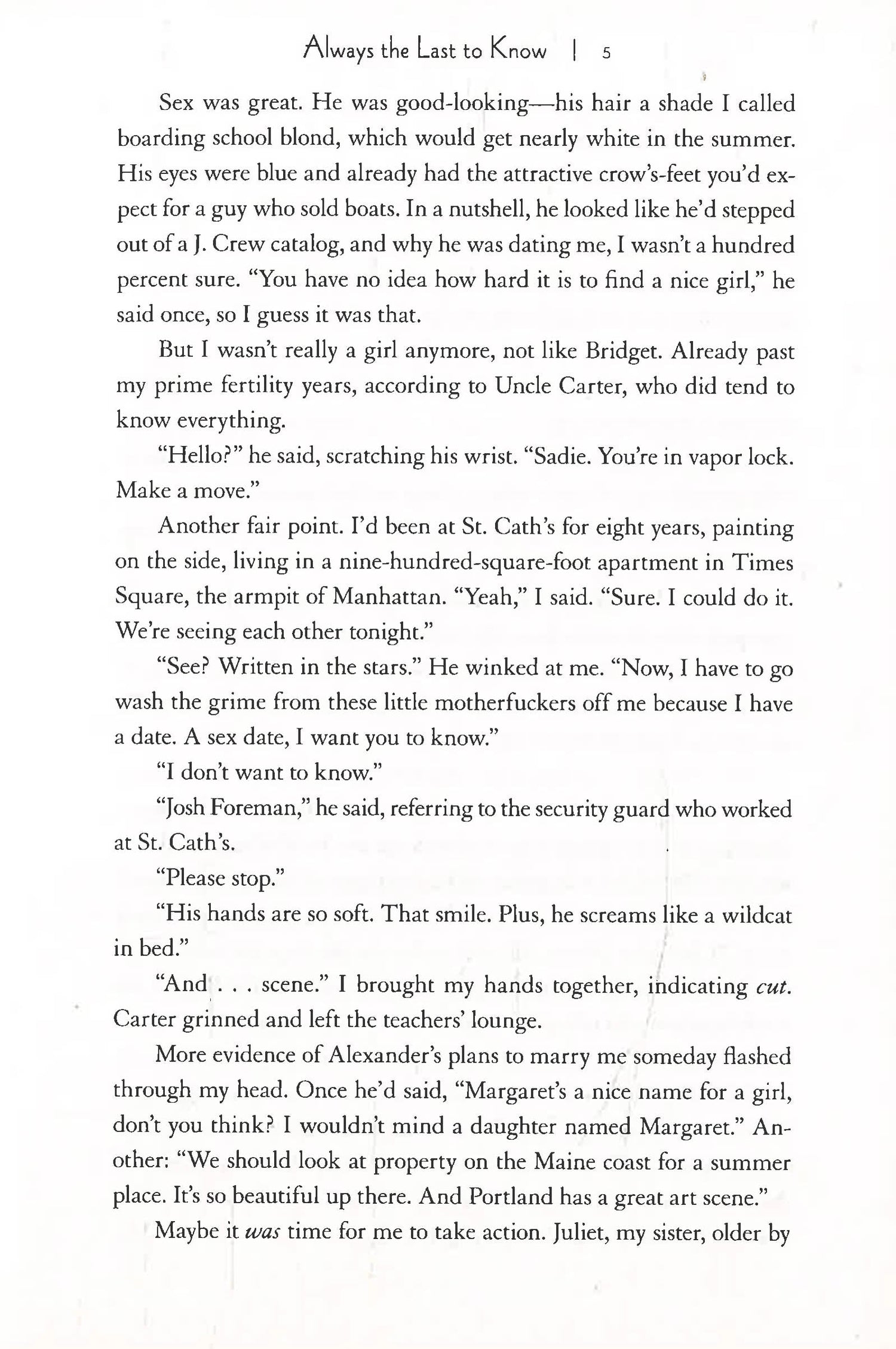 The Frosts are a typical American family. Barb and John, married almost fifty years, are testy and bored with each other...who could blame them after all this time? At least they have their daughters-- Barb's favorite, the perfect, brilliant Juliet; and John's darling, the free-spirited Sadie. The girls themselves couldn't be more different, but at least they got along, more or less. It was fine. It was enough.