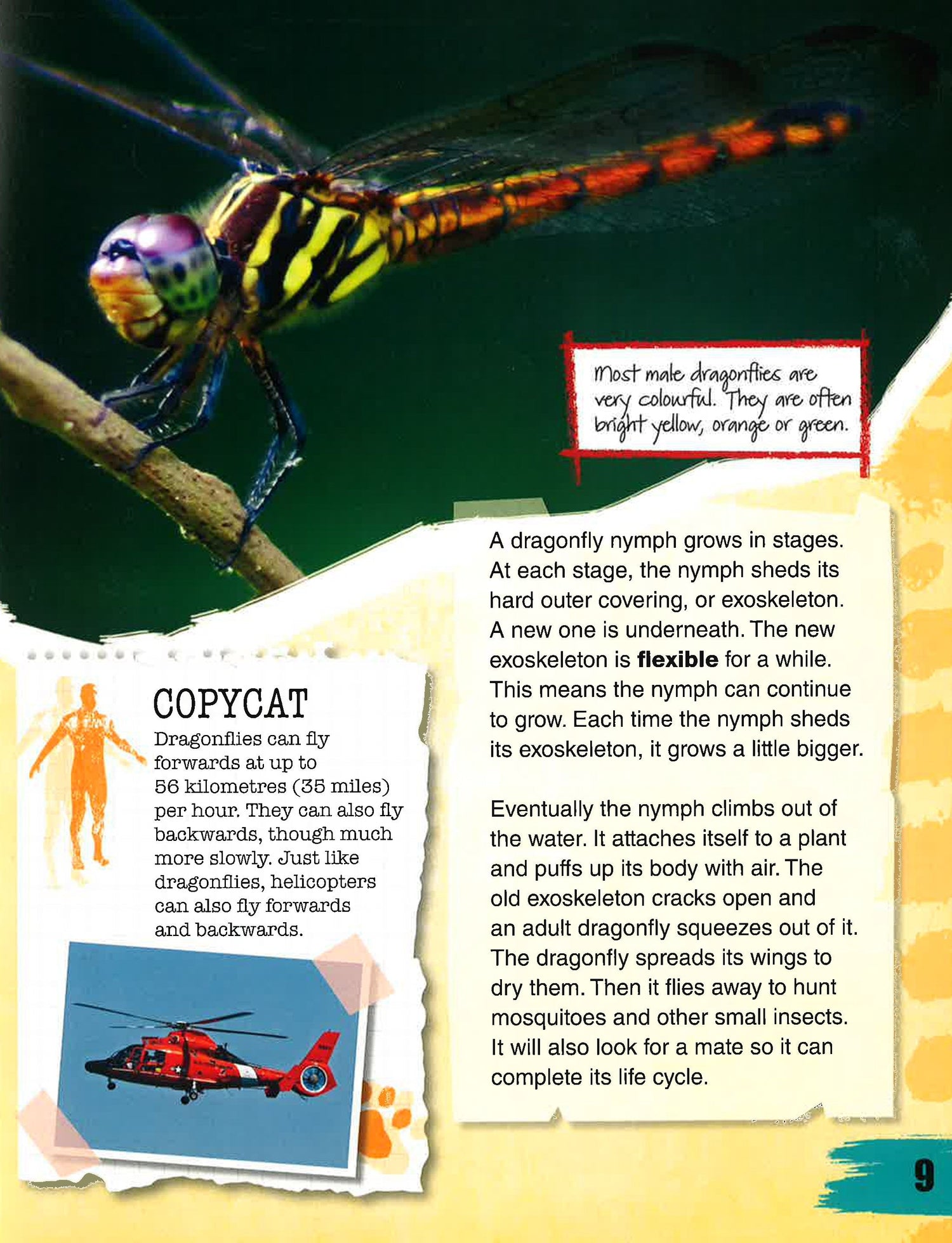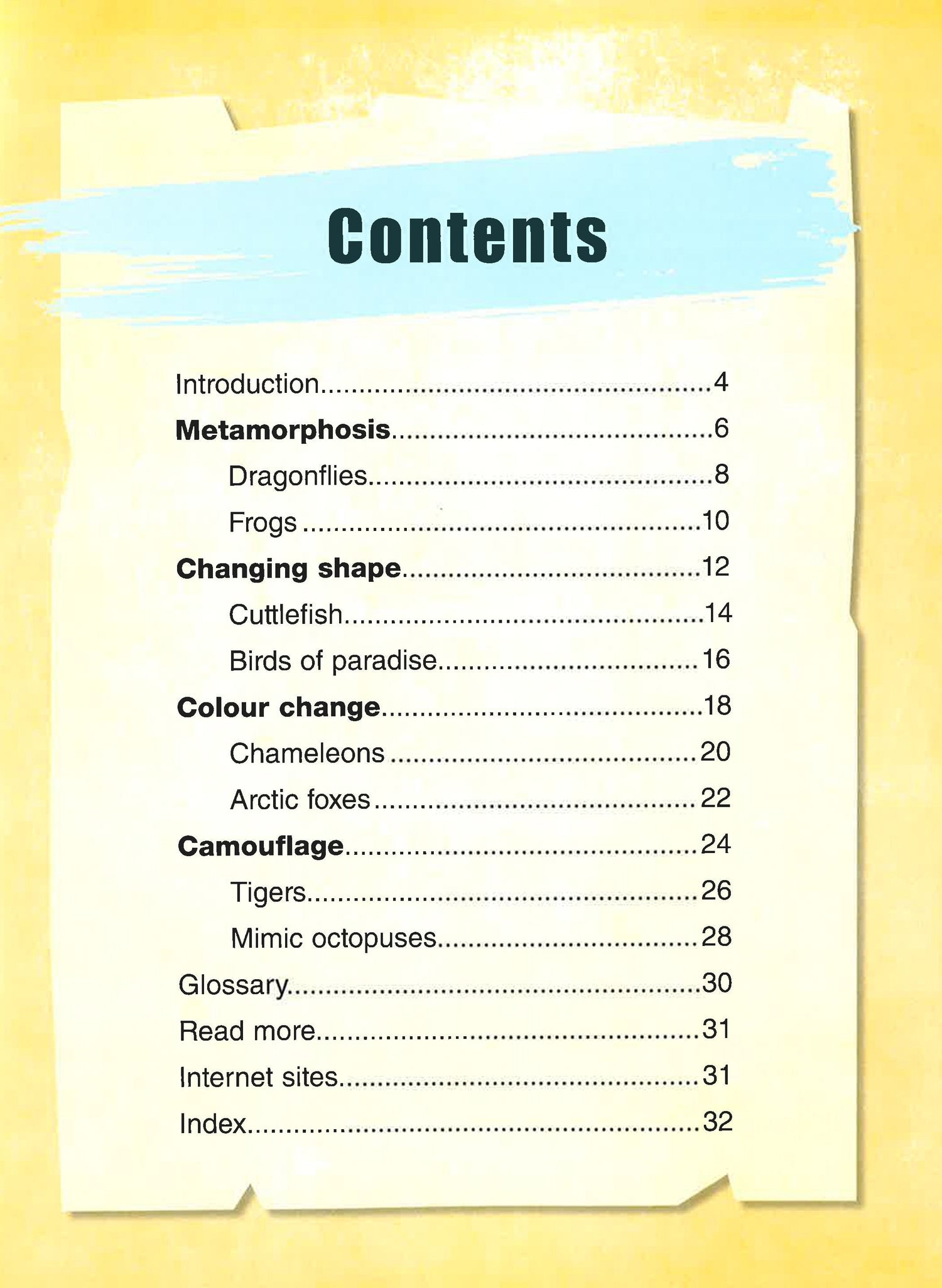 Some animals, including frogs and dragonflies, change their body to live in different environments. Others, such as chameleons, change color to blend into the background to hide from predators. Still more change their shape dramatically to attract a mate-for example, the beautiful displays of birds of paradise.