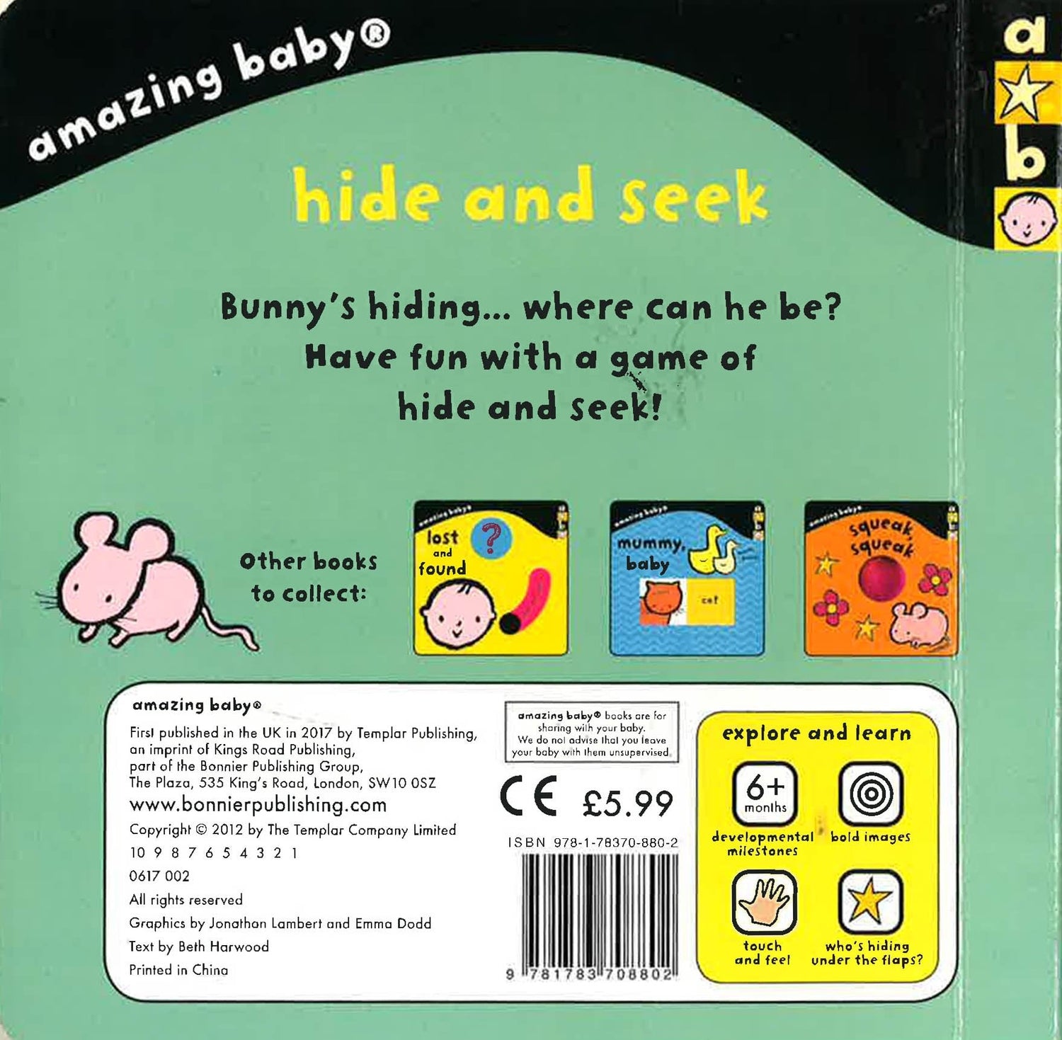 Amazing Baby board books are created in comfortable, strong trim sizes to fit growing hands, and are sure to attract a baby's attention! Hide and Seek is a lively, lift-the-flap title that encourages baby to look for a furry toy bunny.