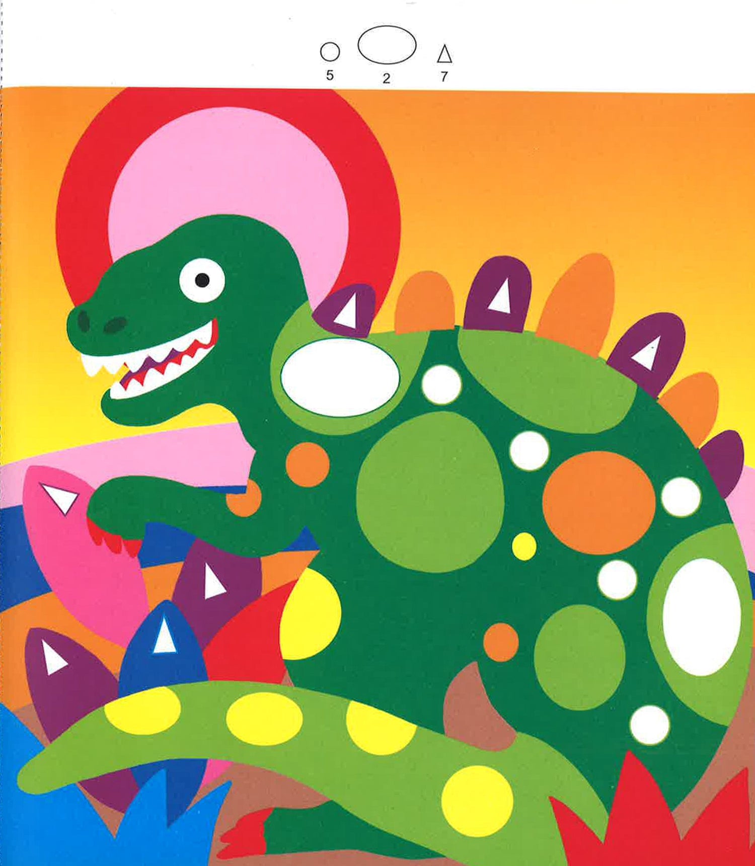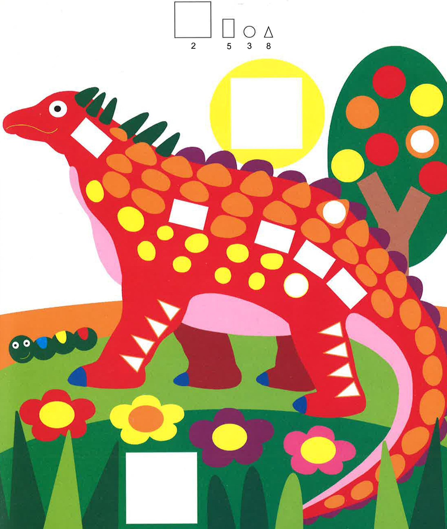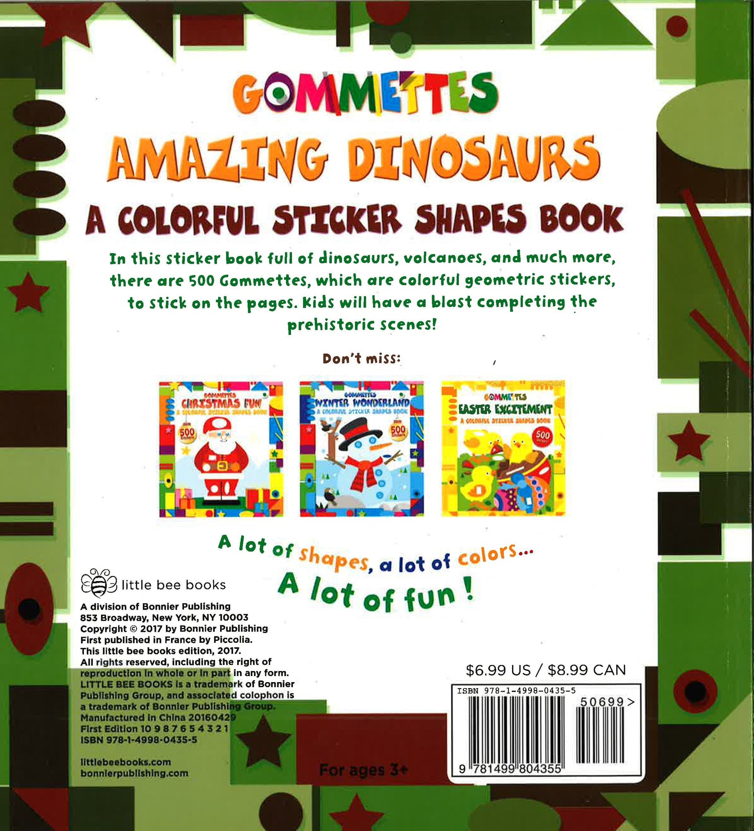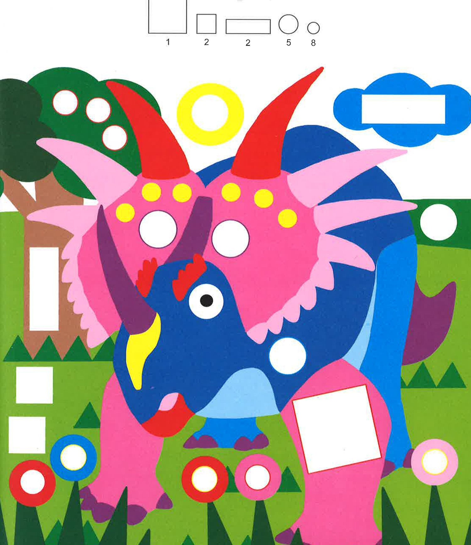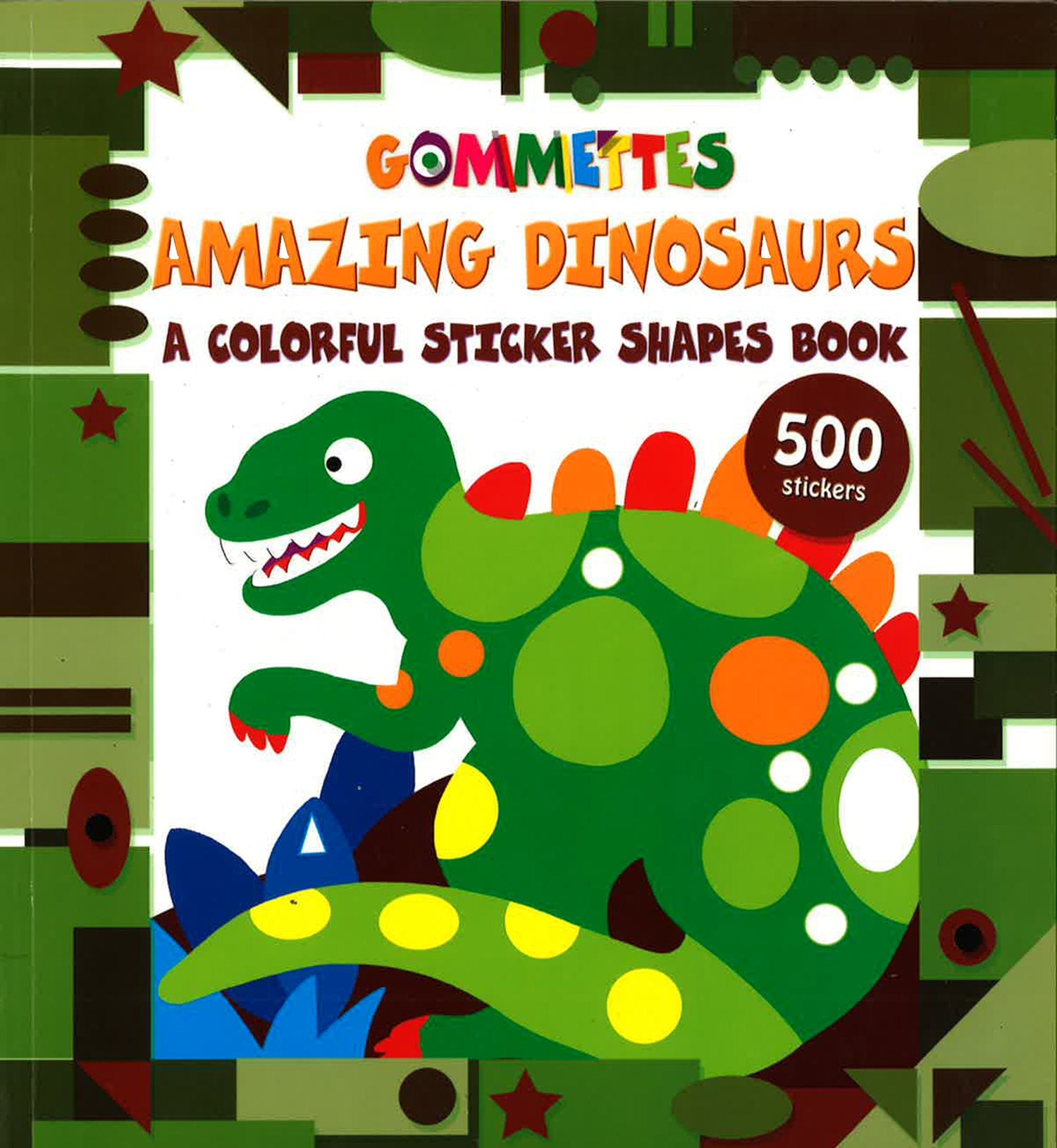 A fun dinosaur sticker book with 500 geometrically shaped stickers to place! In this dinosaur sticker book full of T. Rexes, Triceratops, Stegosauruses, and much more, there are 500 Gommettes, which are colorful geometric stickers, for small children to stick onto the pages. Each detachable page comes with a guide for which type of stickers belong on the page, creating the opportunity for children to develop fine motor skills, learn objects' locations in space, sort by color and shape, and recognize geometric shapes. Kids will have fun learning for hours!