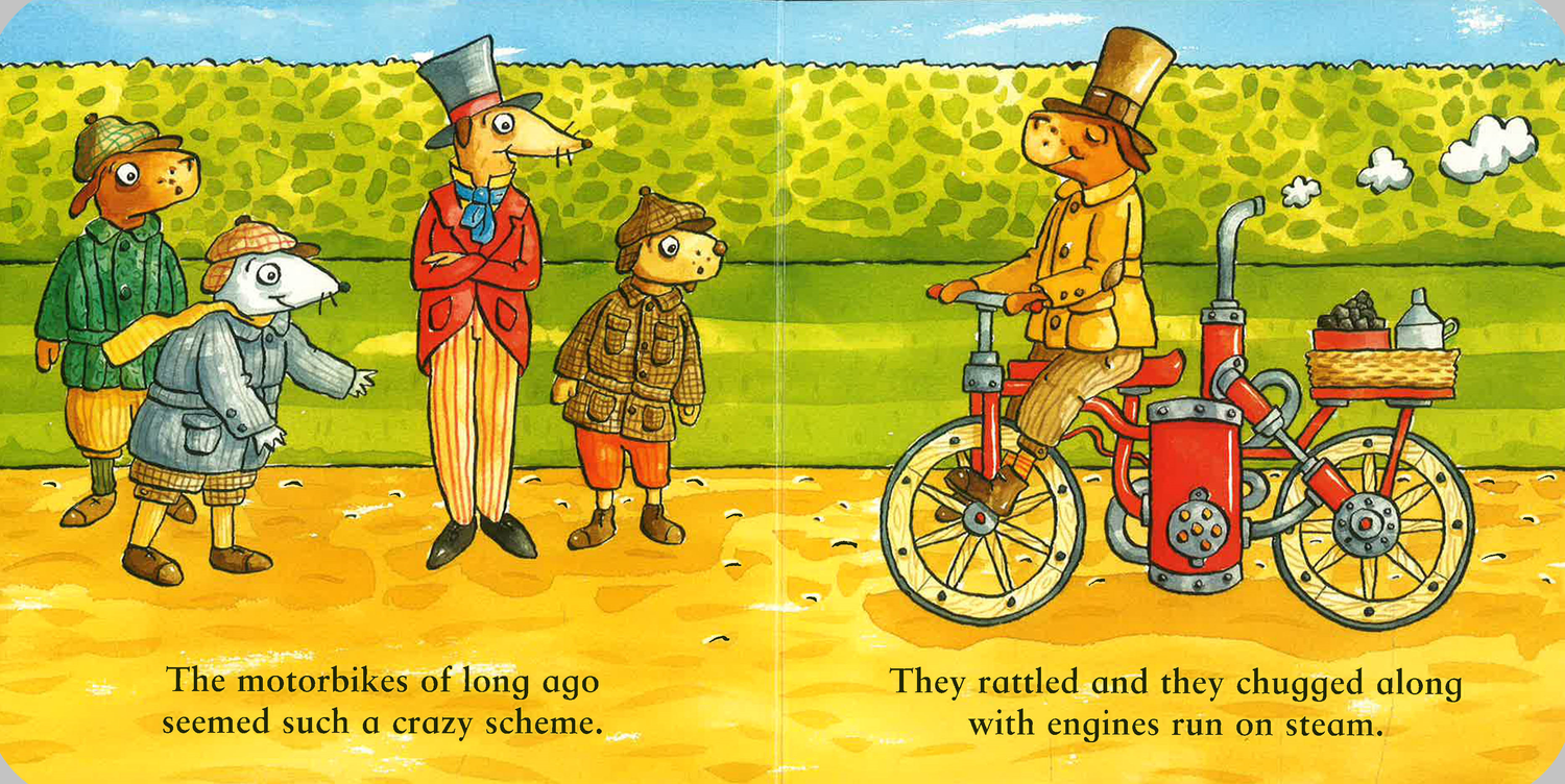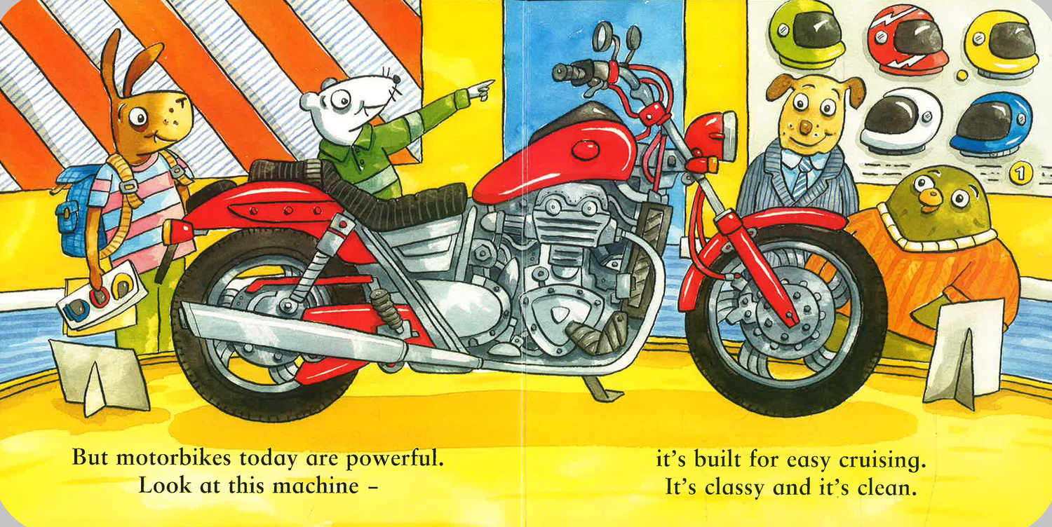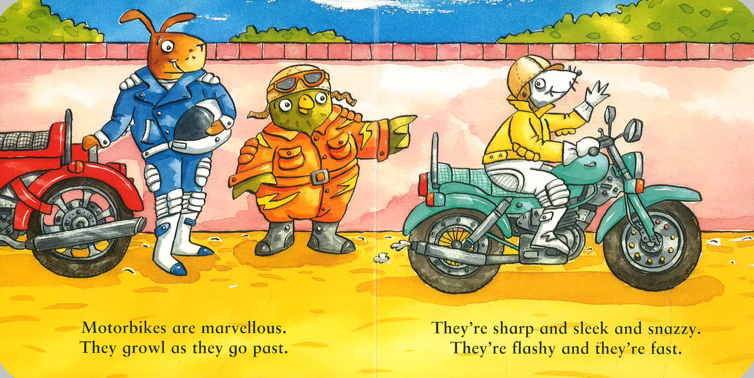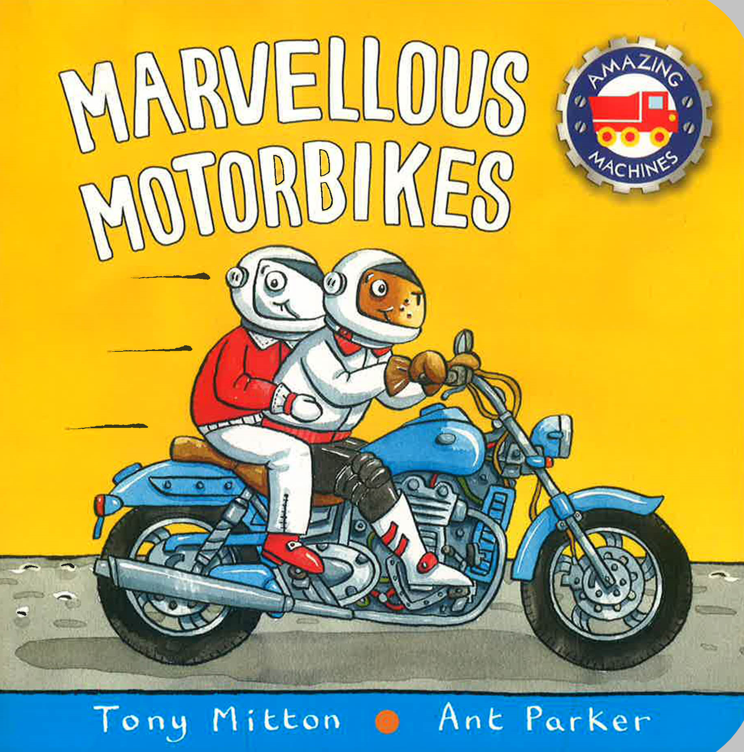Marvellous Motorbikes follows the animal gang as they become bikers cruising down the street. Join them as they learn how to ride a motorbike and what different types of motorbikes can do. Each page is filled with details that machine-mad kids will love: scooters, dirt bikes, stunt bikes, and much more!