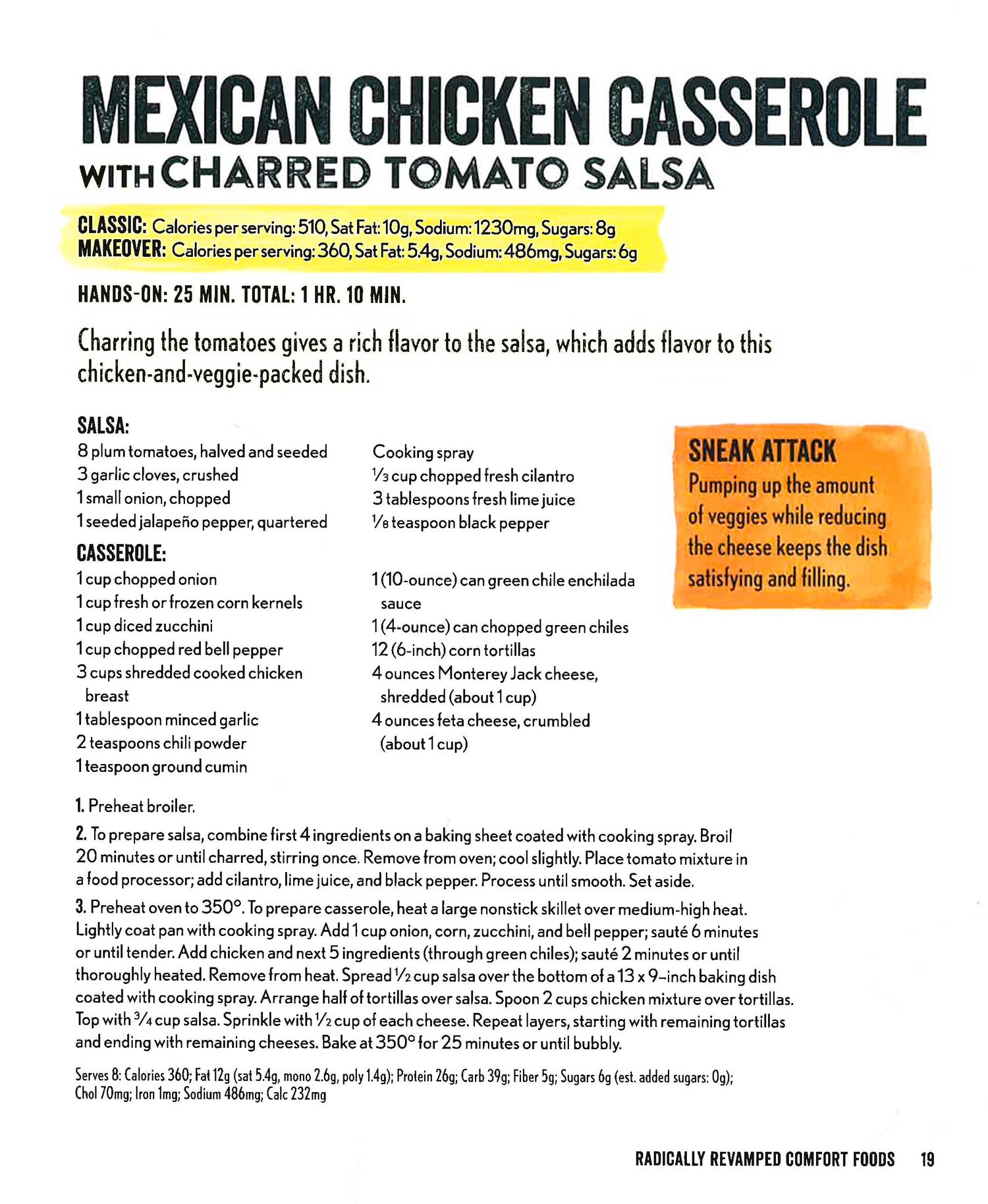 Cooking Light 's best recipes for h ealthier versions of your favorite foods! In Amazing Recipe Makeovers , the experts at Cooking Light start with deliciously decadent dishes, then reduce the calories, sodium, fat, or sugar by half. Discover 200 tested-and-perfected recipes, including: Radically Revamped Comfort Foods - Biscuit-Topped Chicken Potpie, All-American Meatloaf, breakfast and dinner casseroles, plus a standout Macaroni and Cheese recipe with three cheeses for flavor, fat-free Greek yogurt for creaminess, and panko for some crunch. Takeout Favorites - easy homemade Pad Thai, pan-seared Chimichangas, and freezer-friendly Pork and Shitake Pot Stickers to keep on hand for busy nights. Classics Takeover - one-pot Pasta Alla Carbonara, better-for-you Spinach-Bacon Quiche, French Onion Soup with a fraction of the sodium, and a fresh mozzarella-topped Eggplant Parmesan with less than 350 calories and 9g of saturated fat per serving. Less-Loaded Party Starters - baked chips, diet-smart dips including Grilled Vegetable Guacamole, and low-calorie cocktails for a crowd. Succulent Side Dishes - seasonal flavors such as Lemony Roasted Cauliflower with Breadcrumbs alongside family favorites like Twice-Baked Potatoes and Stovetop Creamed Spinach (only 25 calories per serving!). Dreamy Desserts - Gluten-Free Tiramisu, fresh Blueberry Cobbler, and irresistible 250-calorie Chocolate Molten Lava Cakes. You'll also find complete nutritional information for each recipe, full-color photographs, and Cooking Light 's time-tested tips and tricks for slimming down every meal, so you can enjoy the food you love to eat - and feel good doing so!