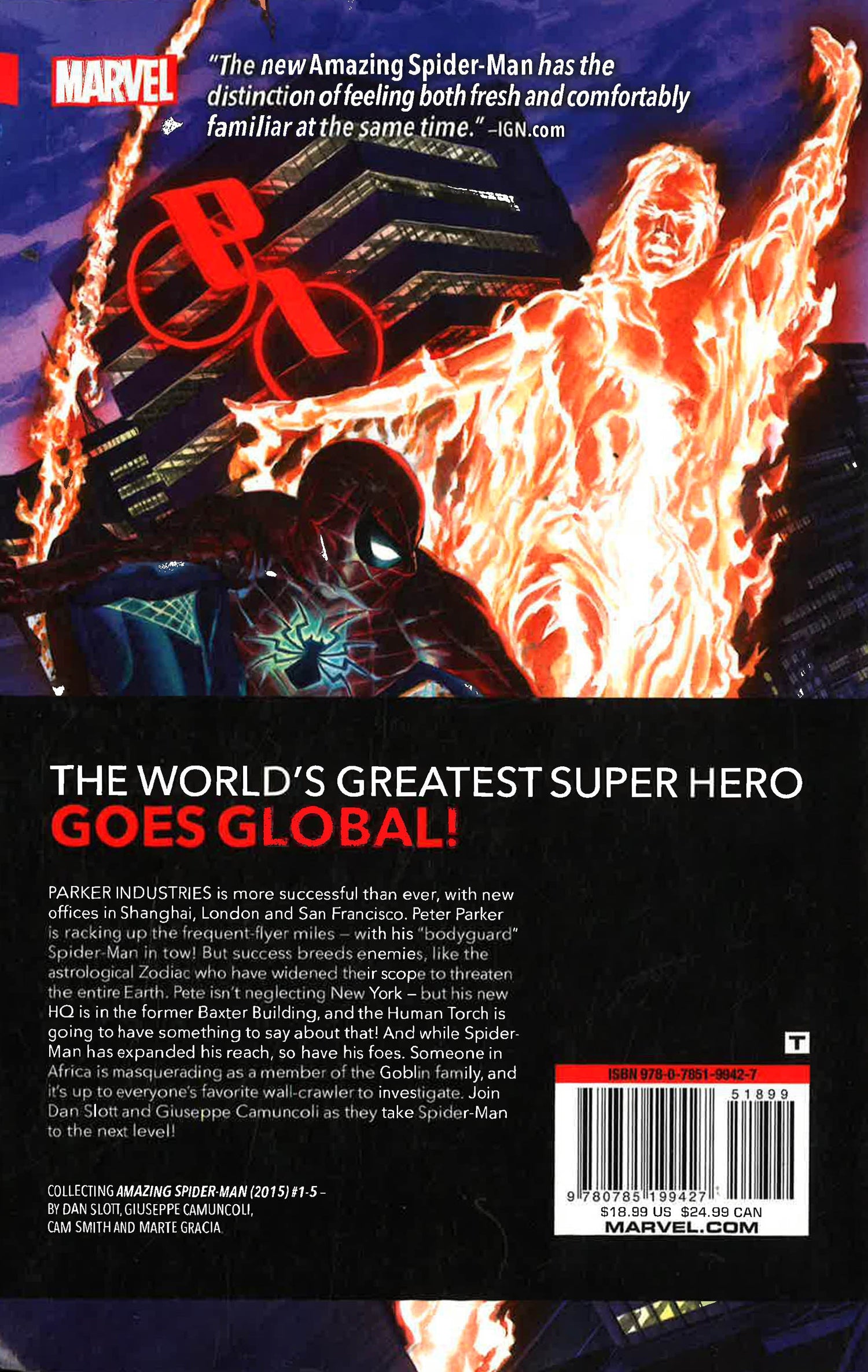 Spider-Man has gone global! Parker Industries is more successful than ever, with offi ces in New York, Shanghai, London and San Francisco and Peter Parker is racking up the frequent flyer miles with his "bodyguard" Spider-Man in tow, of course. But success breeds enemies, and a reinvigorated Zodiac has also widened its scope to threaten the whole world. Join Dan Slott and Giuseppe Camuncoli as they take Spider-Man to the next level! This huge fi rst issue also includes stories featuring Silk, Spidey 2099, Spider-Woman and much more! COLLECTING: Amazing Spider-Man 1 (minus Web-Warriors, Spider-Man 2099 stories), 2-5