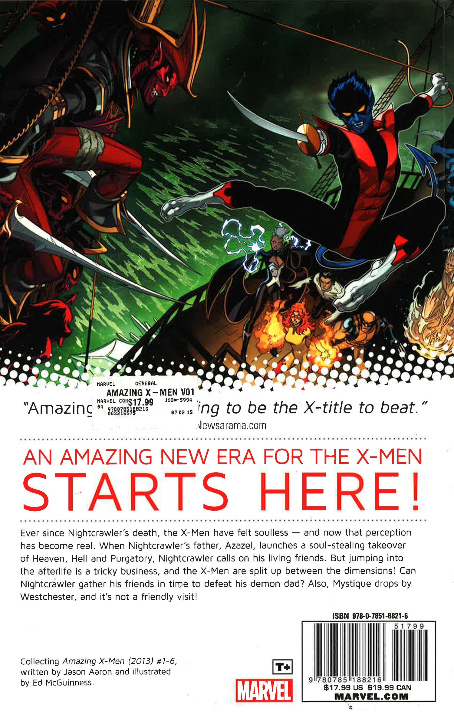 An amazing new era for the X-Men starts here, courtesy of superstar artist Ed McGuinness and master X-Writer Jason Aaron! Ever since Nightcrawler's death, the X-Men have been without their heart and soul. But after learning that their friend may not be gone after all, it's up to Wolverine, Storm, Beast, Iceman, Northstar and Firestar to find and bring back the fan-favorite fuzzy blue elf! But when the team finds themselves separated and split between heaven and hell, can they get to Nightcrawler's soul before his father, the evil Azazel, does? Pushed over the edge, the Beast gives into his savage side like never before, as Nightcrawler rallies the X-Men to take on Azazel and his hellish hordes! Can the X-Men save the afterlife, or must one of the team make the ultimate sacrifice?