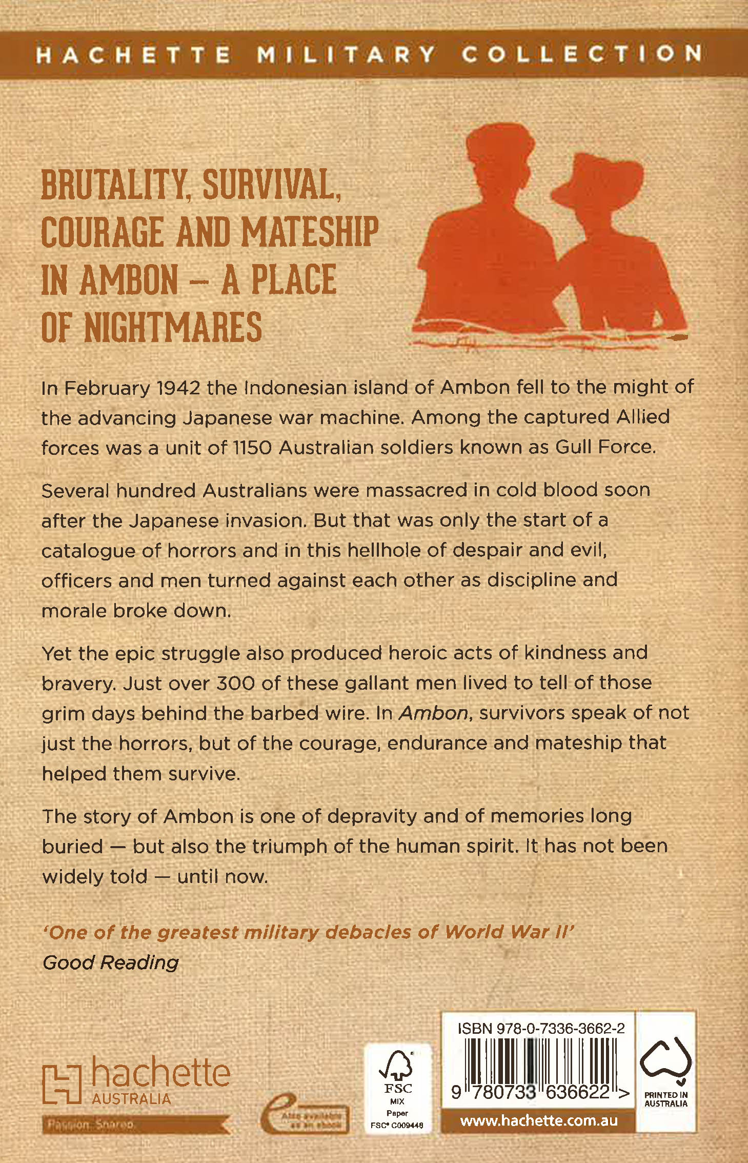 Author(s): Roger Maynard ISBN: 9780733636622 Binding: Paperback Published: 2016-08-09 'a compelling account of one of World War II's most brutal prisoner of war camps'DAILY TELEGRAPHIn February 1942 the Indonesian island of Ambon fell to the might of the advancing Japanese war machine. Among the captured Allied forces was a unit of 1150 Australian soldiers known as Gull Force, who had been sent to defend the island - a strategy doomed from the very beginning. Several hundred Australians were massacred in cold blood soon after the Japanese invasion. But that was only the start of a catalogue of horrors for the men who survived: incarcerated, beaten and often tortured by their captors, the brutality they endured lasted for the next three and a half years. And in this hellhole of despair and evil, officers and men turned against each other as discipline and morale broke down. Yet the epic struggle also produced heroic acts of kindness and bravery. Just over 300 of these gallant men lived to tell of those grim days behind the barbed wire. In AMBON, survivors speak of not just the horrors, but of the courage, endurance and mateship that helped them survive. The story of AMBON is one of depravity and of memories long buried - but also the triumph of the human spirit. Now part of the HACHETTE MILITARY COLLECTION.